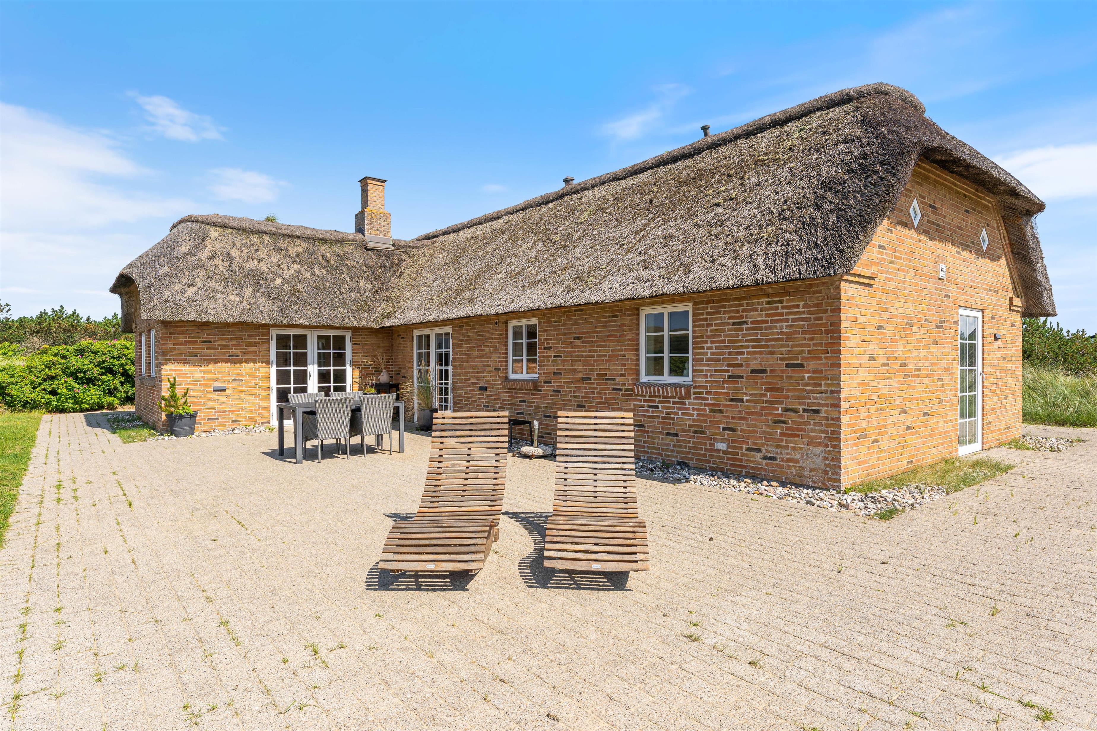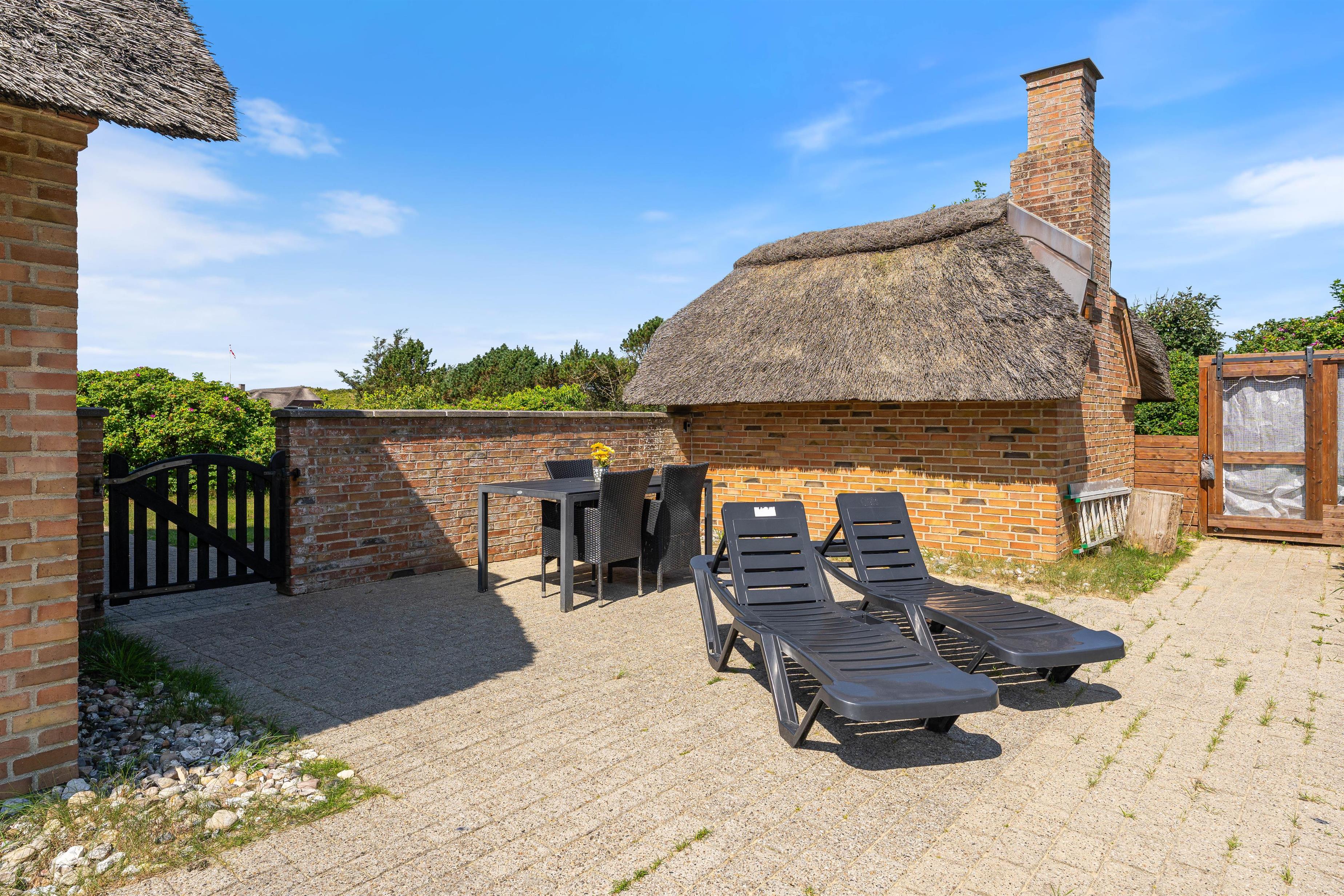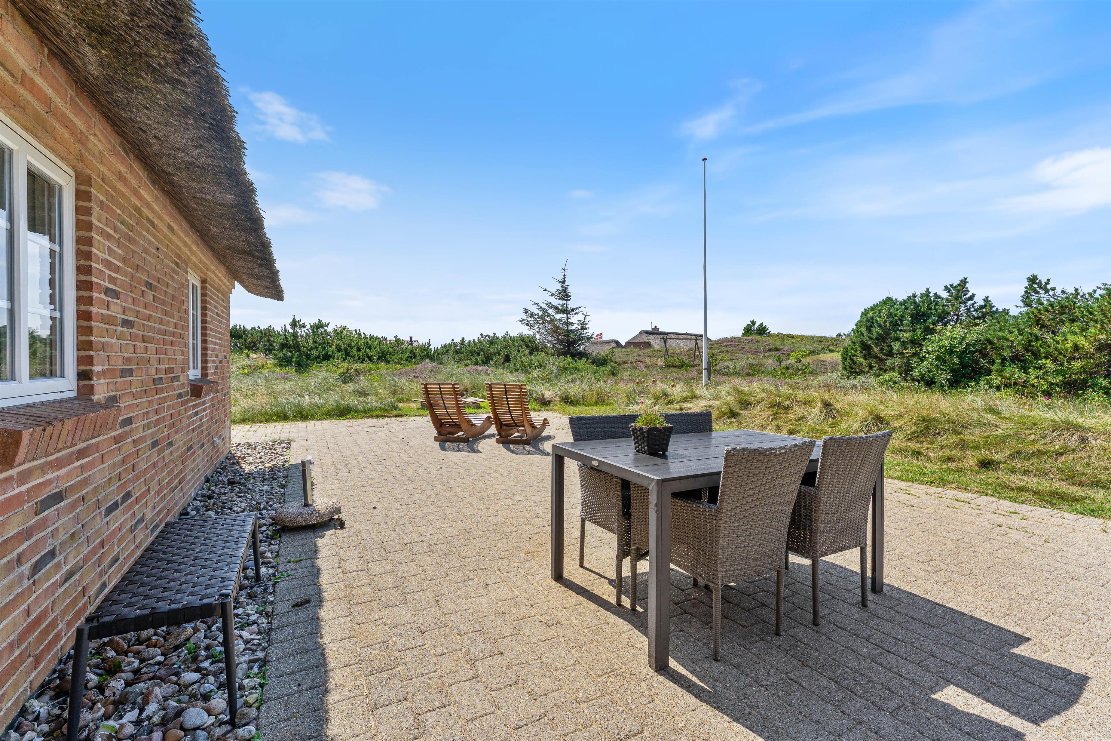 Tilhørende sommerhuset er en rummelig flisebelagt terrasse. Her er der en direkte udsigt til det skønne sommerhusområde og smukke hedelandskab. Derudover er sommerhuset omringet af en smuk naturgrund dækket af lyng og marehalm. Her kan I nyde vejret i liggestolene eller havemøblerne i selskab med et lækkert grillmåltid. Desuden er der her også plads til børnene - der er nemlig en sandkasse, som de kan underholdes med.