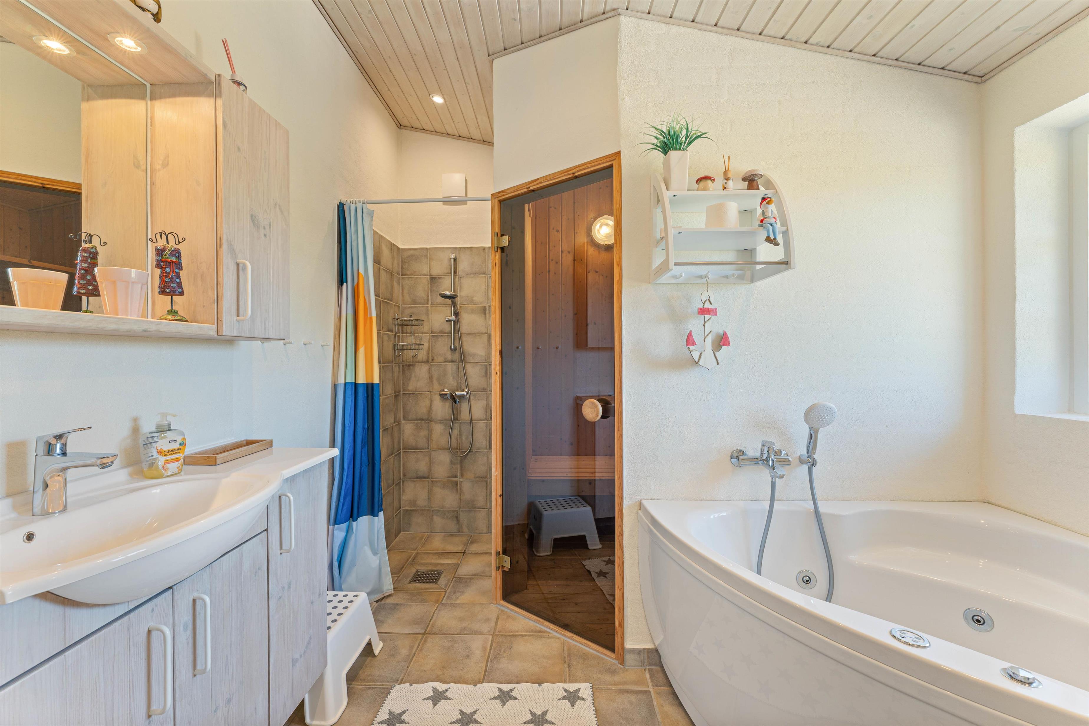 Som en ekstra bonus er der både sauna og spabad på det ene af de to badeværelser. Her kan I slappe helt af og nyde varmen fra vandet efterfulgt af en tur i saunaen. Dette er ekstra skønt i vintermånederne efter en lang kølig gåtur til stranden. Desuden er der gulvvarme på badeværelserne.