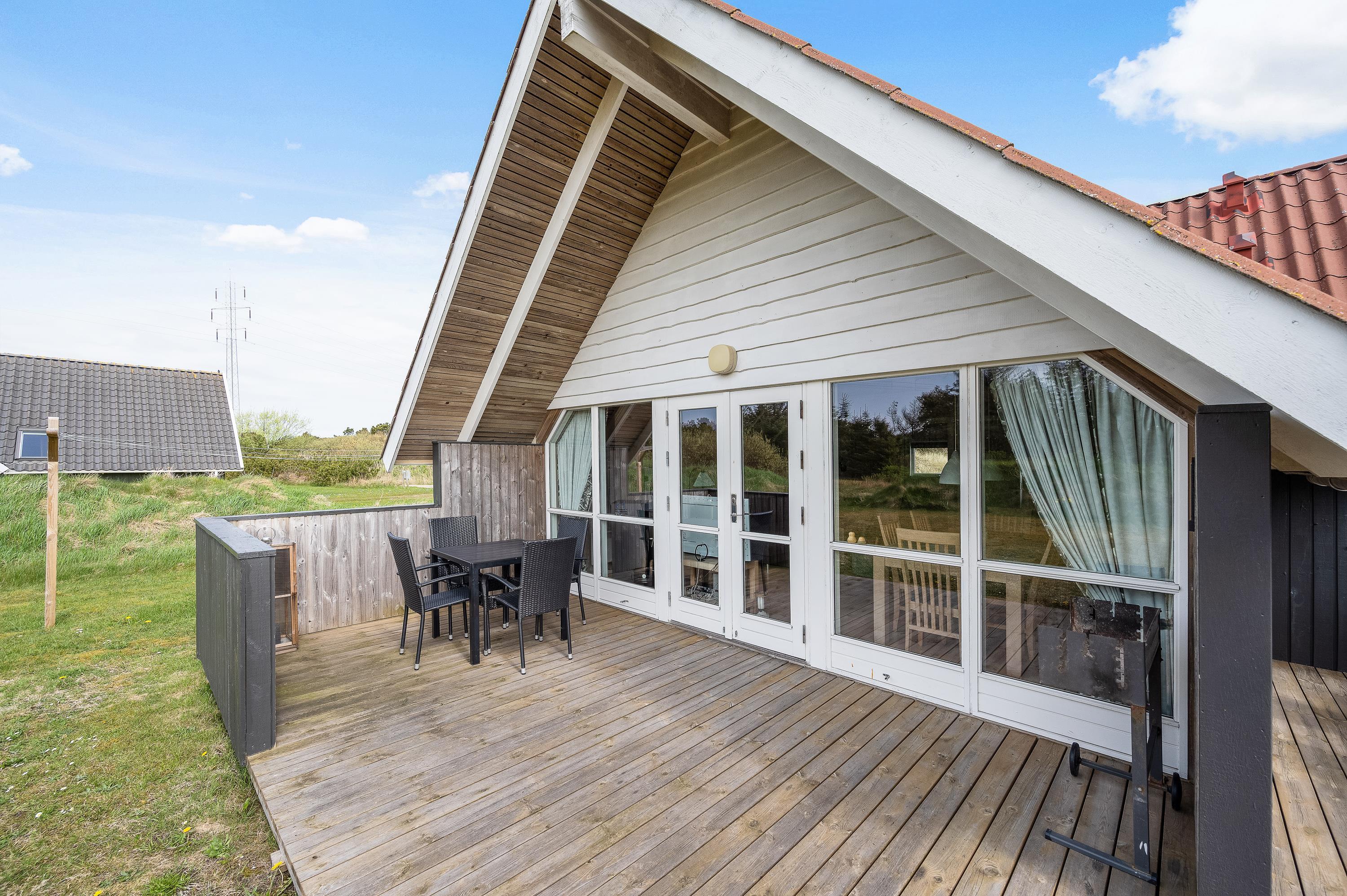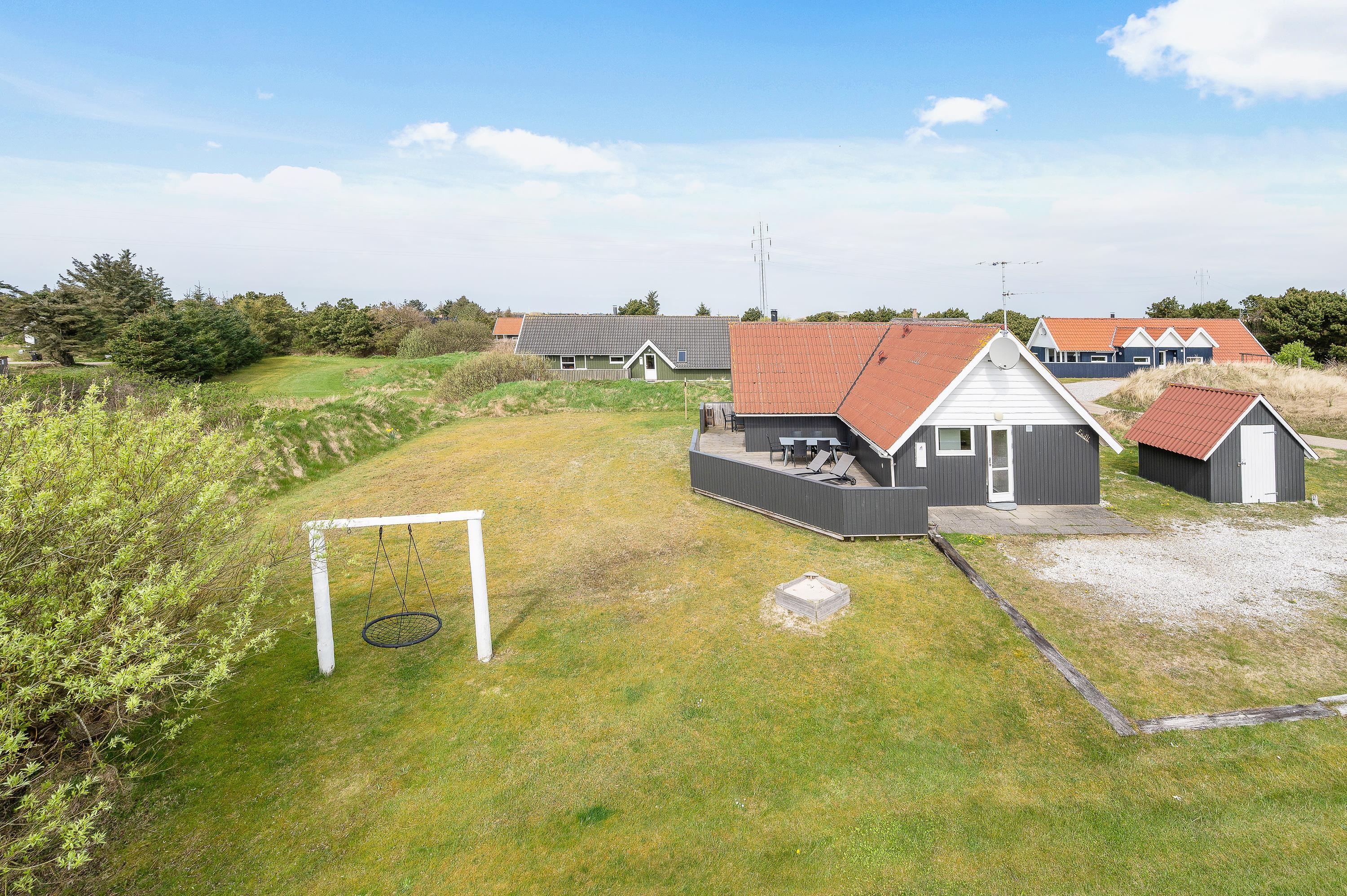Den delvist overdækkede terrasse byder på et skønt læhjørne, hvor der kan slikkes sol og om aften tændes op i grillen, imens de mindste tager en sidste tur på sommerhusets gynge.