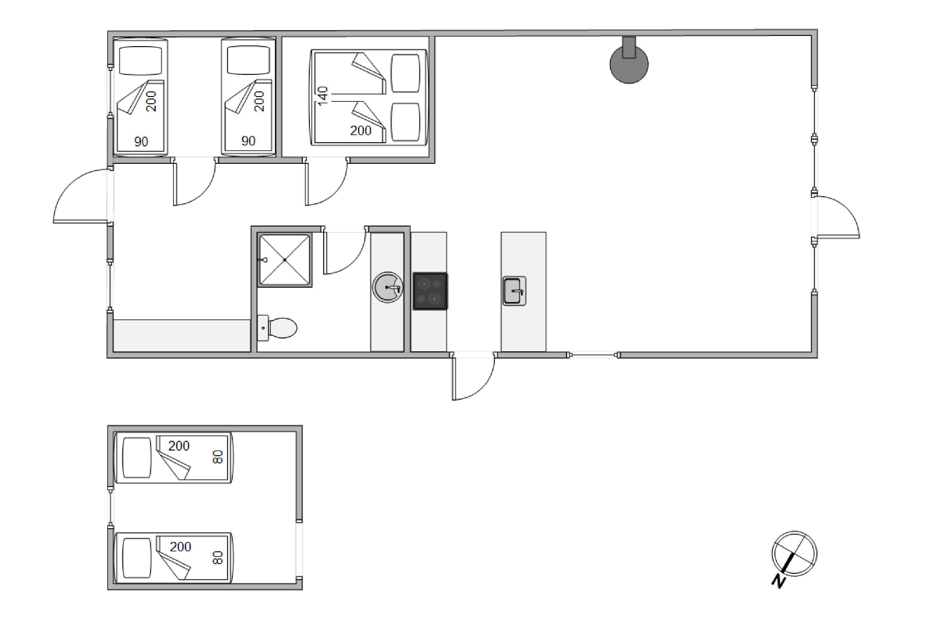 I sommerhuset kommer I uden tvivl til at tilbringe mange hyggelige feriestunder i alrummet, hvor køkken, stue og spisestue er forenet i ét rum. I alrummet sørger brændeovnen for at sprede god stemning og dejlig varme. Desuden er der en energivenlig varmepumpe i sommerhuset, der sikrer jer et godt indeklima på ferien.