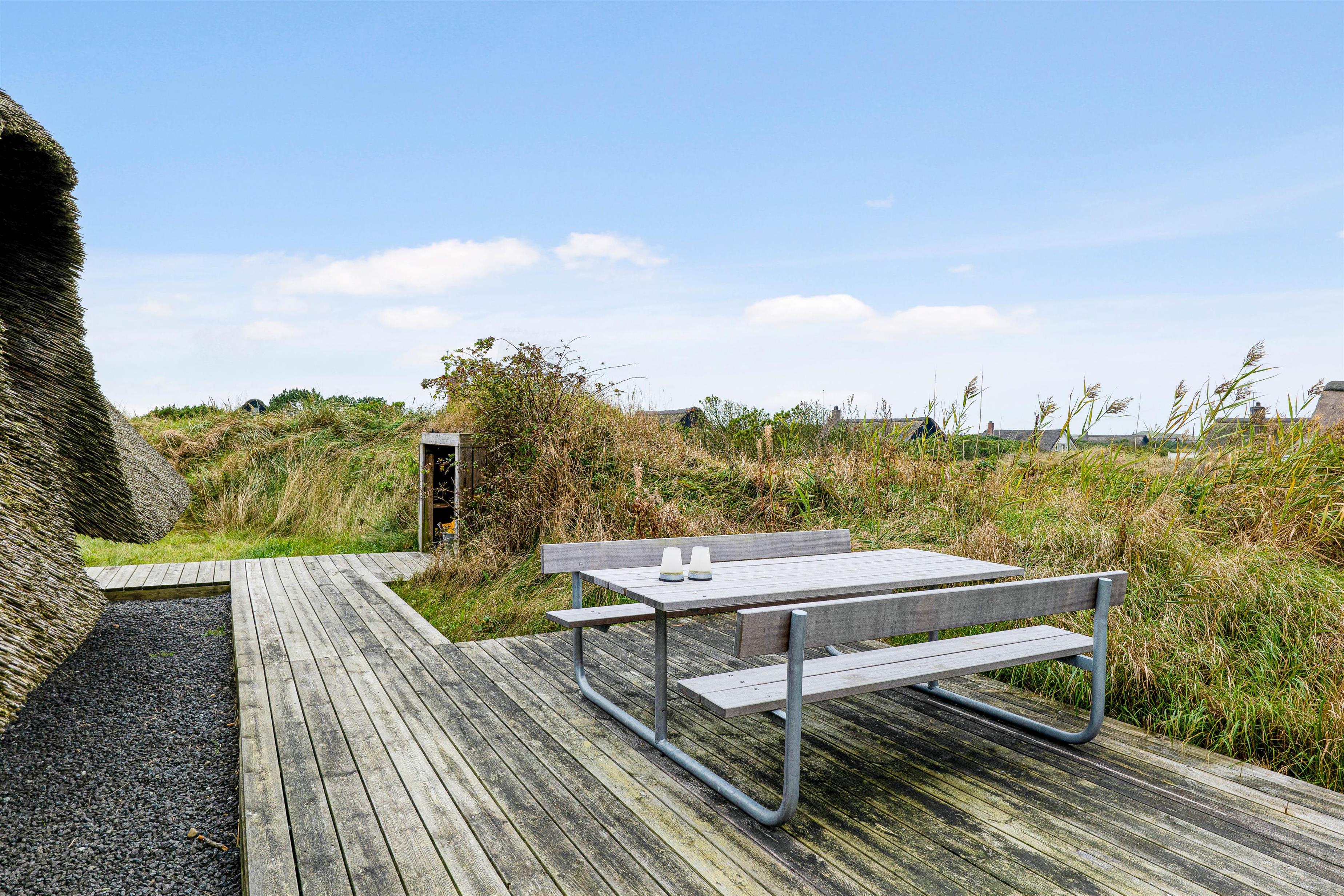 Omkring det meste af sommerhuset løber en træterrasse, hvor I vil kunne finde jer en god plads at nyde de varme og solrige feriedage fra. På terrassen står der både havemøbler og liggestole til jer, som I kan finde jer godt til rette i. Terrassen er delvist overdækket og afskærmet, så her har I mulighed for at sidde i ly og læ.