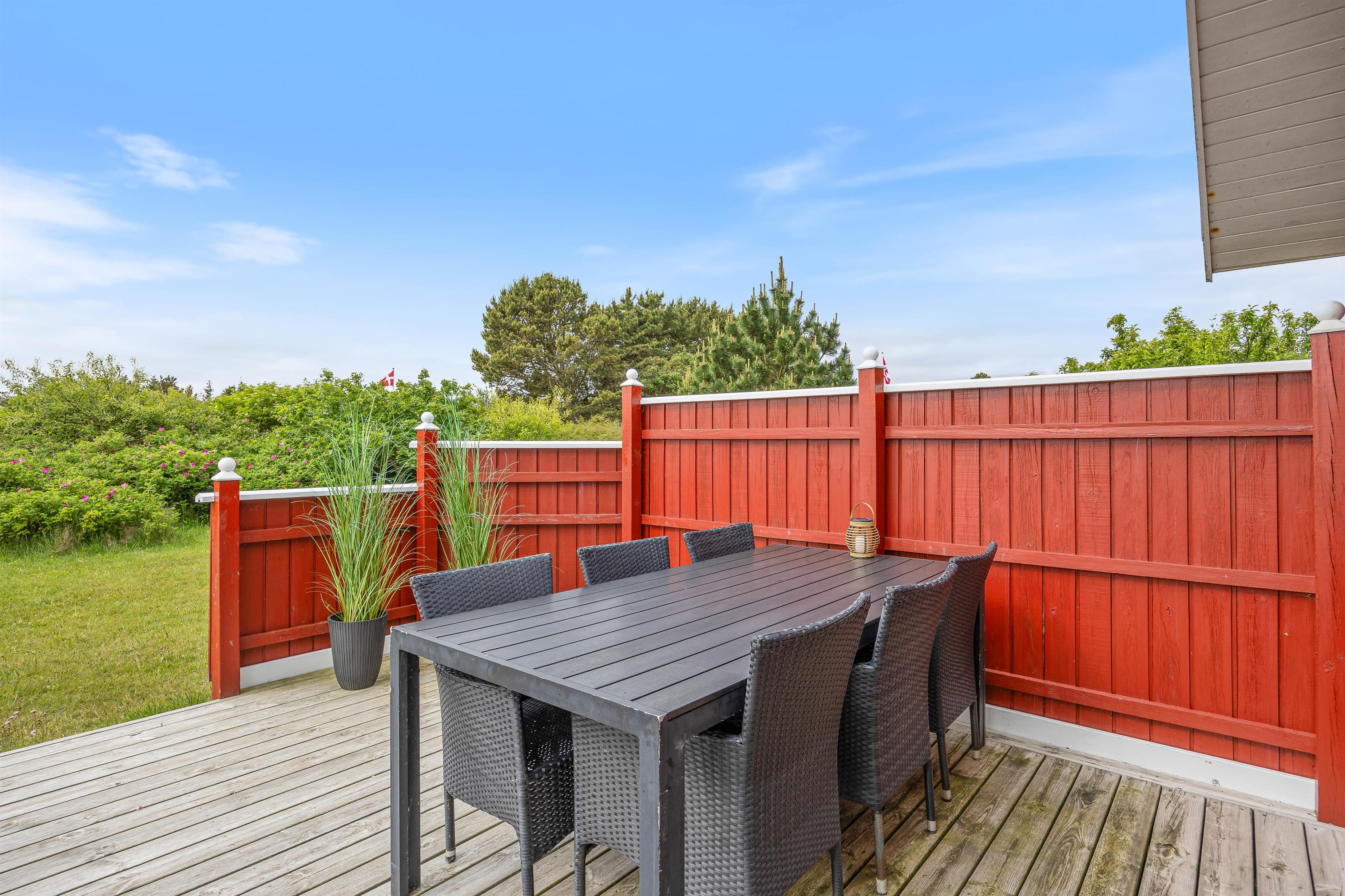 På enhver solskinsdag står sommerhusets sydvendte terrasse til rådighed. Her finder du et terrassebord med tilhørende stole til, hvor der er plads til hele familien. Her kan I nyde et lækkert måltid mad fra sommerhusets grill, hvilket giver en perfekt feriestemning.