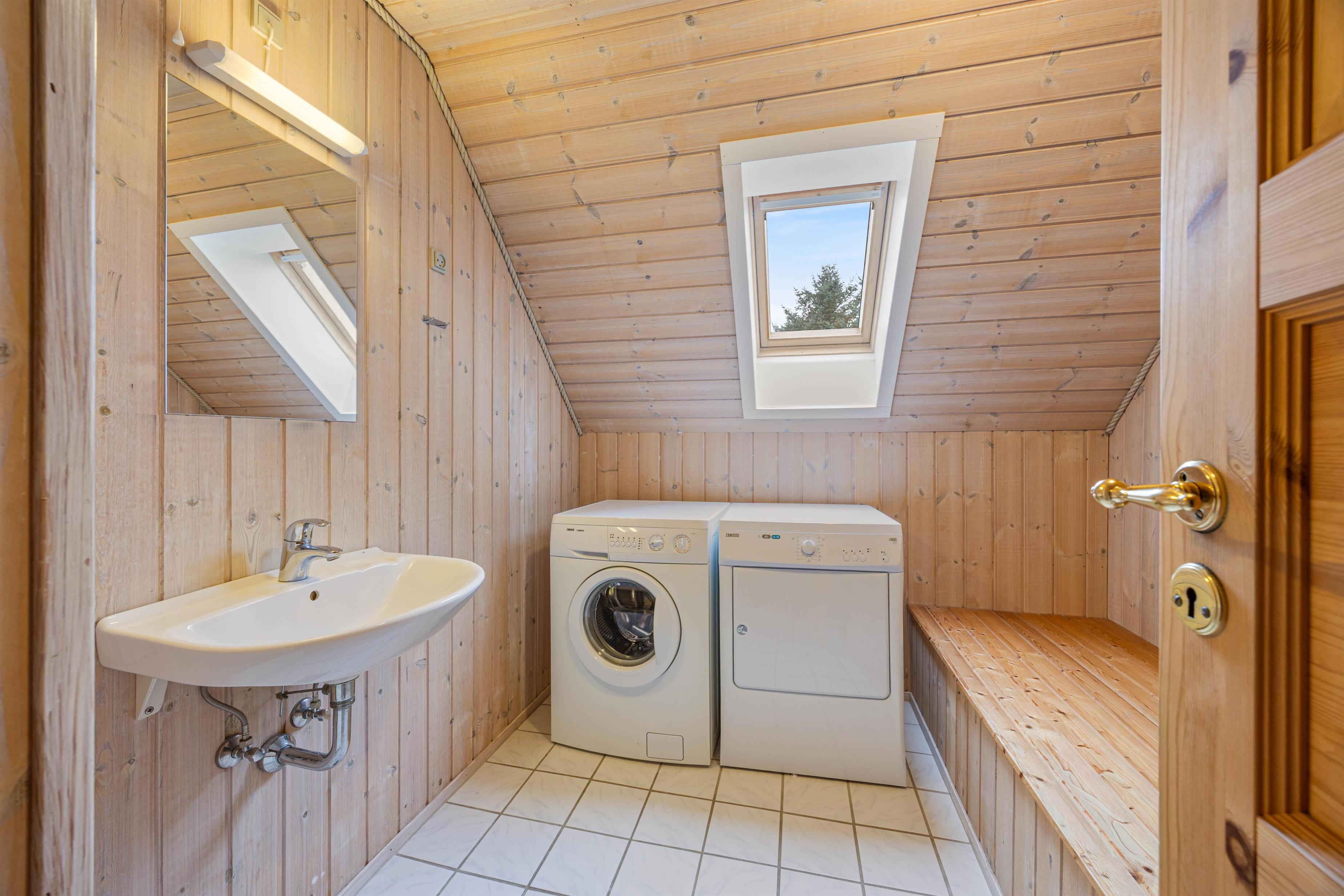 Der er også tænkt på det praktiske i huset. Med 2 badeværelser (med gulvvarme) slipper I for lange køer til badet om morgenen, og vaskemaskinen og tørretumbleren er en god hjælp på vejen med de huslige pligter. I køkkenet er der desuden en opvaskemaskine, så I ikke skal bruge for lang tid på at rydde op efter aftensmaden.