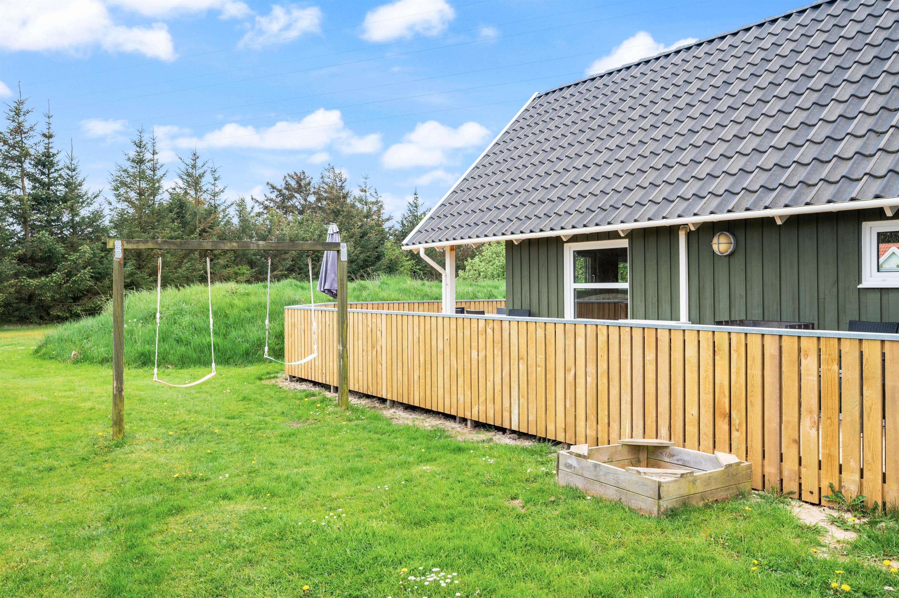 Lukket, delvist overdækket terrasse, gynge og sandkasse