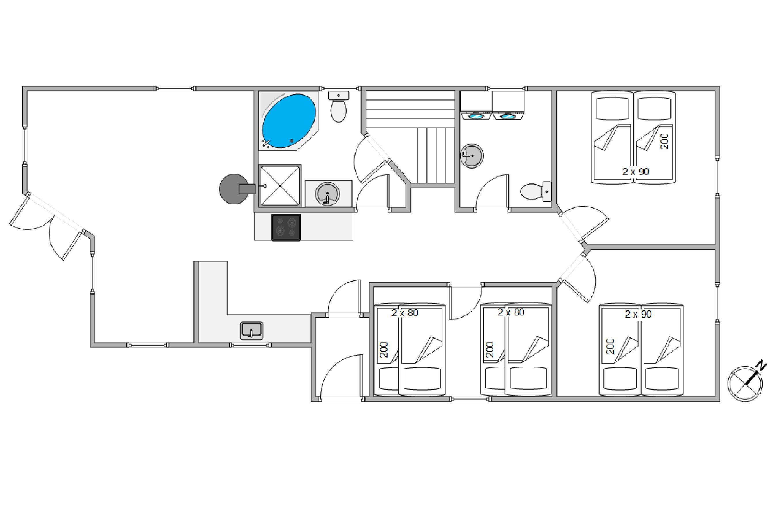 Sommerhuset indeholder i alt 8 sovepladser fordelt på 3 gode soveværelser. Det ene værelse er udstyret med 2 køjesenge - og mon ikke børnene vil elske at sove her?