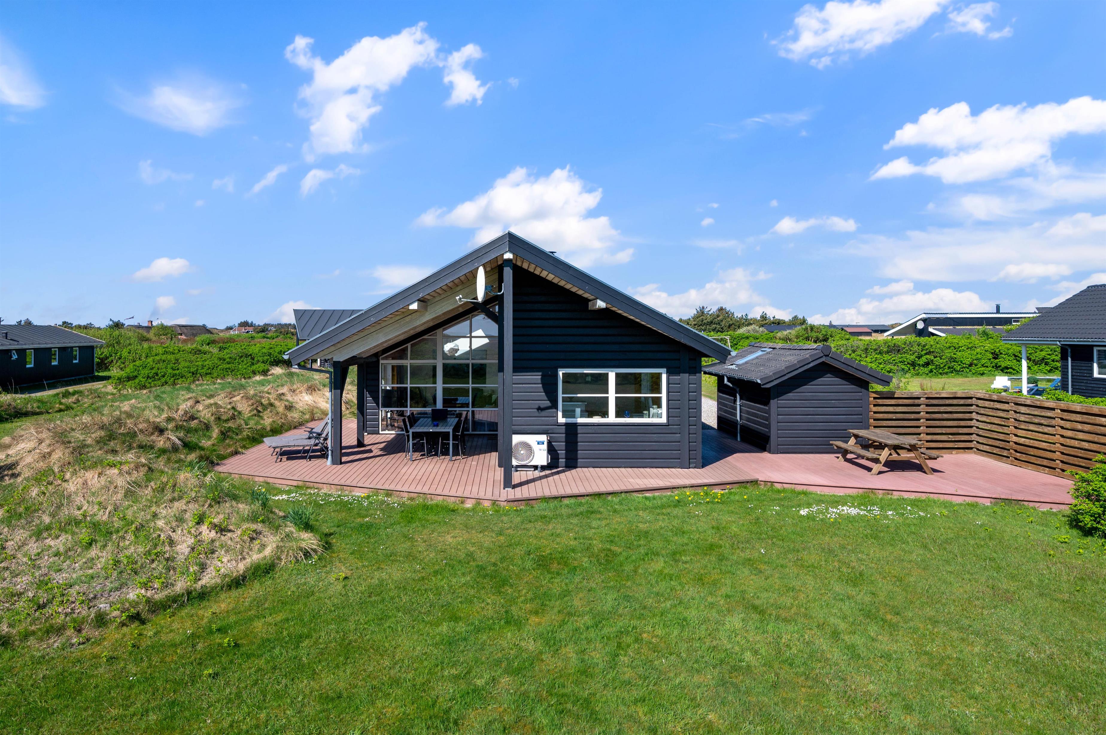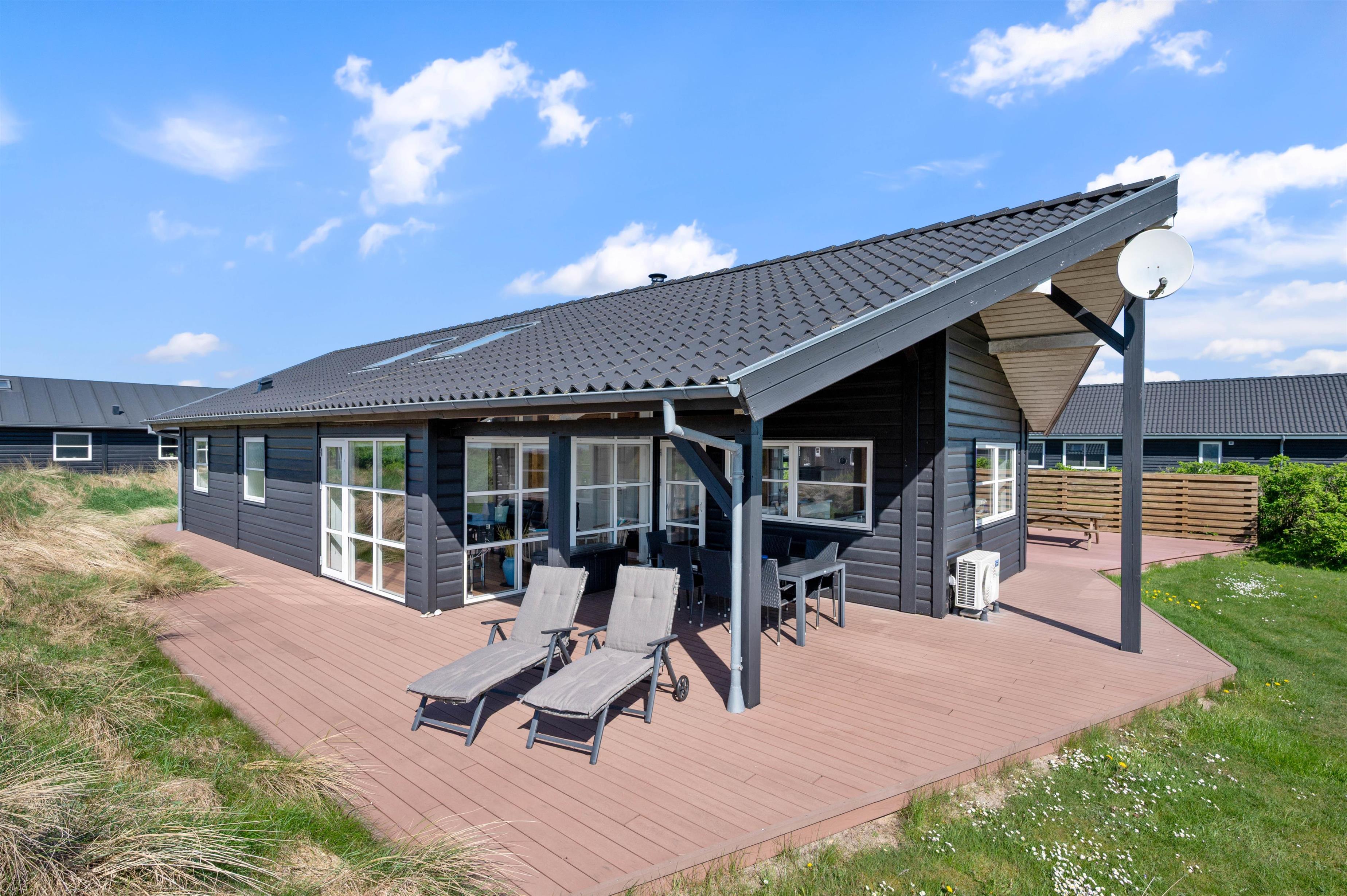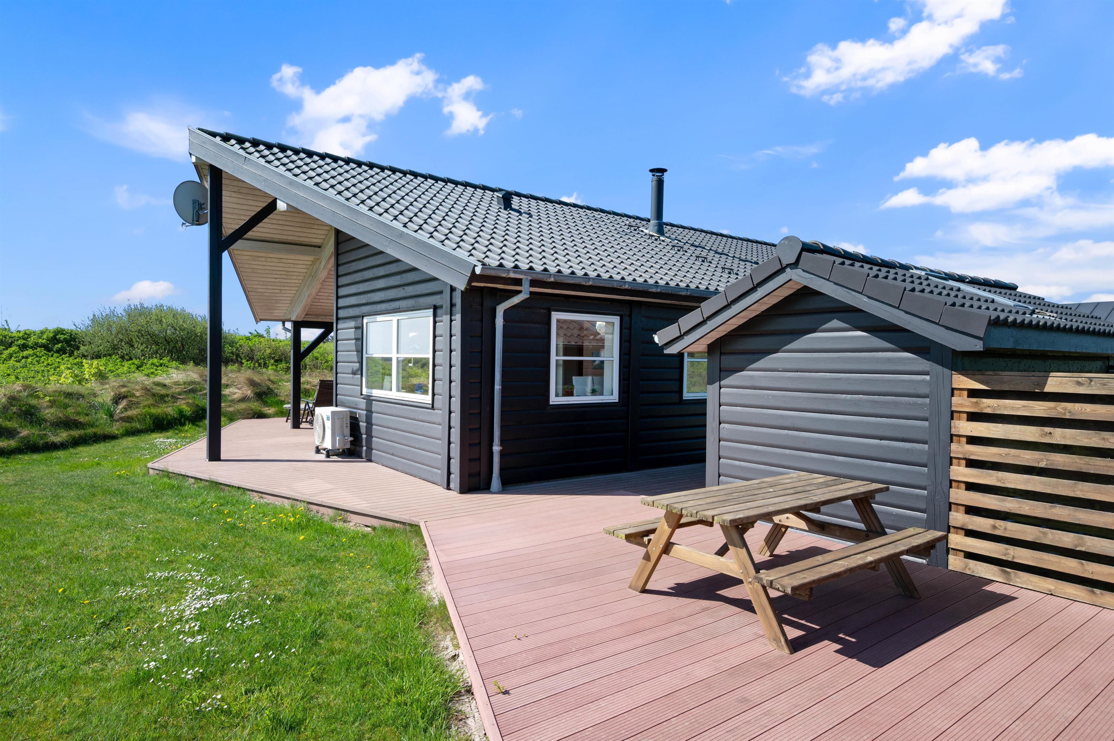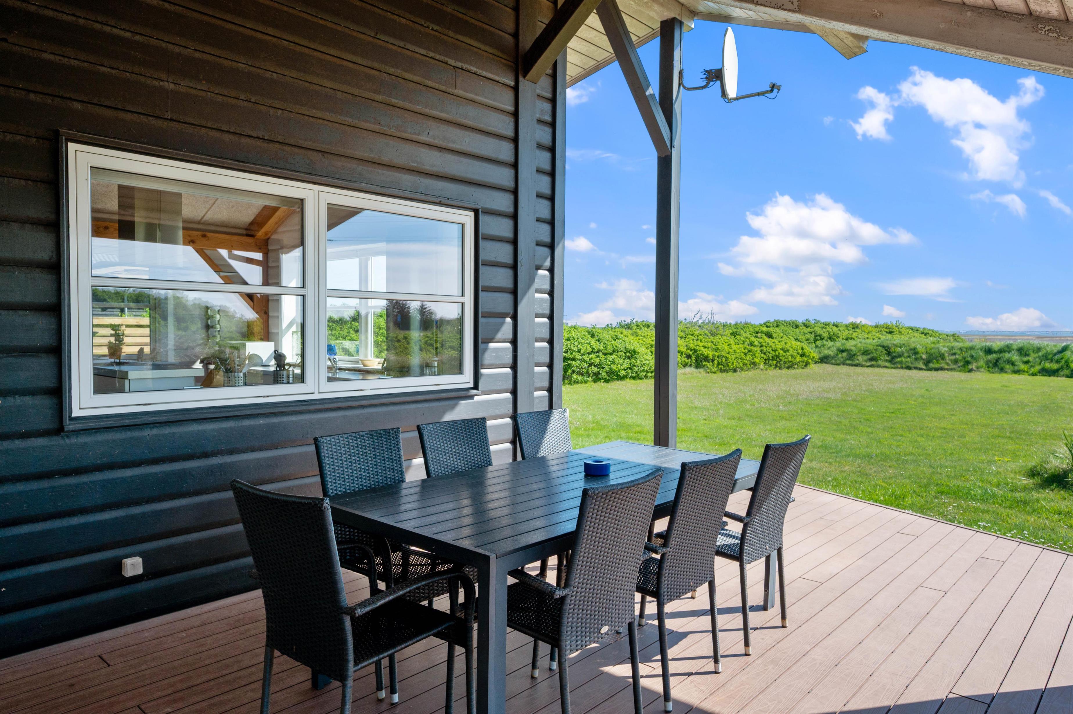 Fra stuen kommer I ud på den store terrasse, hvor havemøbler og liggestole står til rådighed, så I kan få det bedste ud af jeres ferie, og nyde solskinsdagene på vestkysten i fulde drag. I finder også uden problemer en plads i skyggen under den overdækkede del af terrassen, som desuden gør, at I selv på regnfulde dage kan nyde godt af den friske luft og udsigten til det naturskønne ferieområde i Klegod.