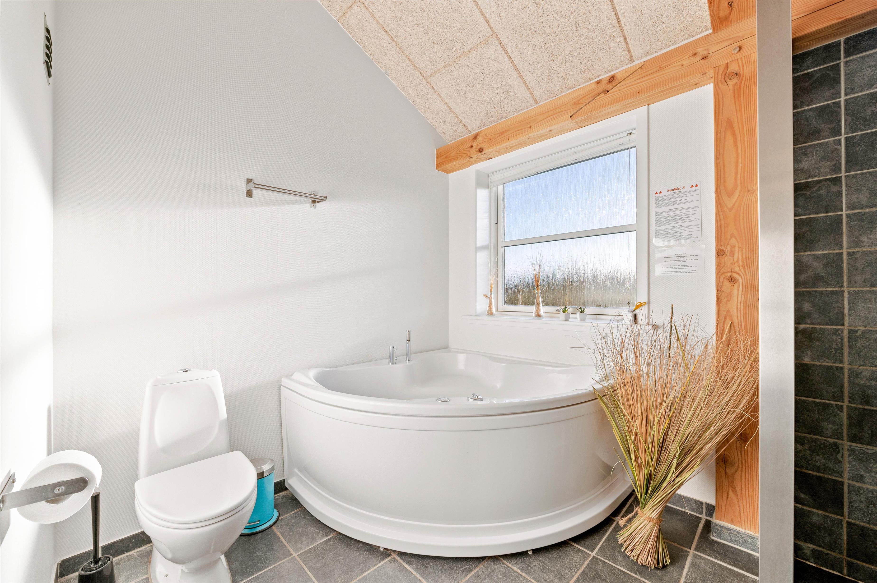 På det største af feriehusets 2 badeværelser finder I husets lækre wellness-highlights – det er nemlig indrettet med sauna og spabad. Nyd feriefreden i varmen eller tank nye kræfter efter en frisk gåtur i den salte havluft ved Vesterhavet.