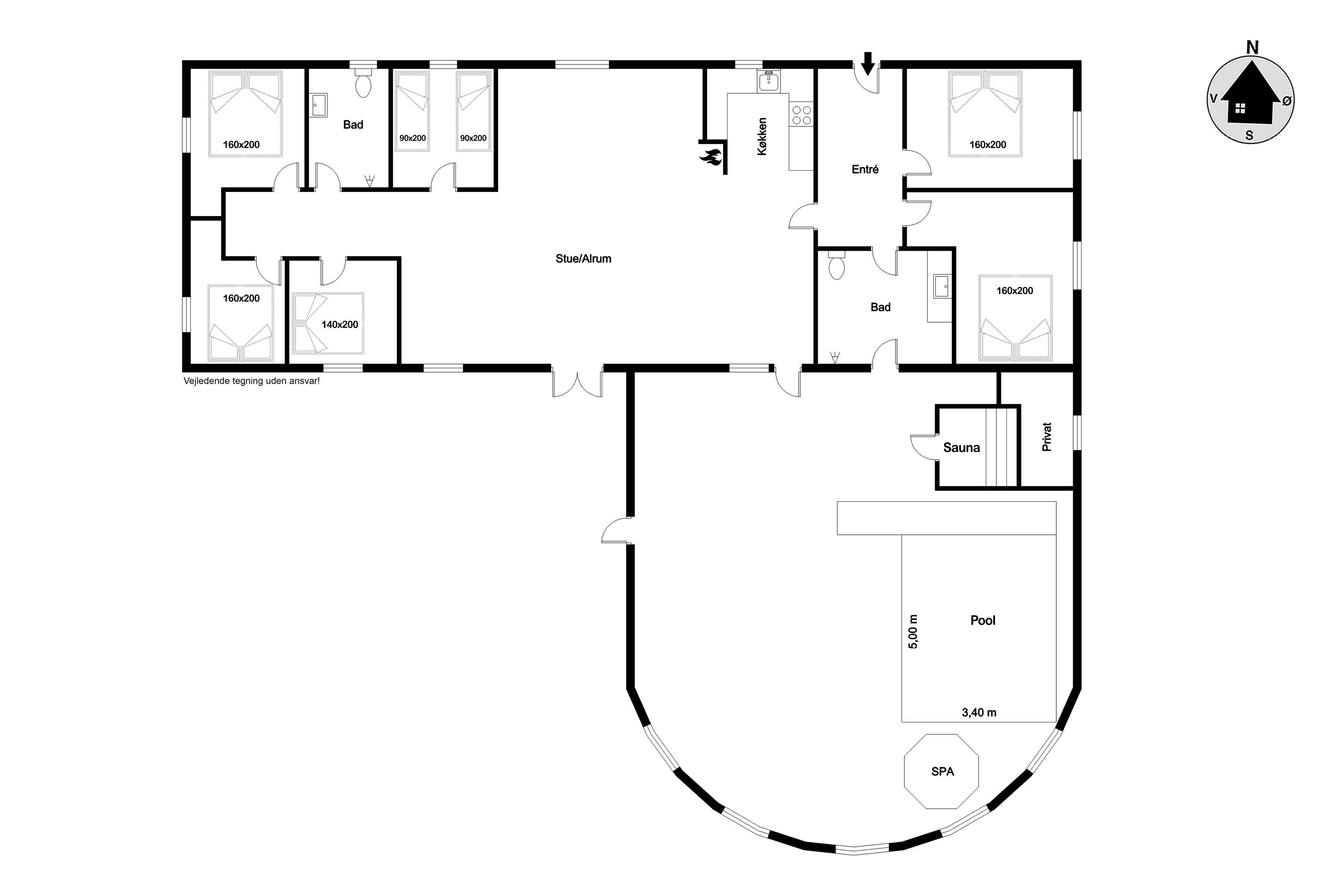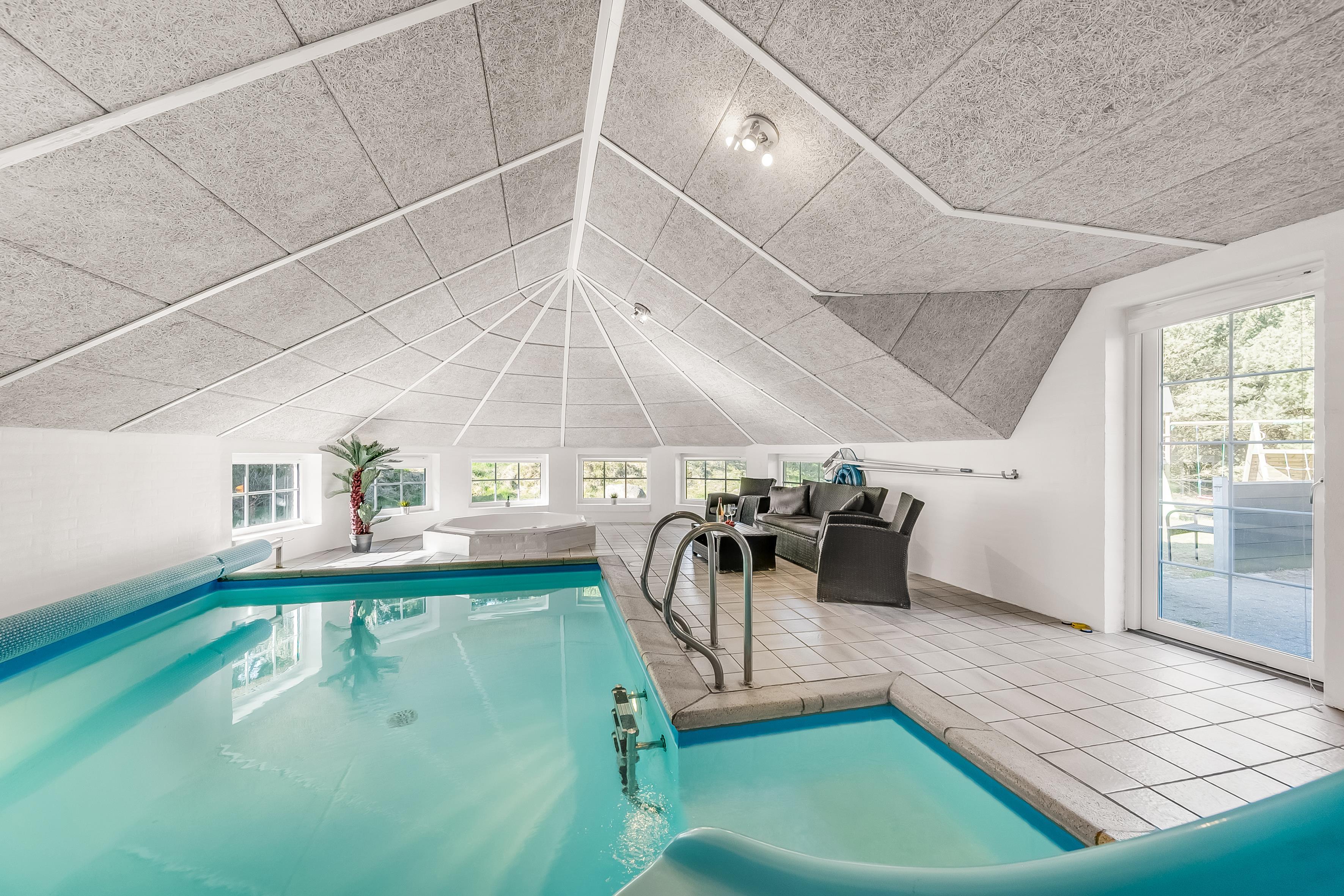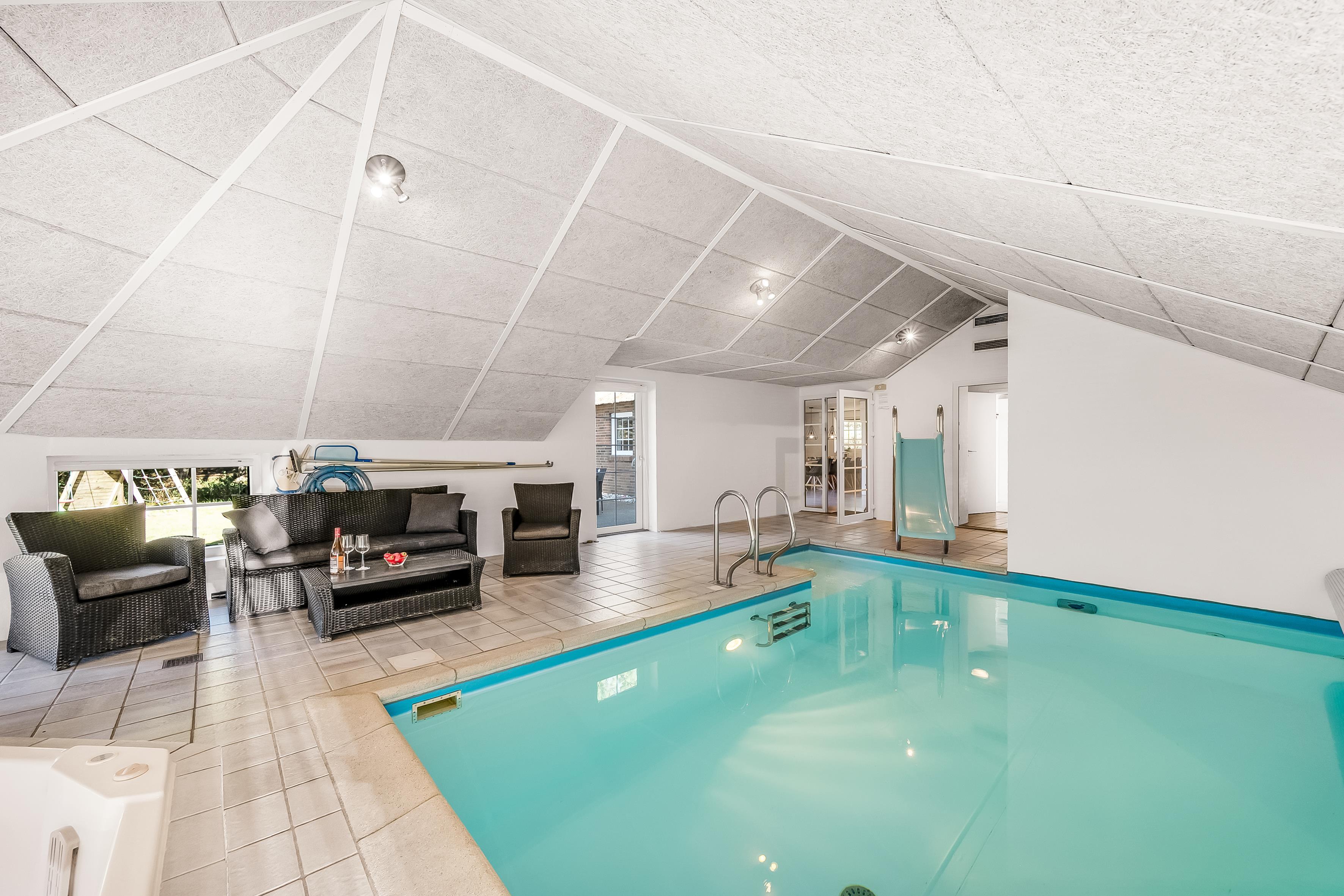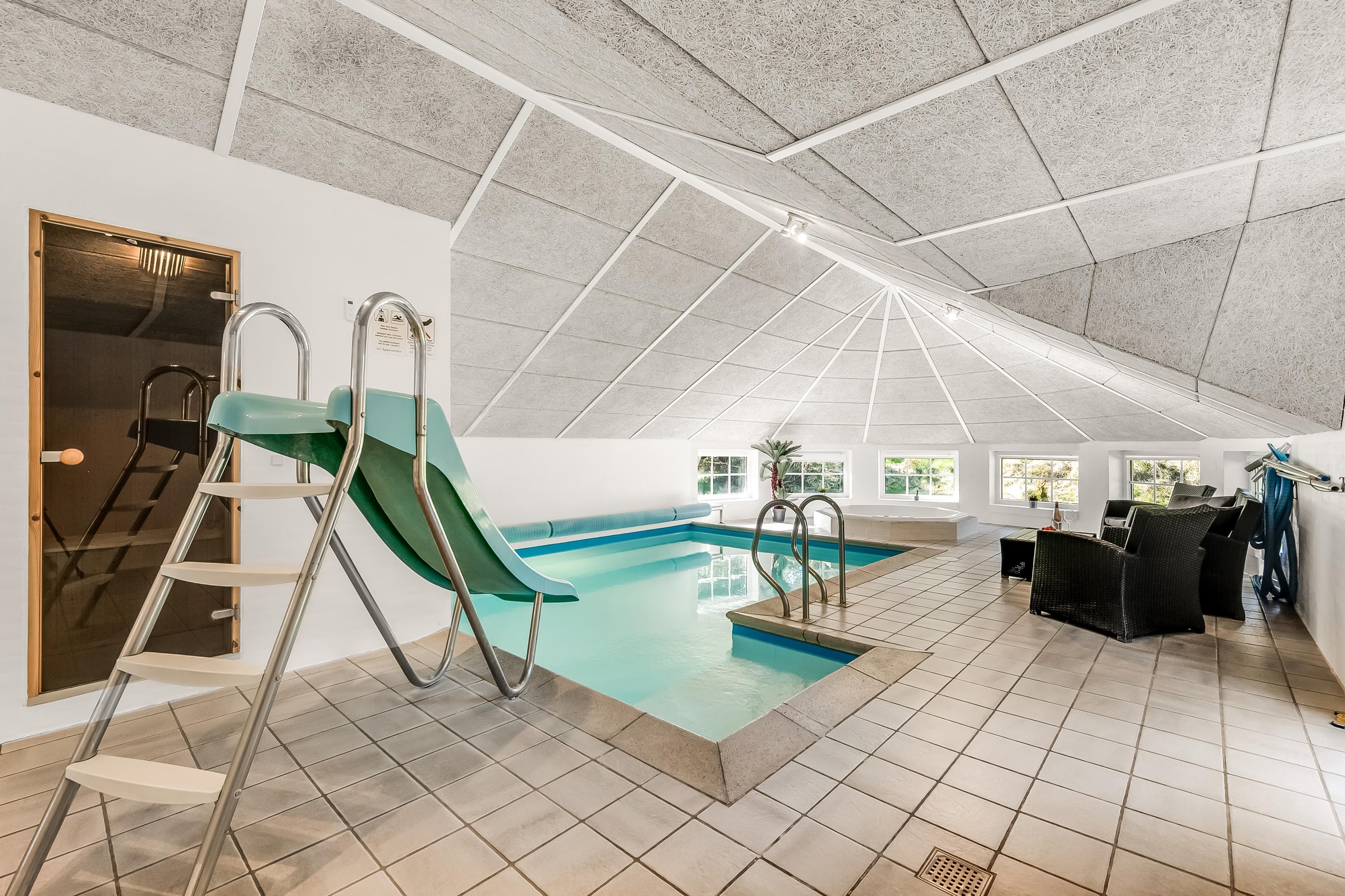 Træd ind i det imponerende poolrum, hvor du finder en 18 kvadratmeter stor swimmingpool, opvarmet af en energibesparende luft-til-vand varmepumpe. Glid ned ad vandrutsjebanen og nyd en forfriskende dukkert, eller slap af i det rummelige 4-personers spabad. Saunaen giver den perfekte mulighed for total afslapning, efter en dag fyldt med eventyr.