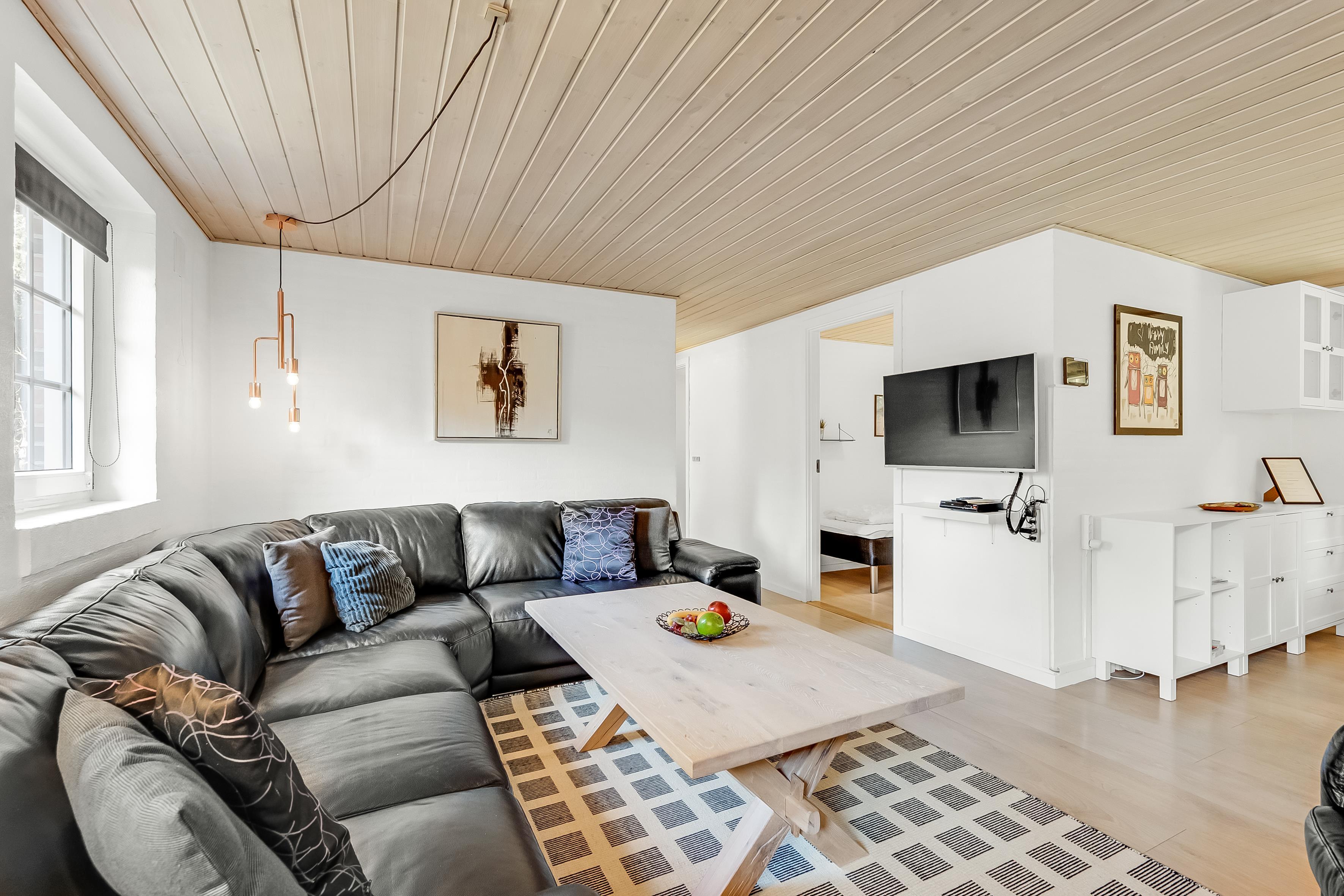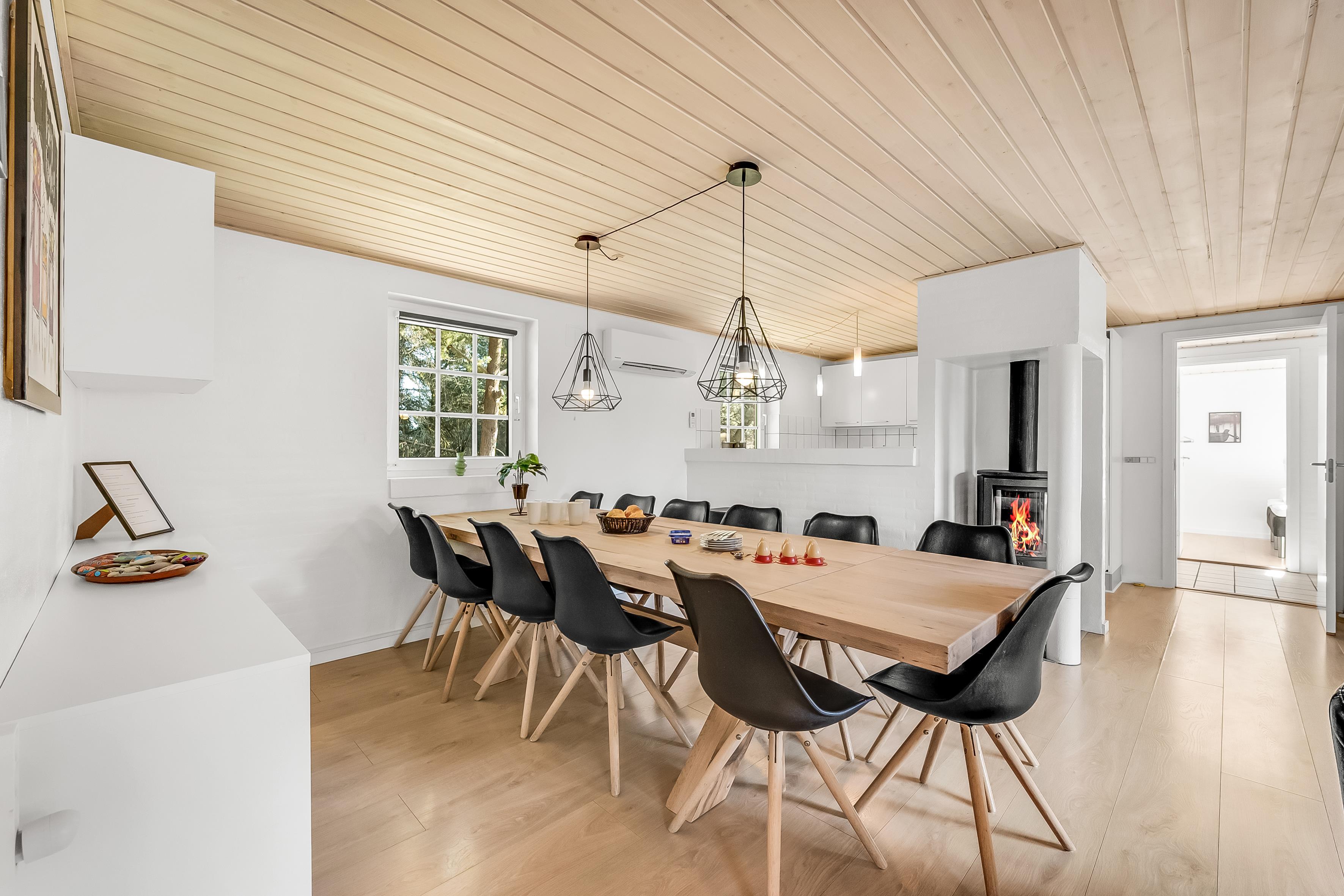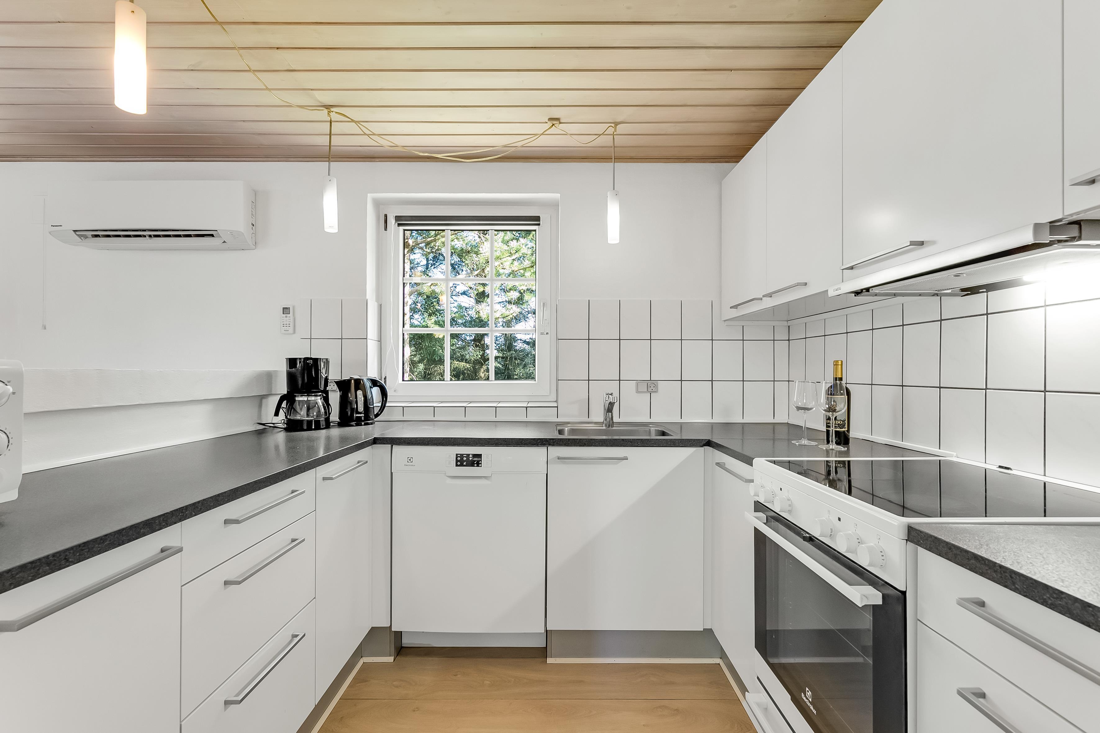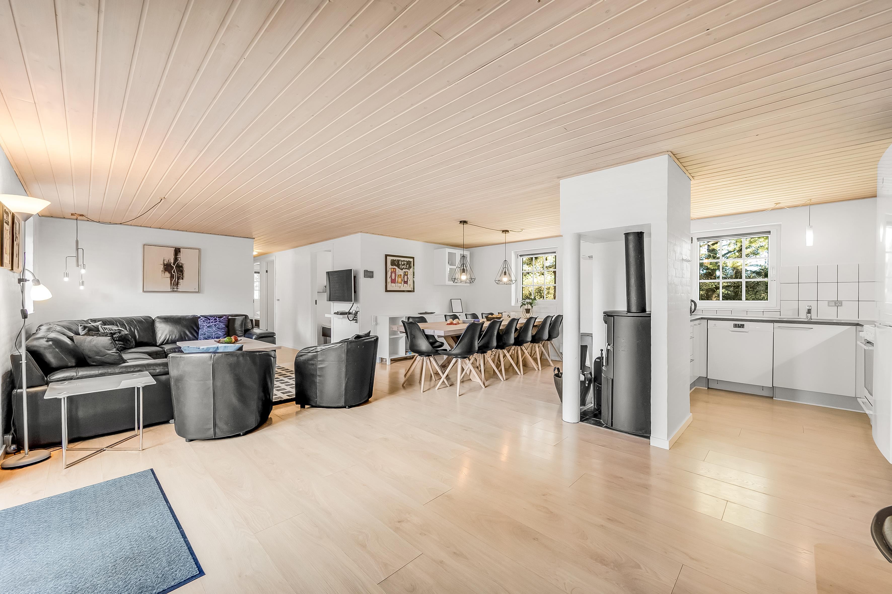 Det åbne køkken-alrum er det perfekte samlingspunkt for madlavning og hyggelige måltider. Udstyret med ovn, 4 keramiske kogeplader, køleskab, 50 liters fryser, opvaskemaskine og mikrobølgeovn, vil det imødekomme alle dine behov. Underholdningsmuligheder inkluderer fjernsyn med parabol til tyske kanaler, Chromecast til streaming, dvd-afspiller, radio og trådløst internet. Brændeovnen og den energibesparende luft-til-luft varmepumpe sikrer, at du altid har den rette temperatur.