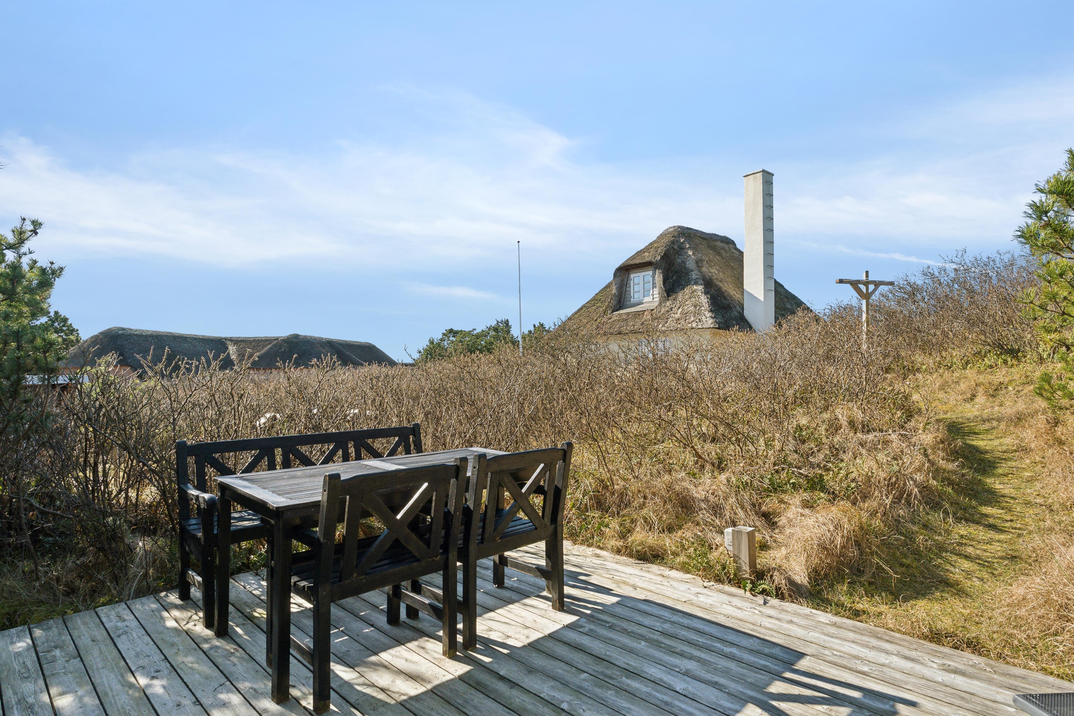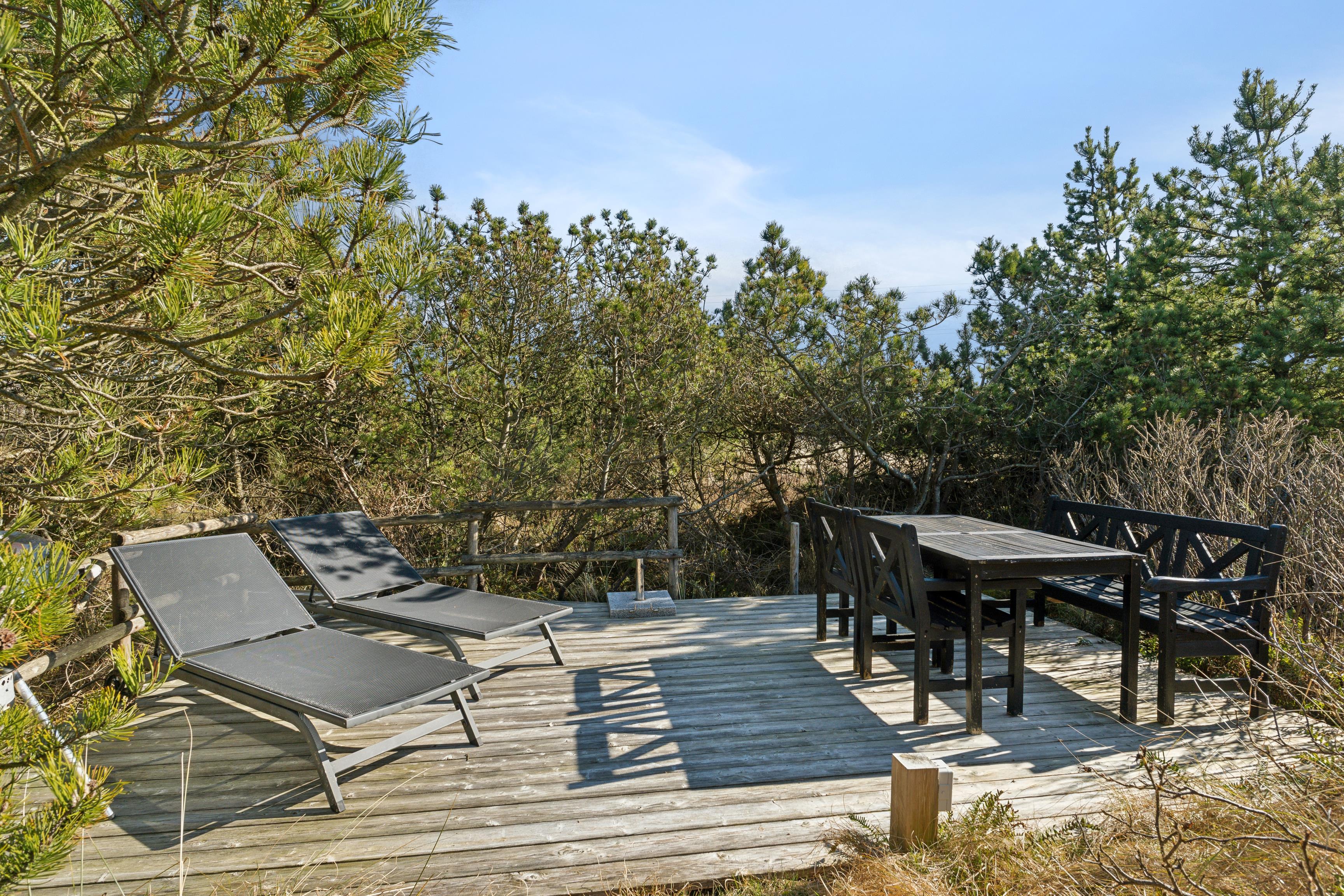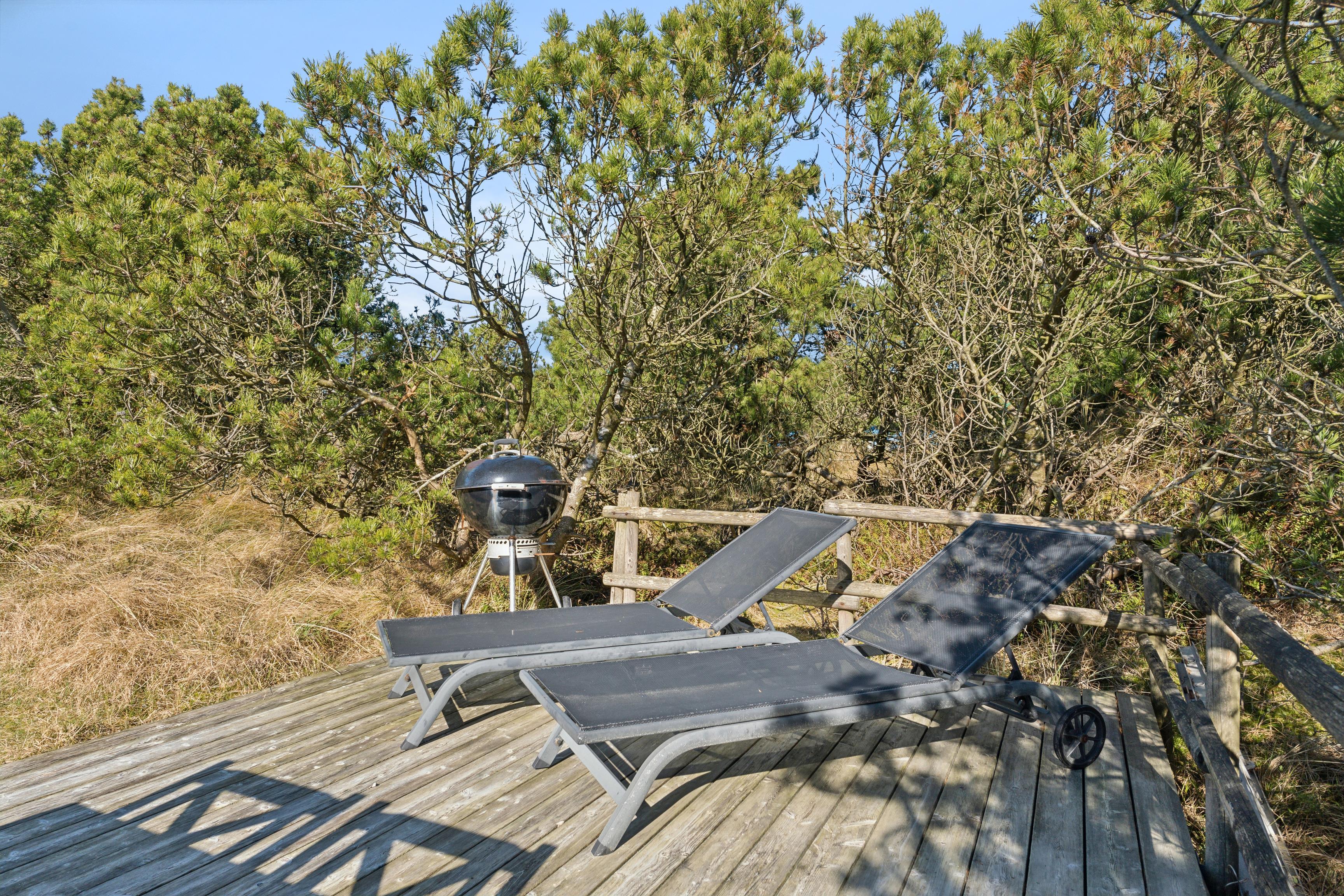 Takket være de sammenhængende terrasser, der omgiver huset, finder du et beskyttet sted at nyde naturen, selv på køligere eller mere blæsende dage. Lidt længere væk er der en anden lille solterrasse med to liggestole, omgivet af buske, der tilbyder et ekstra privat område. Det er de perfekte rammer til at nyde din morgenkaffe eller hyggelige grillfester i aftensolen – en virkelig afslappende ferie!