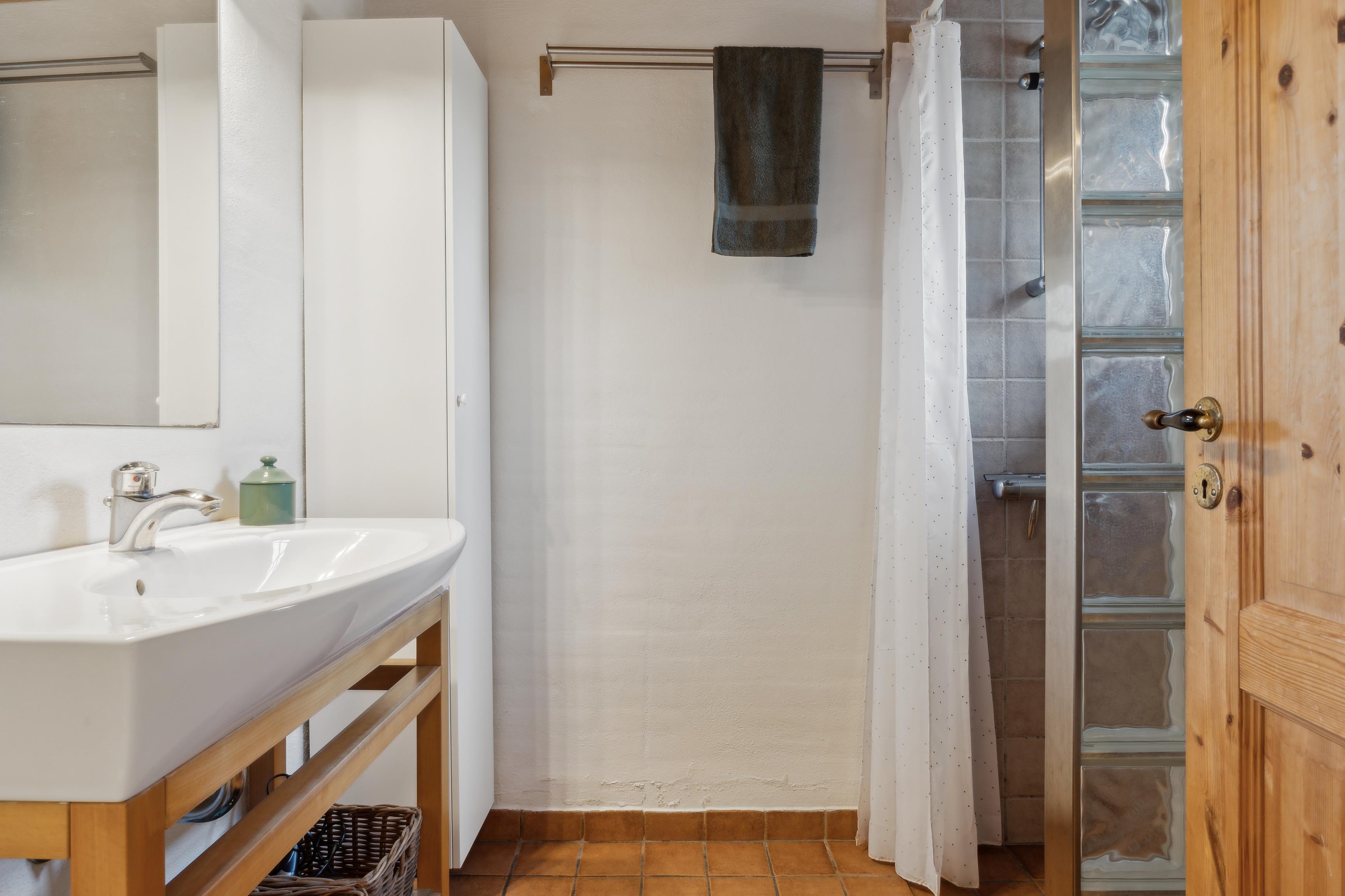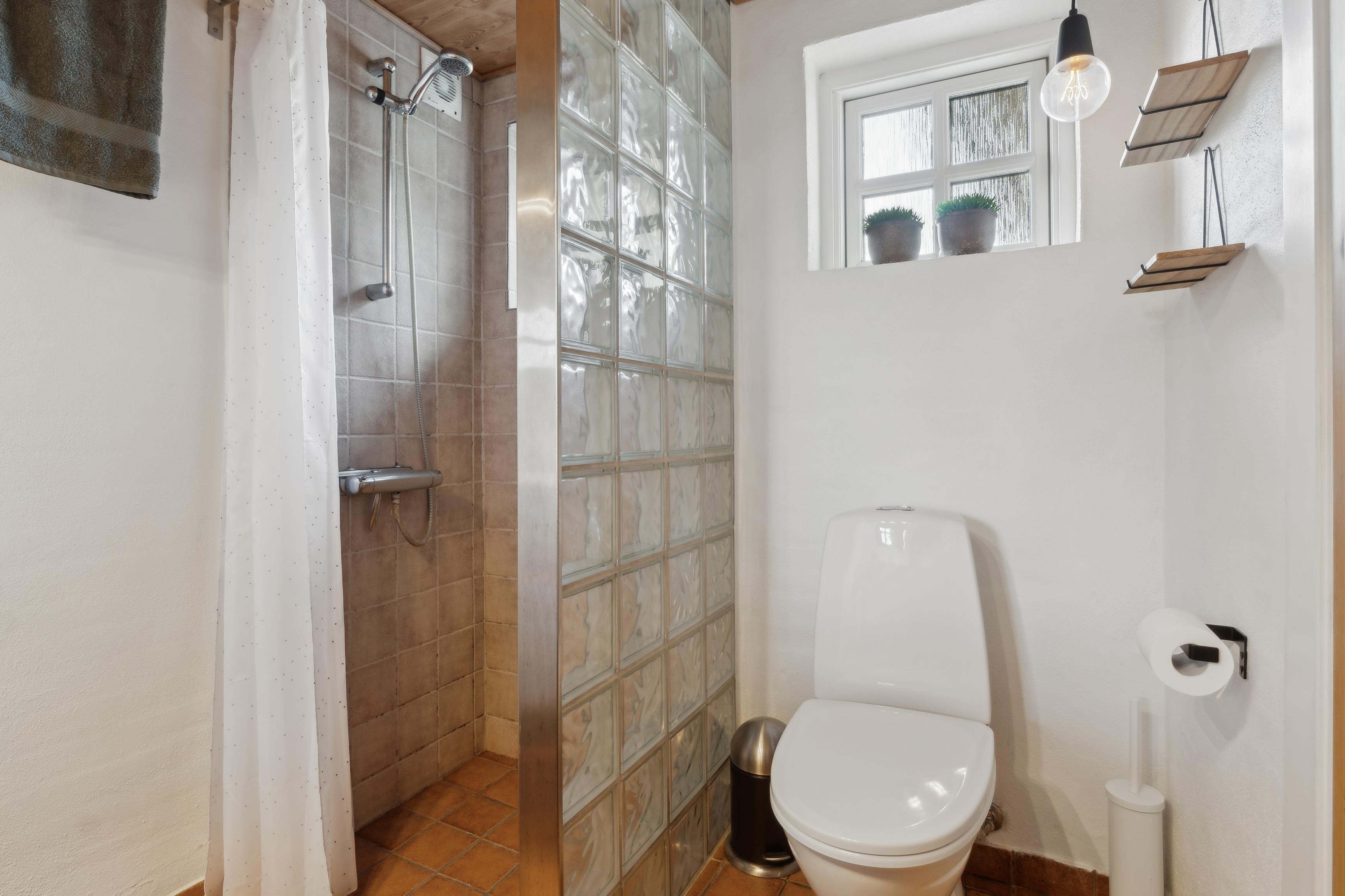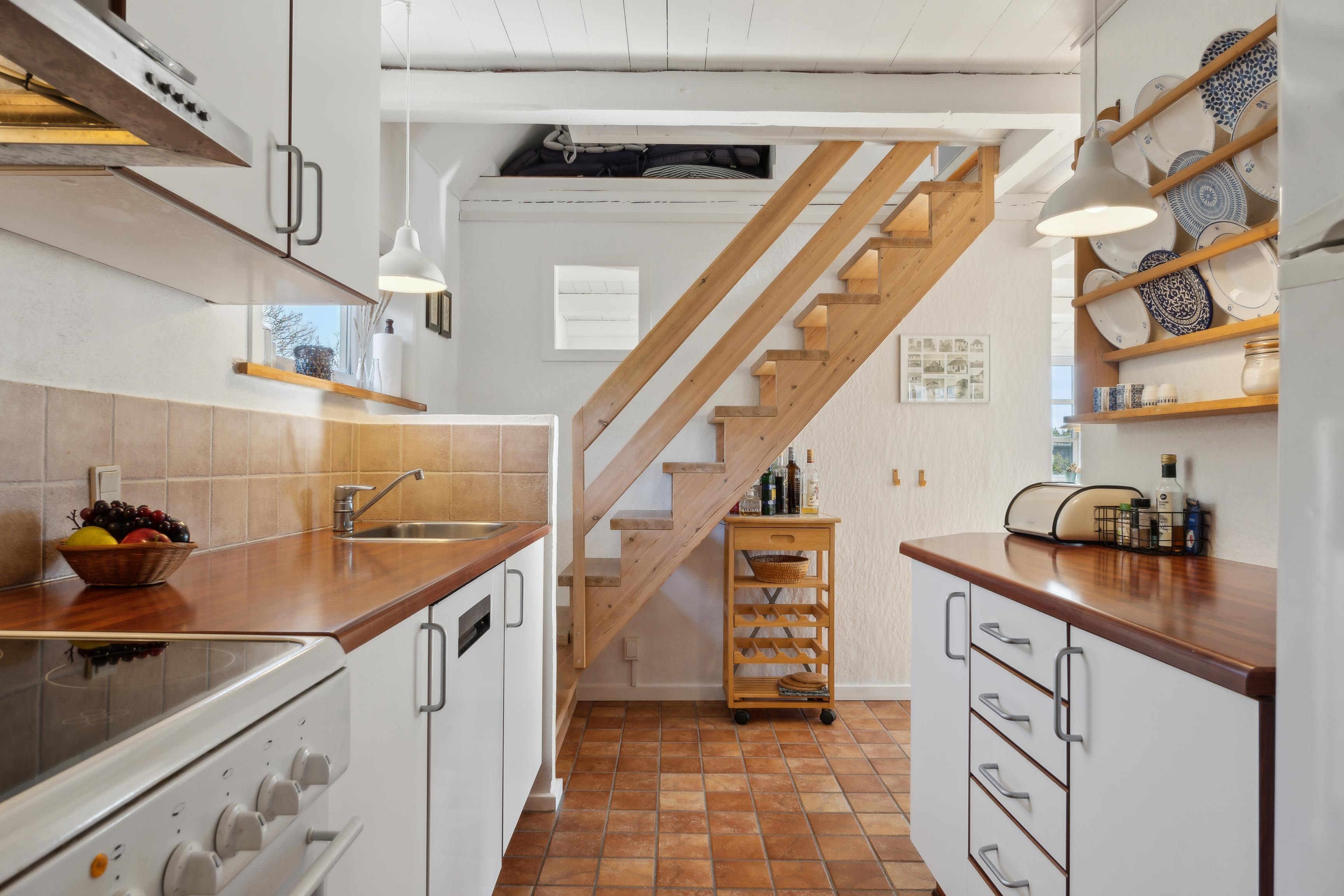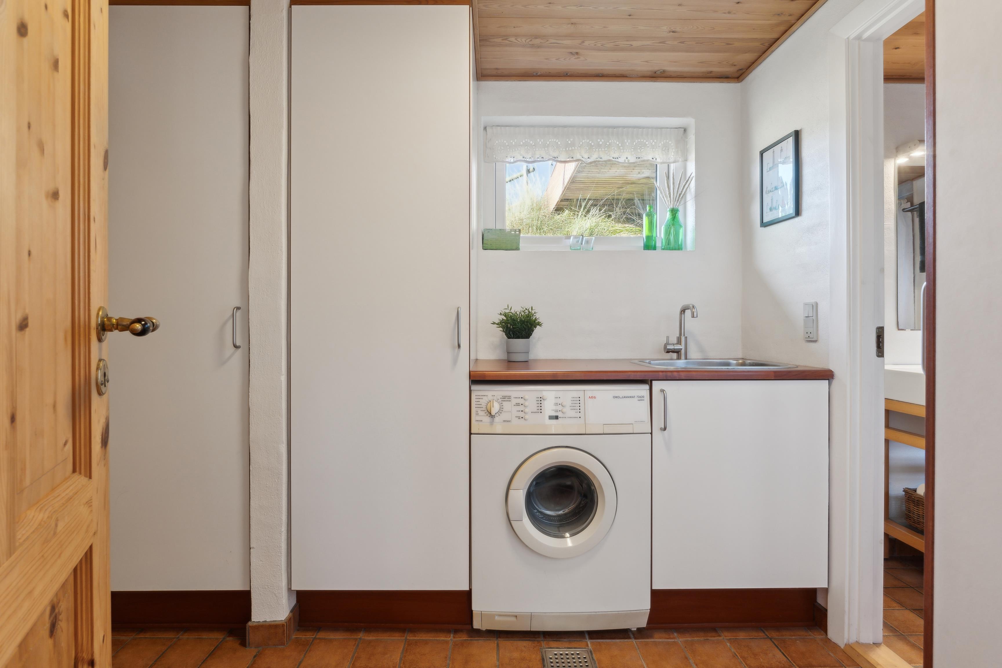 I det fuldt udstyrede køkken finder du køleskab med fryser, opvaskemaskine, komfur og kaffemaskine – alt hvad du behøver til en afslappende ferie. Der er også vaskemaskine. Det mindre badeværelse har bruser og et højskab, og overfor ligger saunaen, der fuldender pakken.