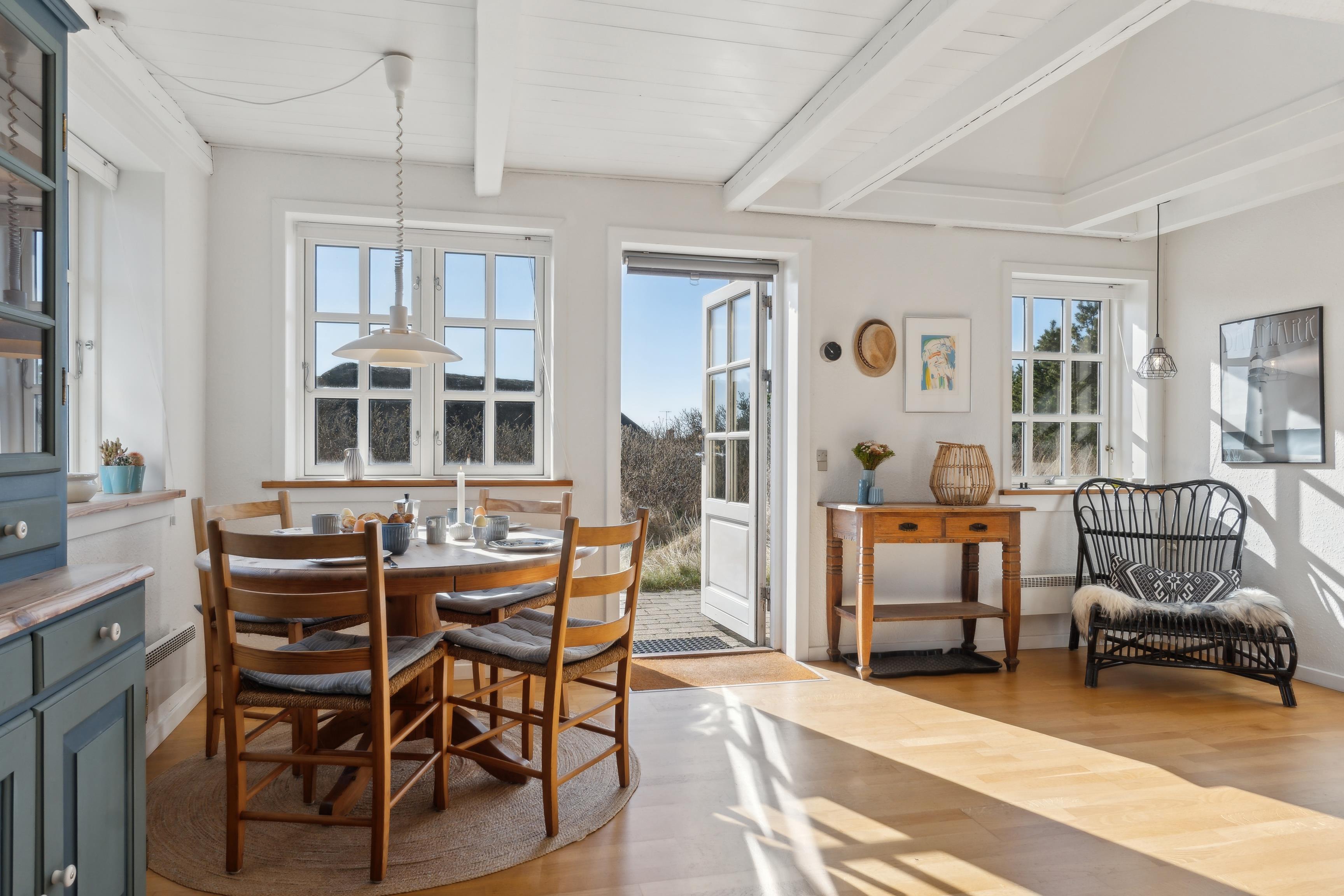 Kun 700 meter væk ligger den brede sandstrand ved vores danske Vesterhavskyst, der inviterer til lange gåture i alle årstider og svømning om sommeren. De nærmeste butikker ligger 6 km væk i Søndervig, hvor du finder både supermarkeder og specialbutikker at kigge i. Oplev en afslappende ferie i vores smukke feriehus i naturskønne omgivelser tæt på havet.