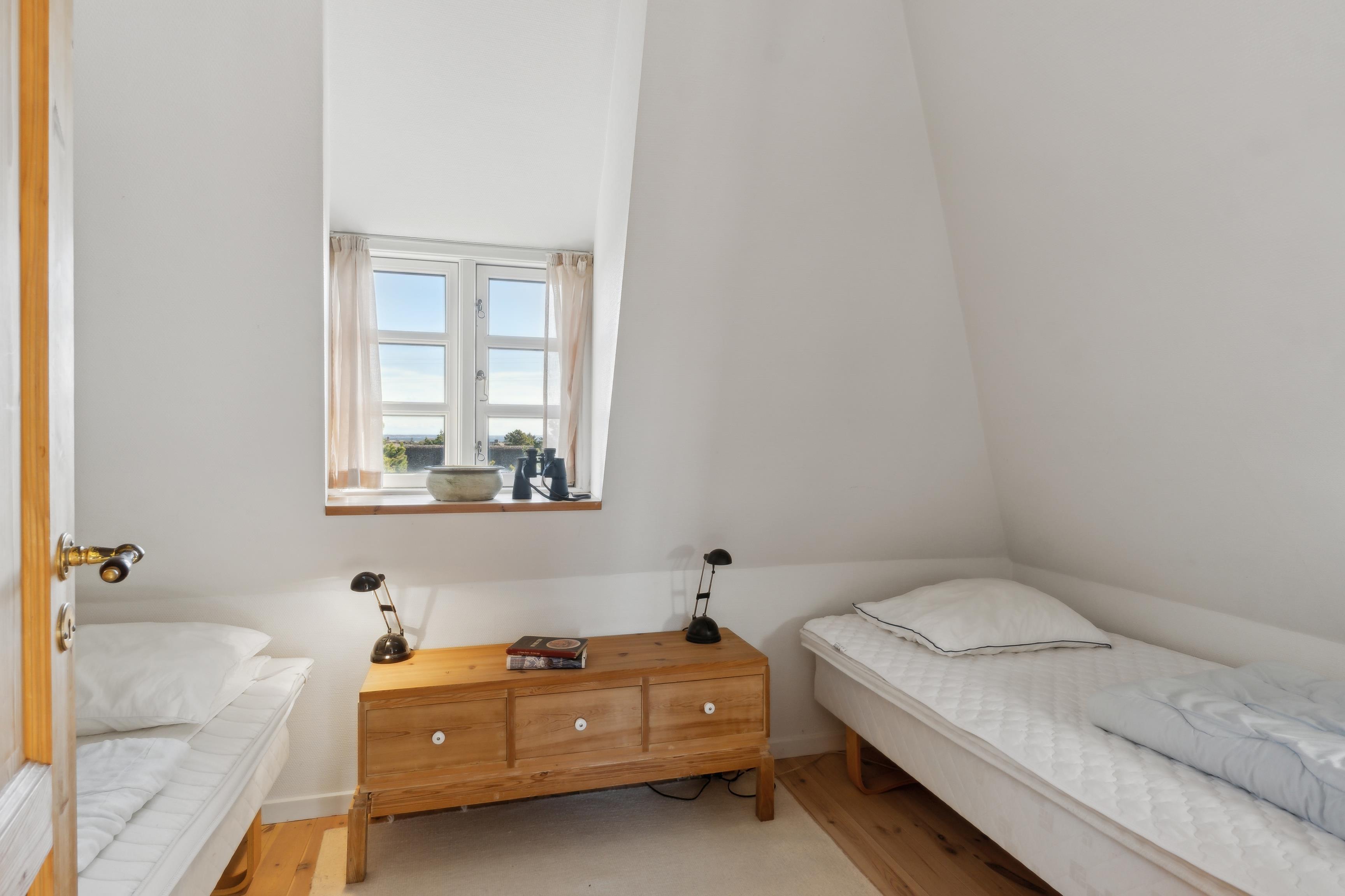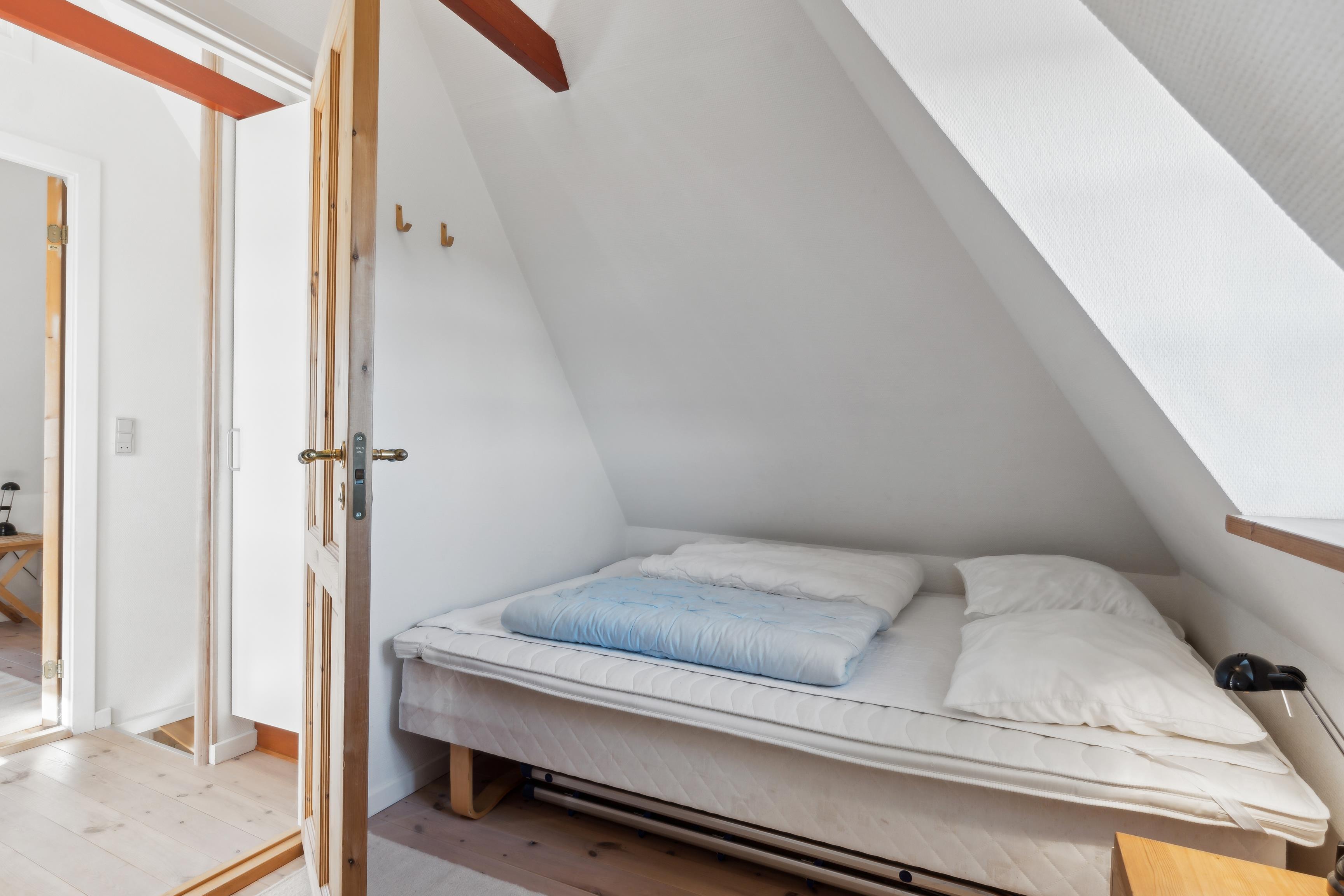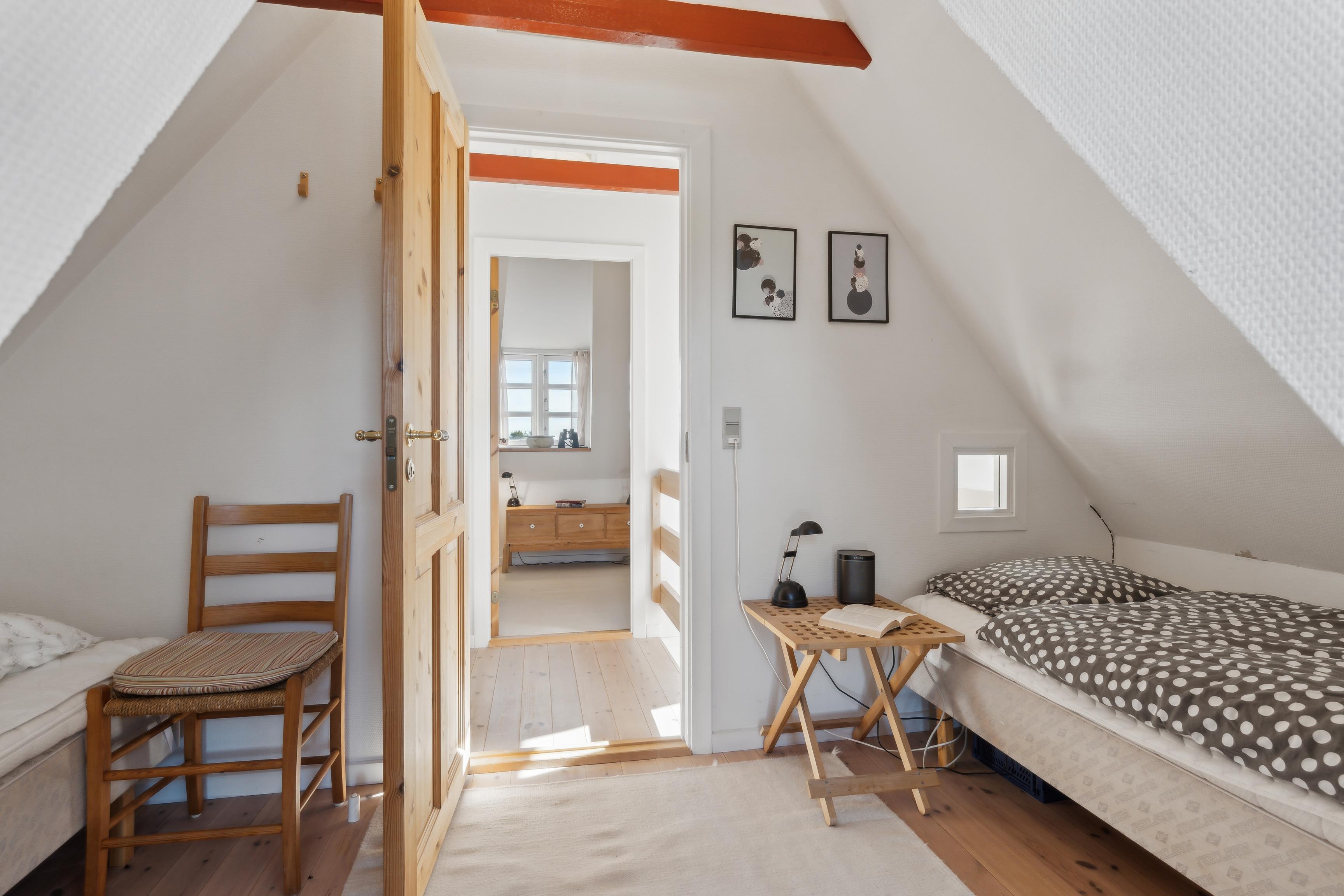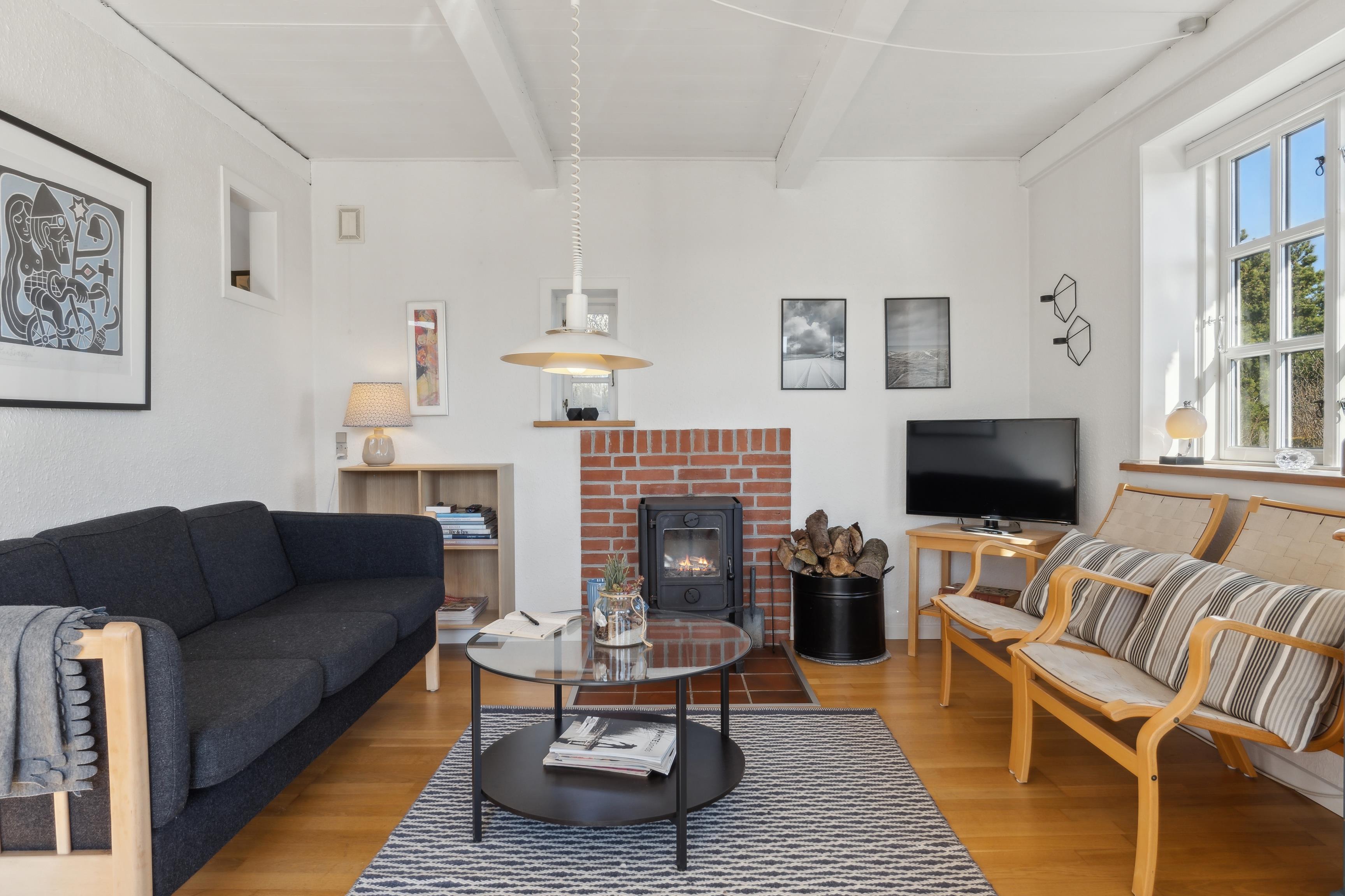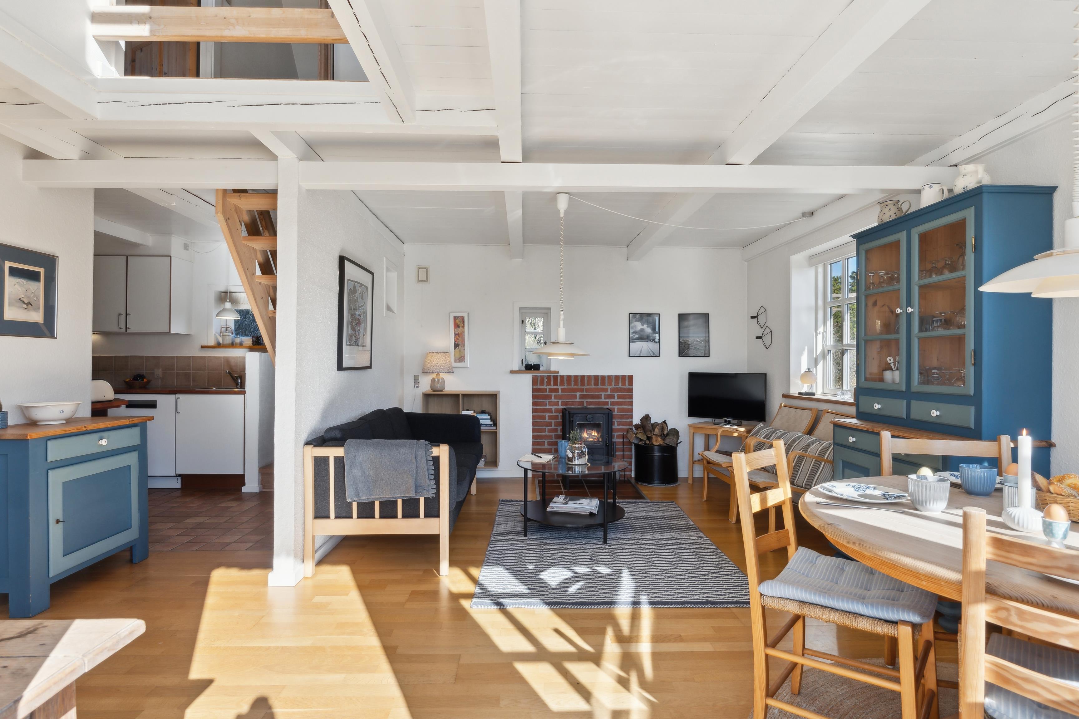 Fordelt over to etager med et samlet boligareal på 77 m², finder I masser af hyggelige pladser med plads til hele familien. Den rummelige stue med brændeovn er ideel til afslapning og spil, så I kan nyde varmen på kølige aftener og lytte til knitren af ??brænde. Køkken, badeværelse og Bryggers er også udstyret med gulvvarme. To soveværelser ovenpå, det ene med en dobbeltseng og det andet med to enkeltsenge, lover en god nats søvn. Herfra er der adgang til tagterrassen, som tilbyder en fantastisk 360° udsigt og er ideel til morgenkaffe eller morgenmad udendørs. Du kan også nå tagterrassen udefra via en lille sti.