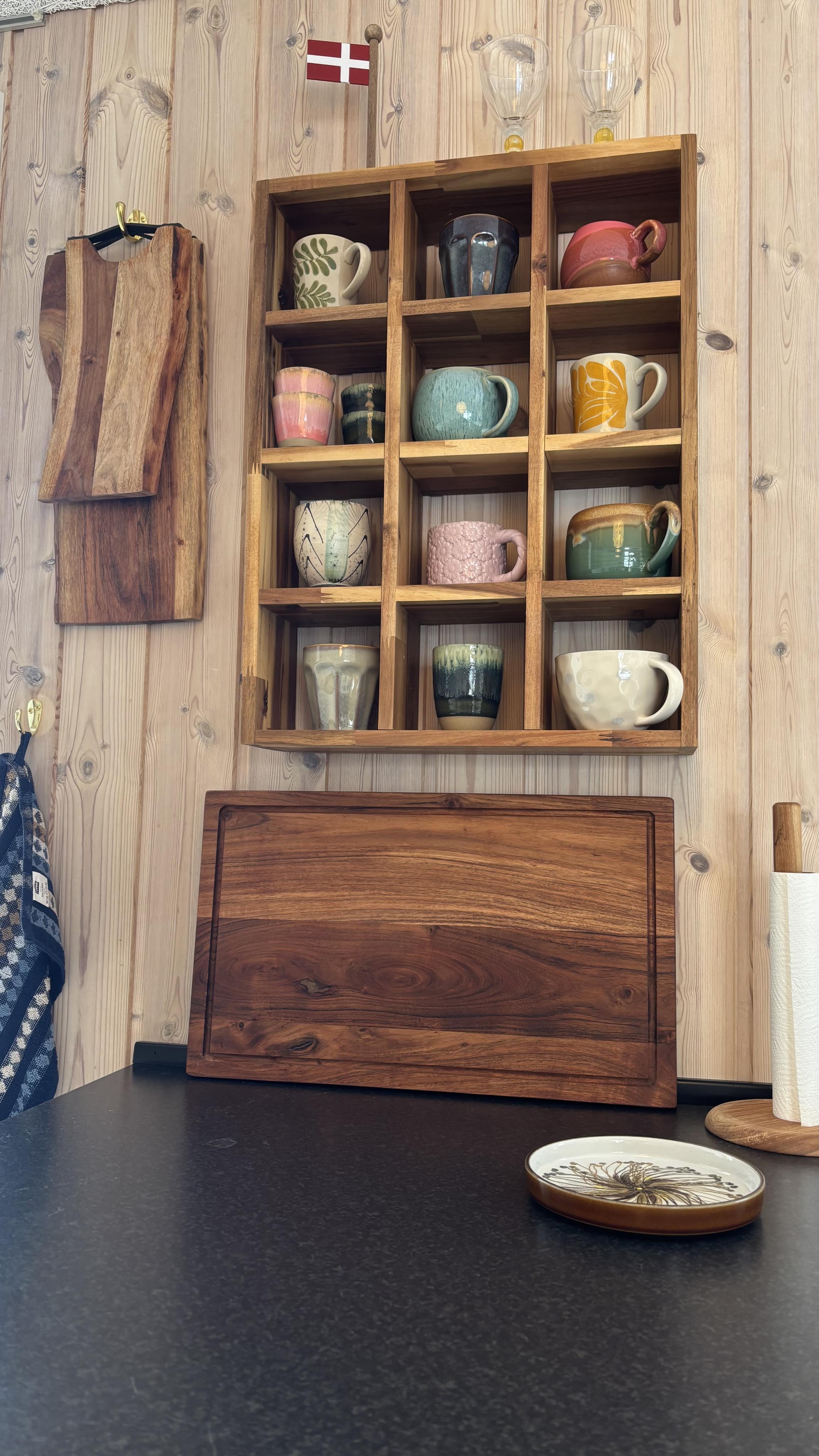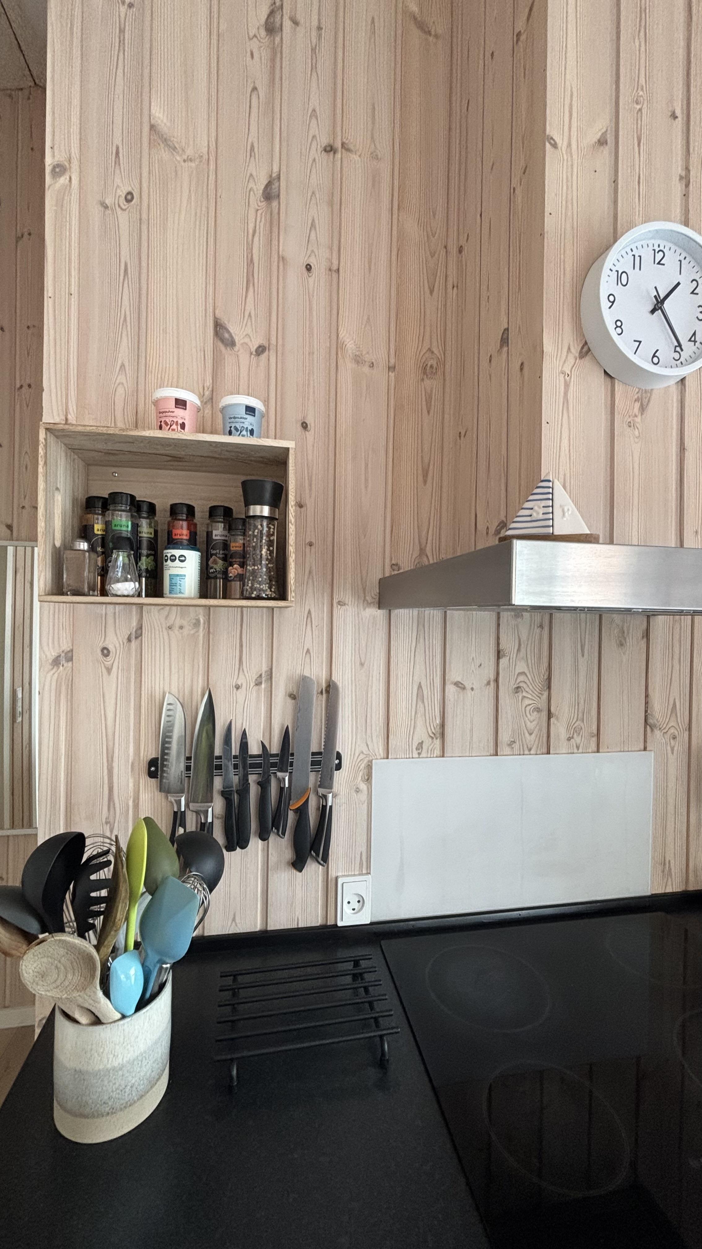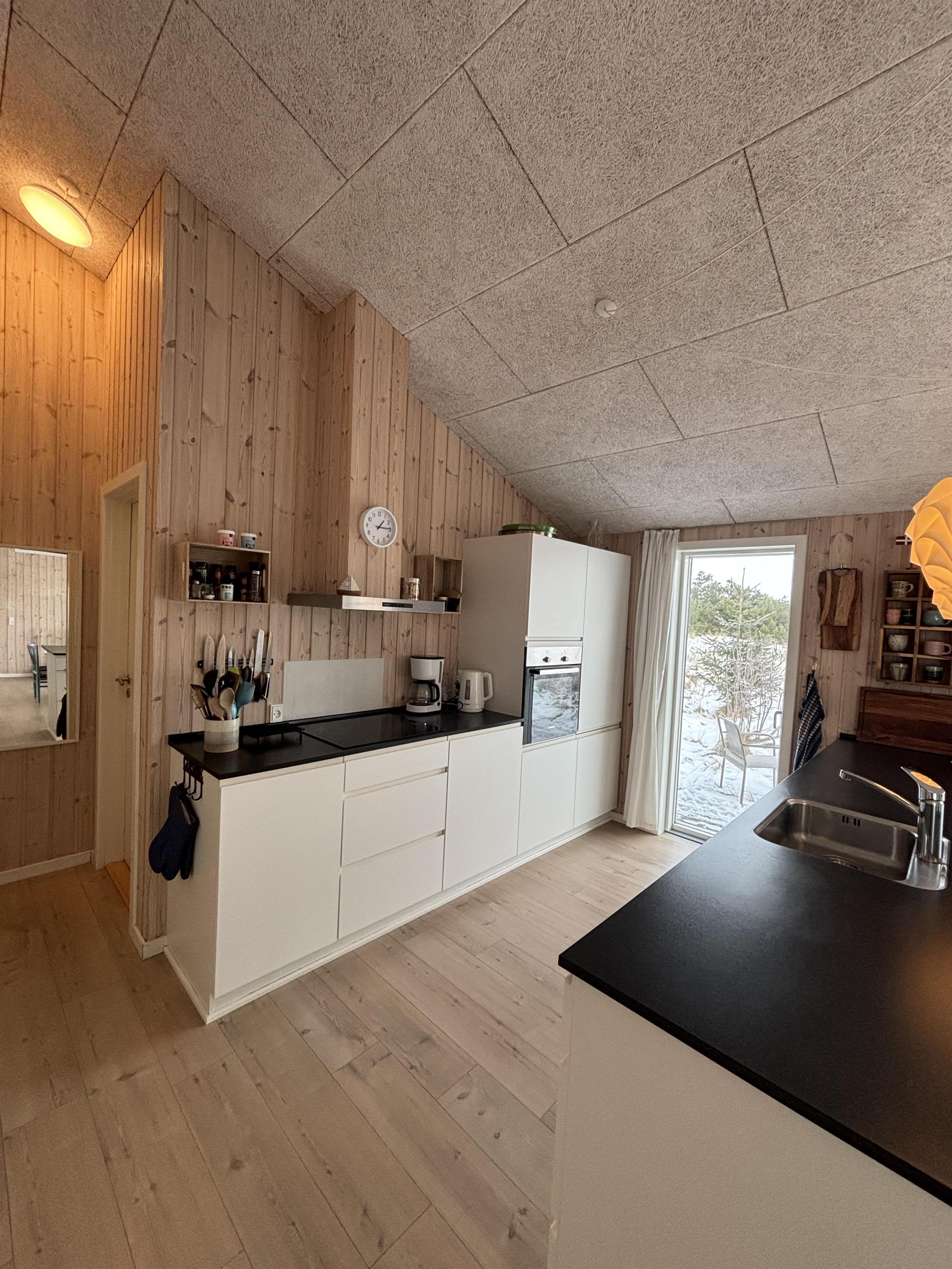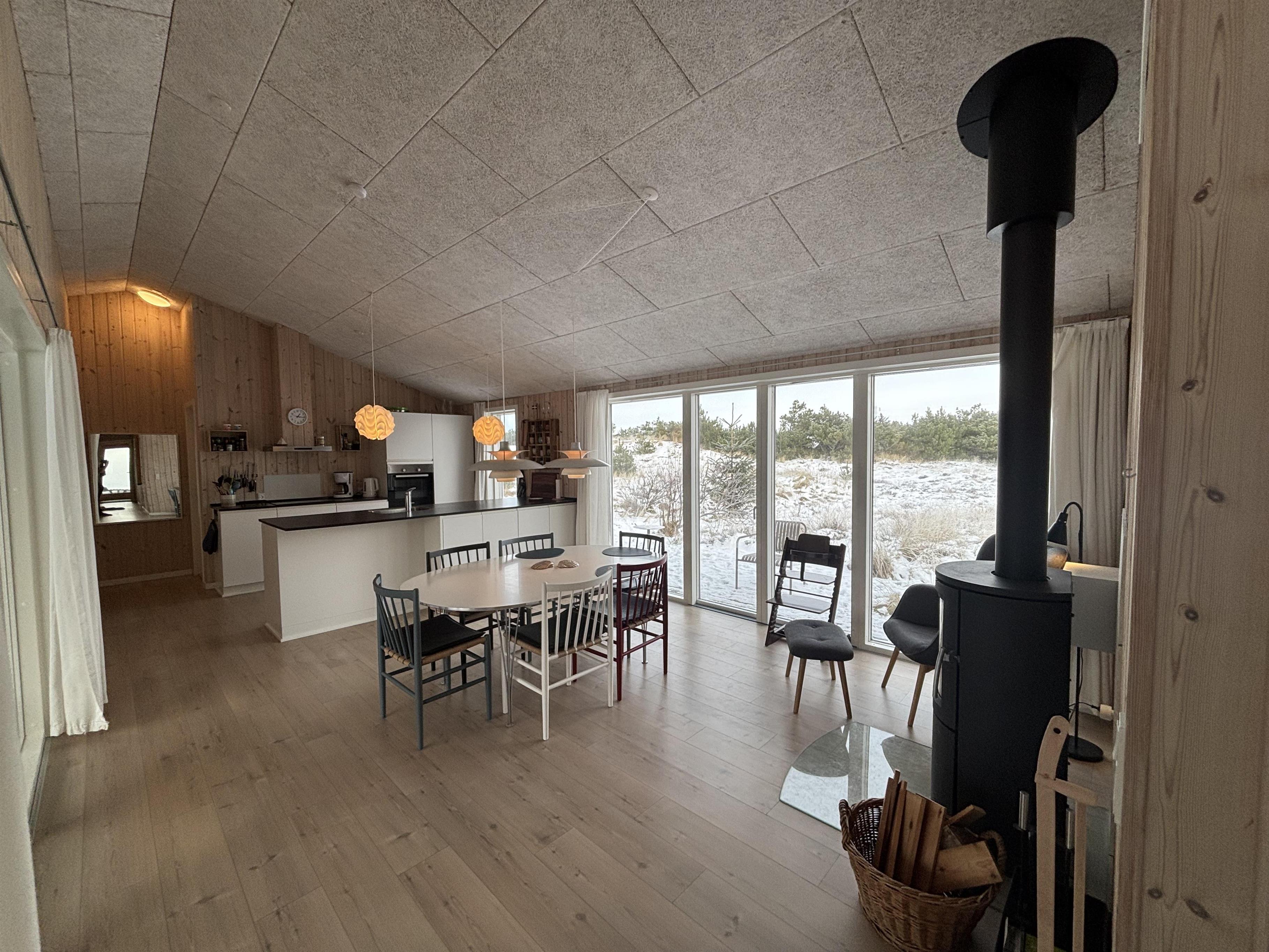 Huset er hyggeligt indrettet i en charmerende retrostil med velholdte og pæne møbler. Det lyse køkken ligger i åben forbindelse med stuen, hvor brændeovnen skaber en dejlig atmosfære på kølige aftener.
