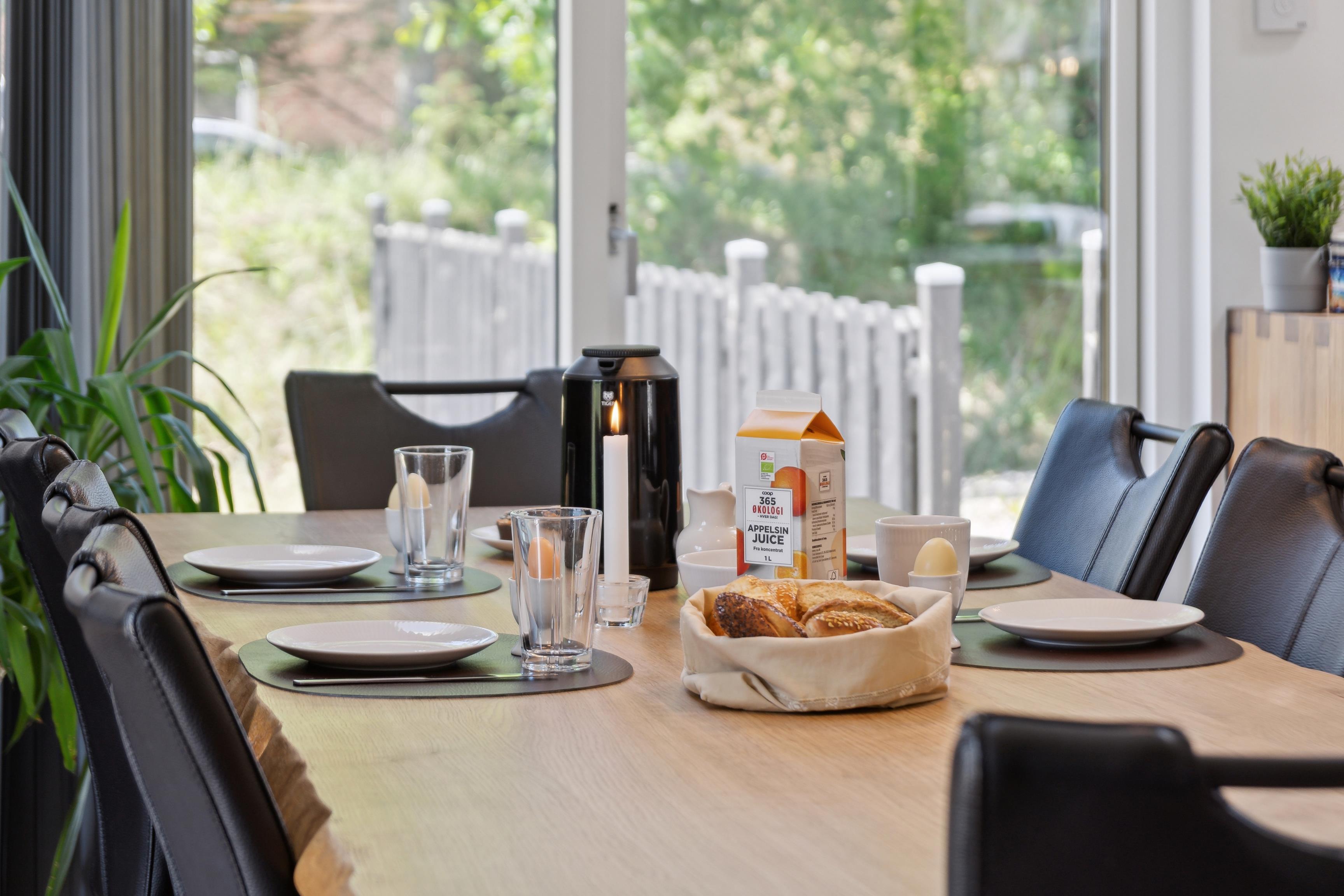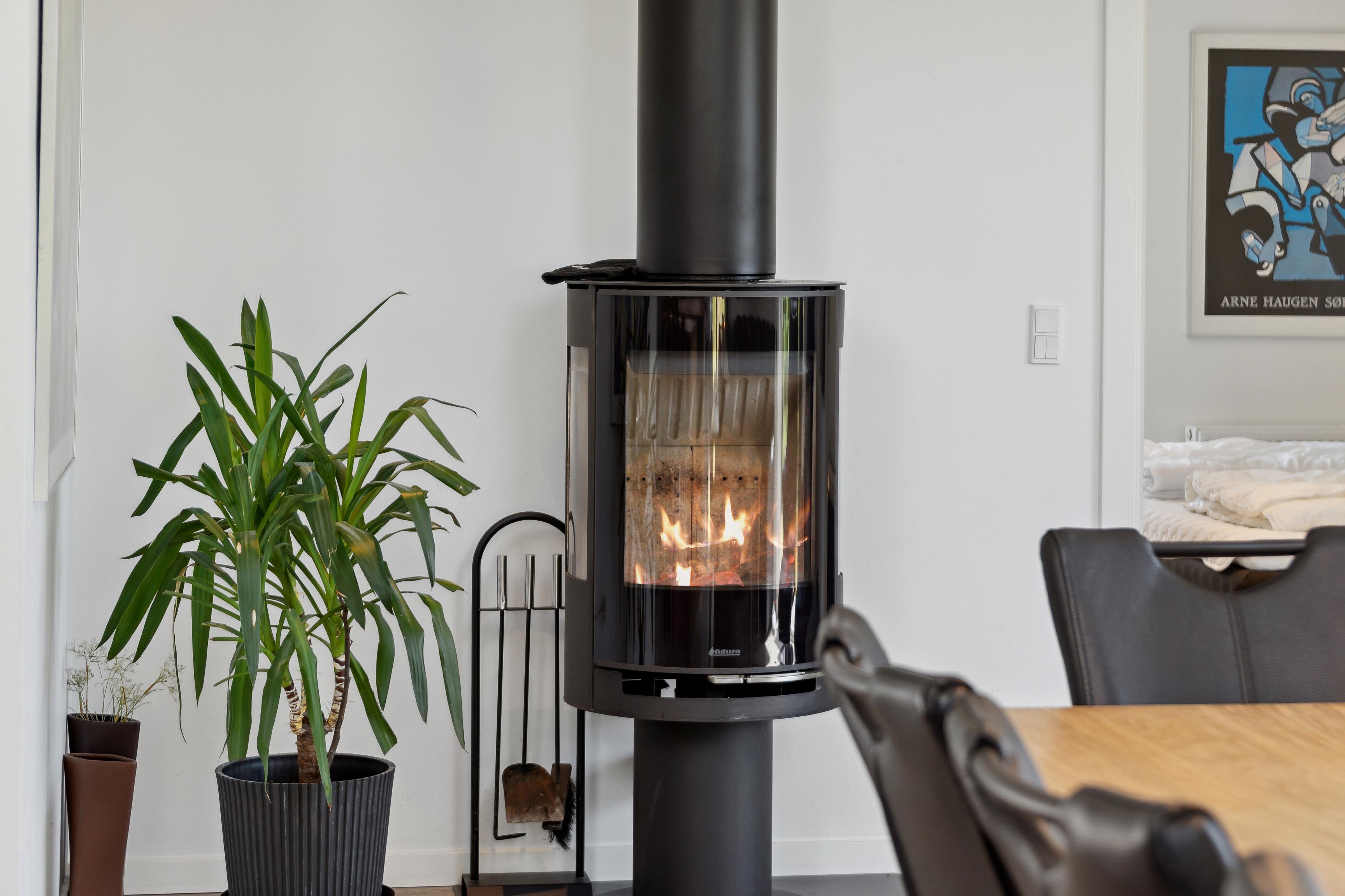 Huset rummer tre soveværelser med dobbeltsenge og har to badeværelser med brus samt et separat toilet og et tredje badeværelse med bruser. Det åbne opholdsrum kombinerer køkken og stue og er udstyret med brændeovn og moderne møbler – ideelt til afslapning og hyggelige stunder. Der er ingen barnesenge eller høje stole, hvilket gør huset ideelt for voksne gæster eller familier med større børn.