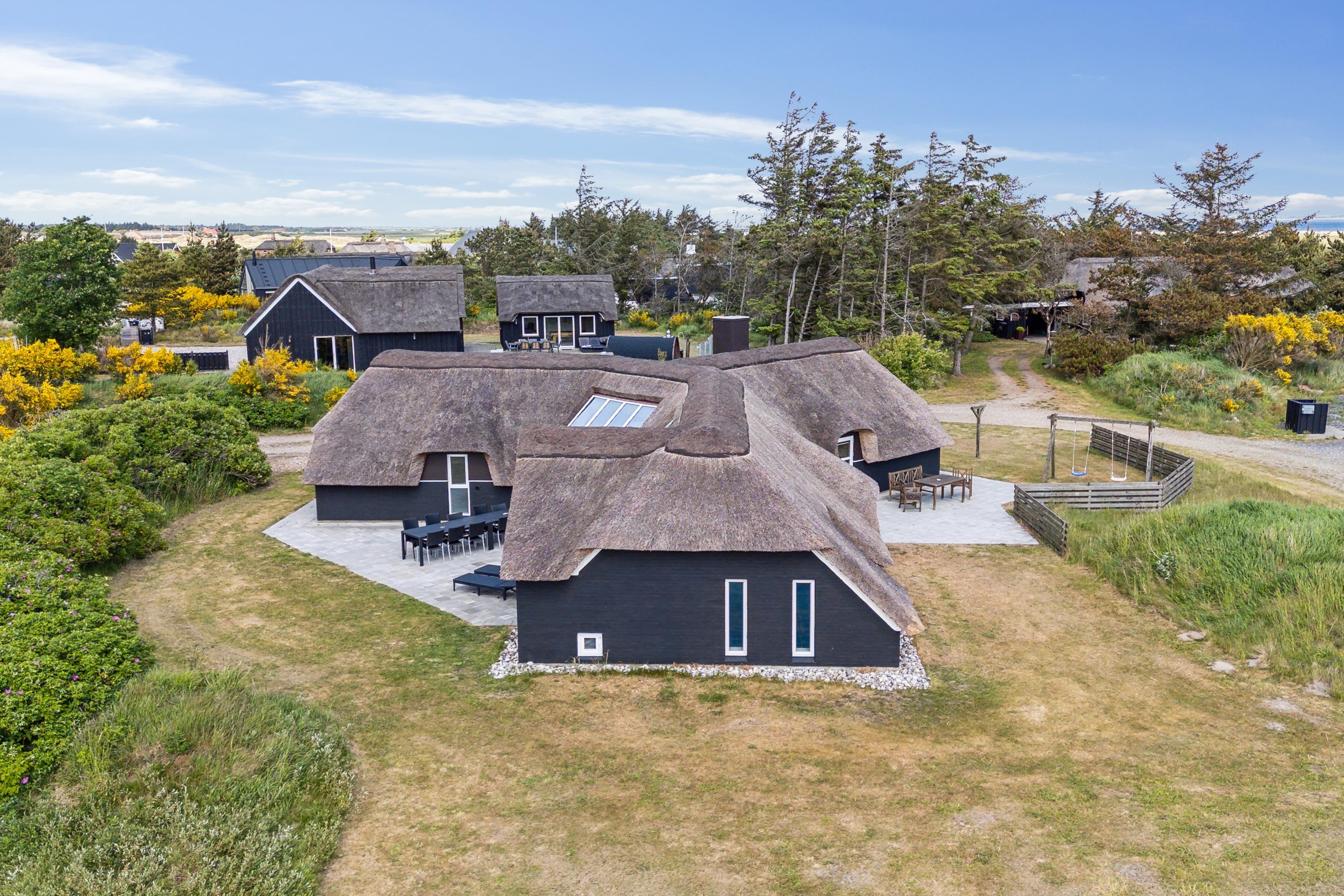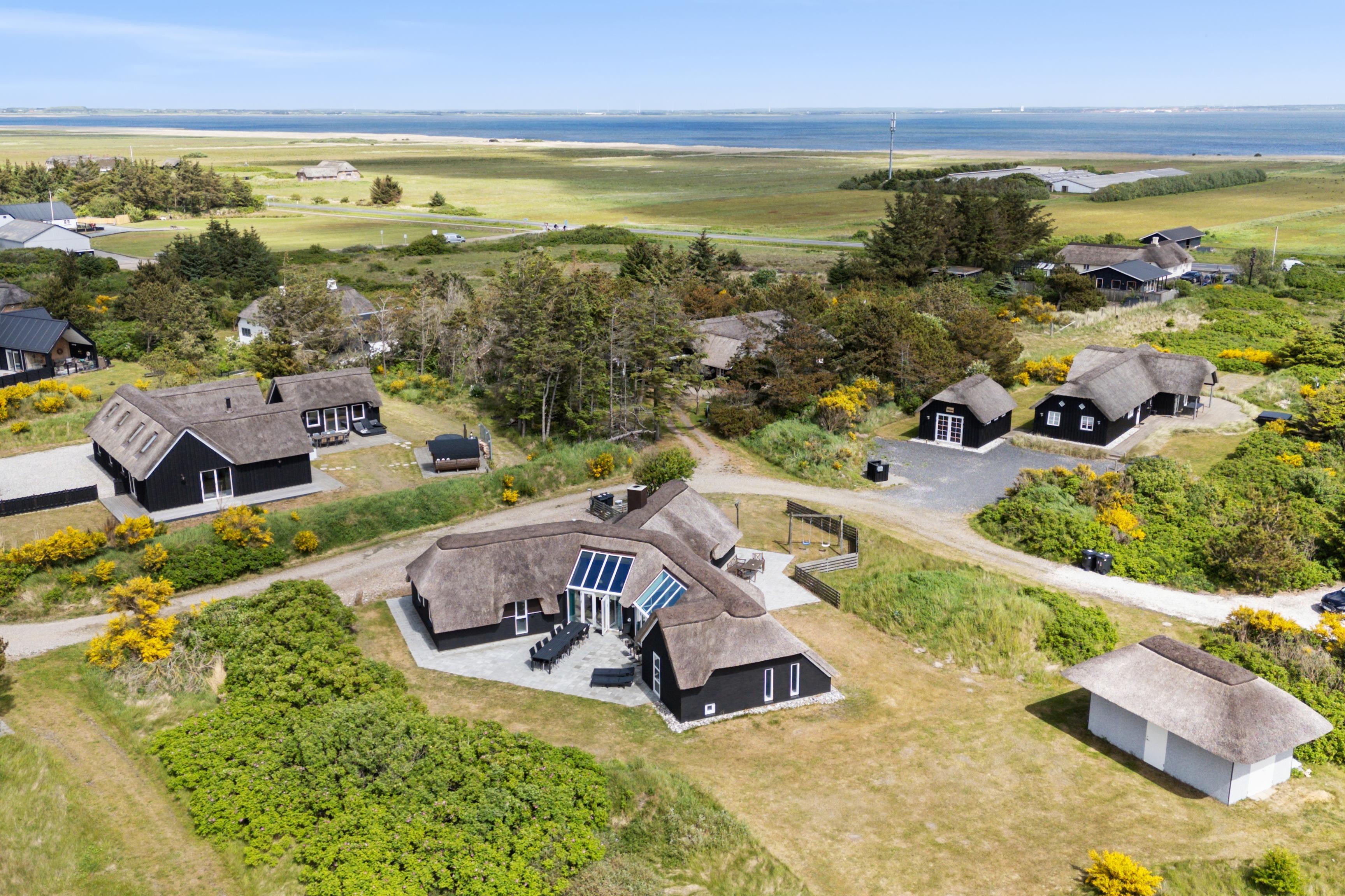 Velkommen til et skønt og rummeligt sommerhus med stråtag, indendørs swimmingpool og udendørs tøndesauna – ideelt til den store familie.