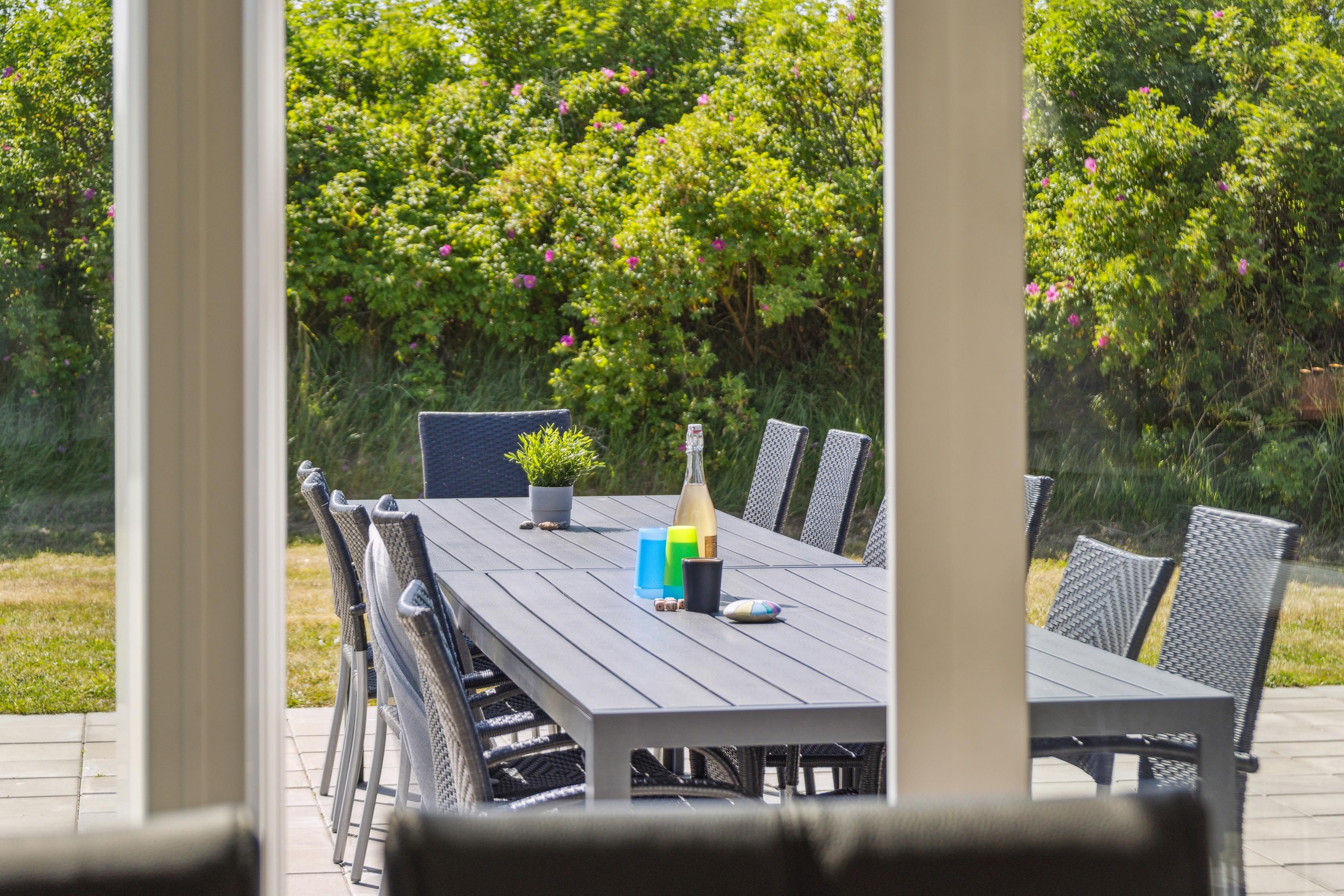 Med sine 185 m² byder huset på masser af plads, komfort og lækre faciliteter. Det store fællesrum danner rammen om ferien med åbent køkken, spiseplads og stue i ét. Her kan I samles til hyggelige måltider, spilaftener eller ren afslapning foran brændeovnen. På varme dage lokker terrassen, hvor I kan nyde grillmad og sol, mens børnene leger i haven med gynger og sandkasse.