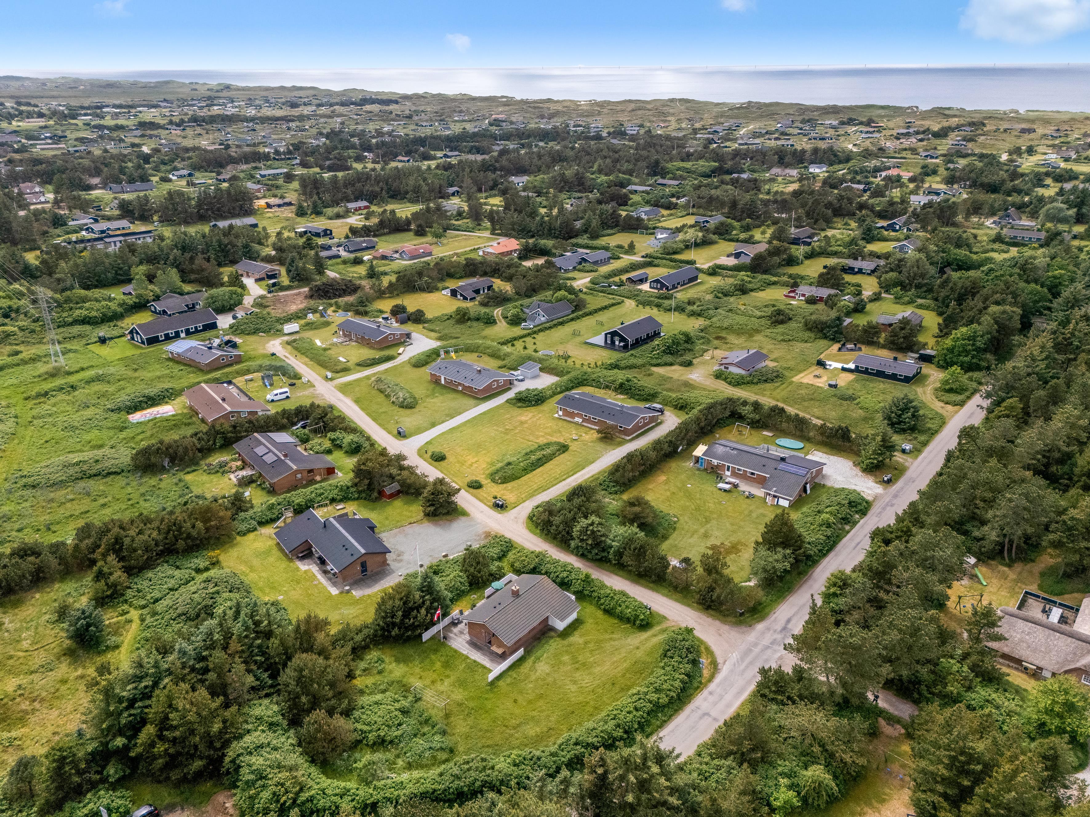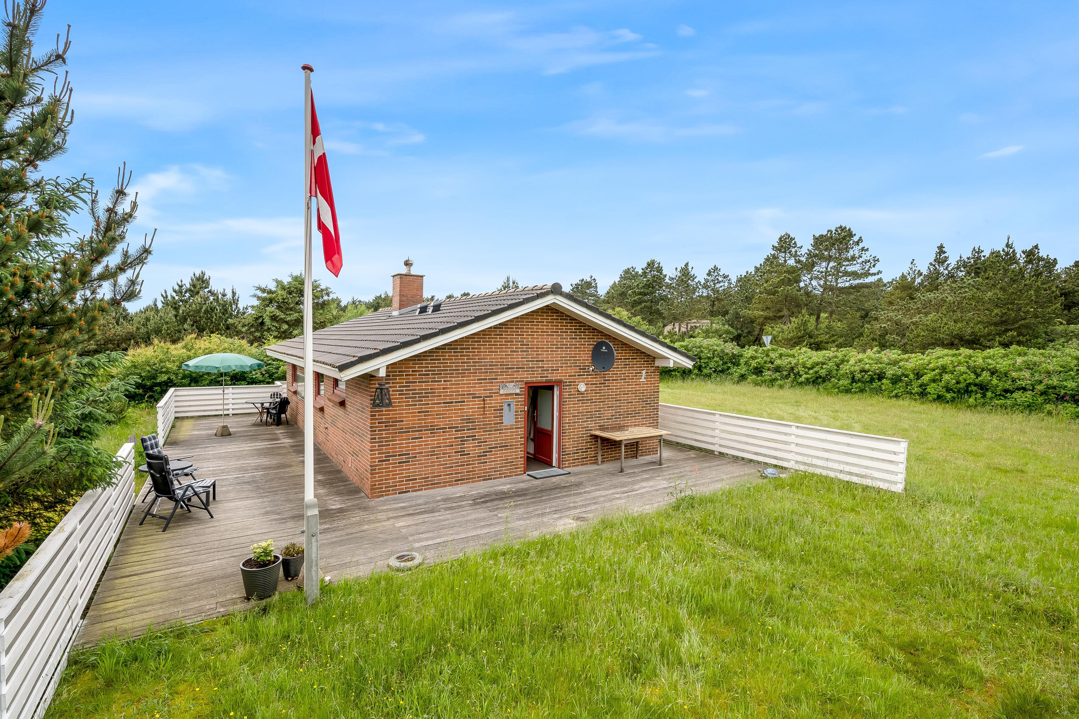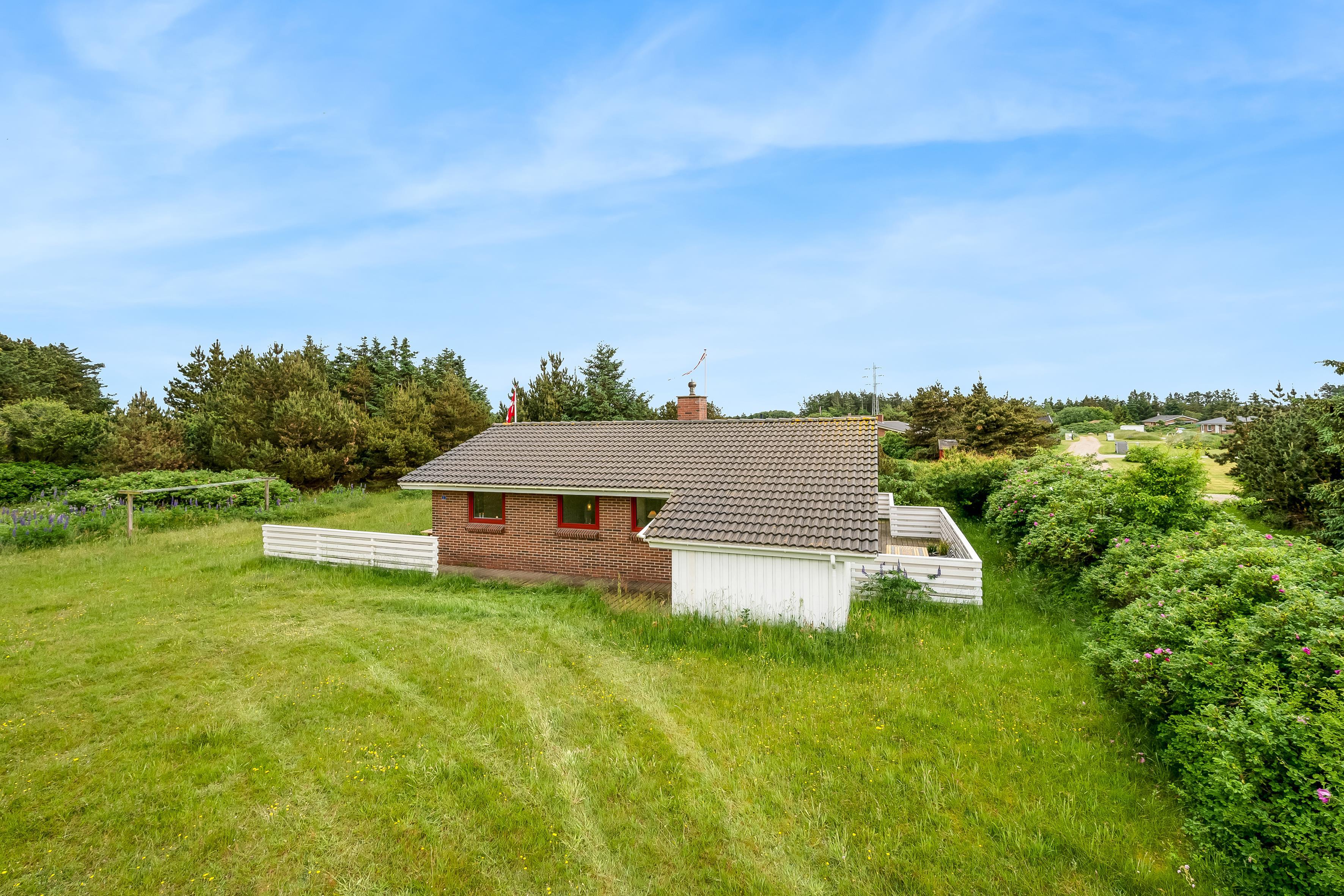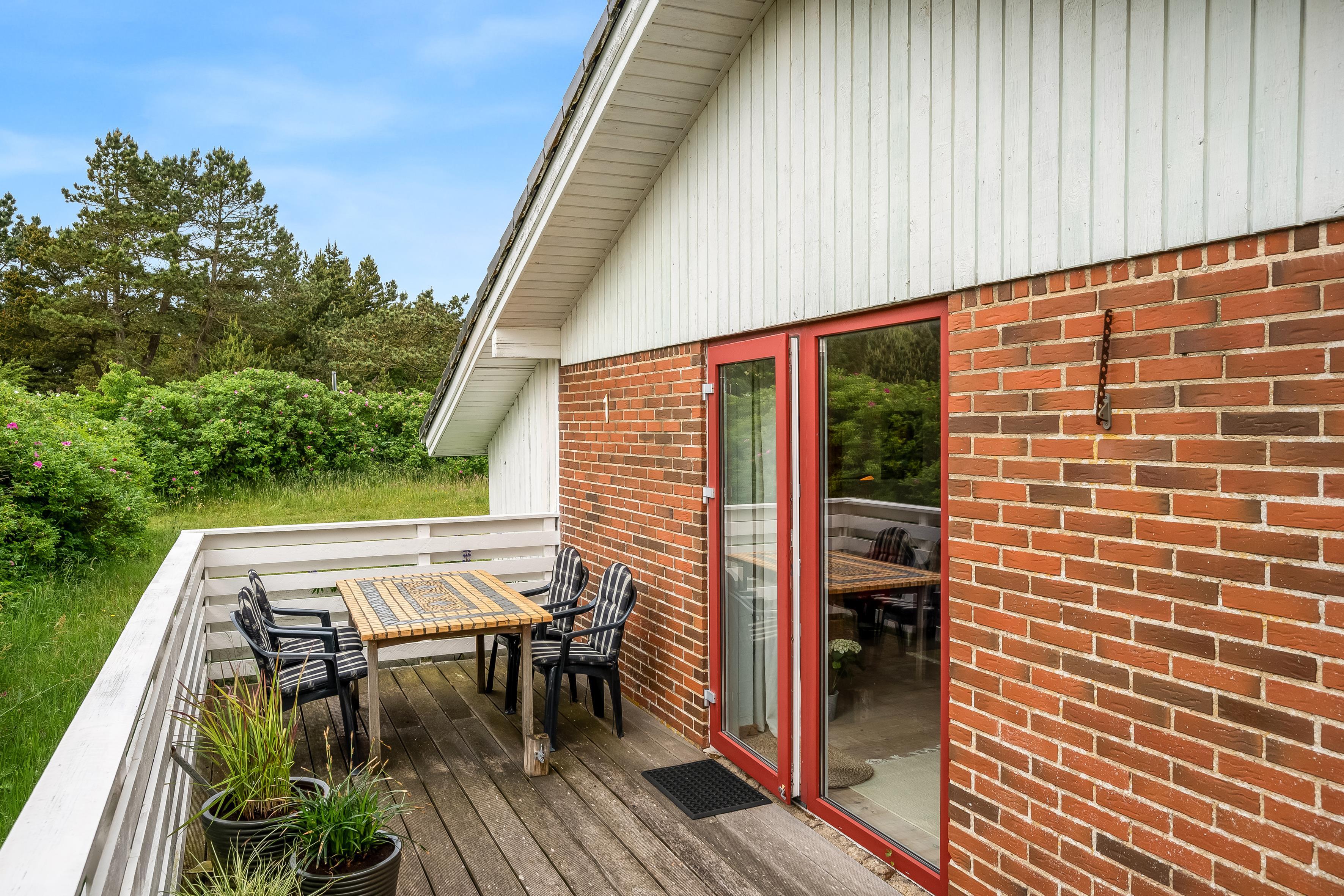 Den store terrasse strækker sig rundt om hele huset og er perfekt til afslapning og udendørs spisning, hvor I kan nyde solen og den friske havluft. Selv på mere blæsende dage finder I et beskyttet sted her. Omgivet af rosenbuske har I også naturlig privatliv og kan sole jer på den store græsplæne. Feriehuset ligger i gåafstand fra Vesterhavet, så I nemt kan tage en tur til stranden og nyde de brusende bølger.