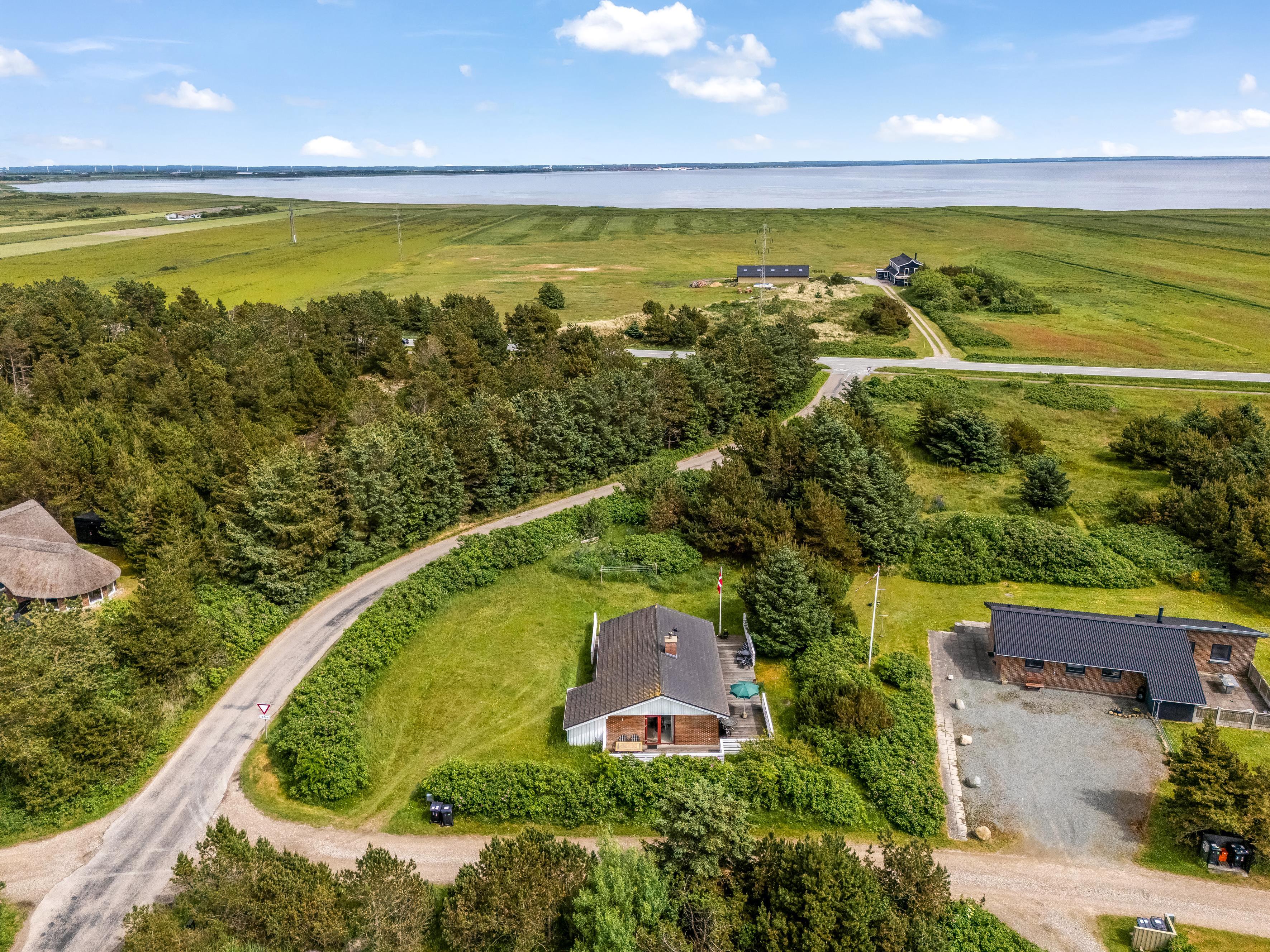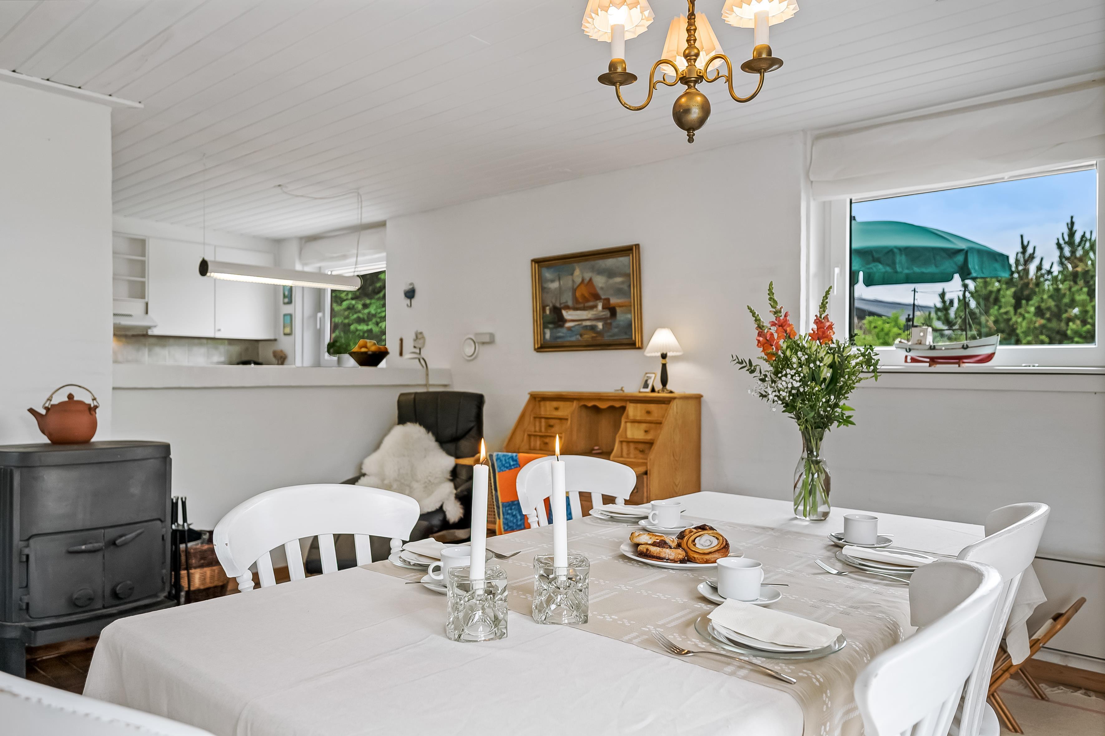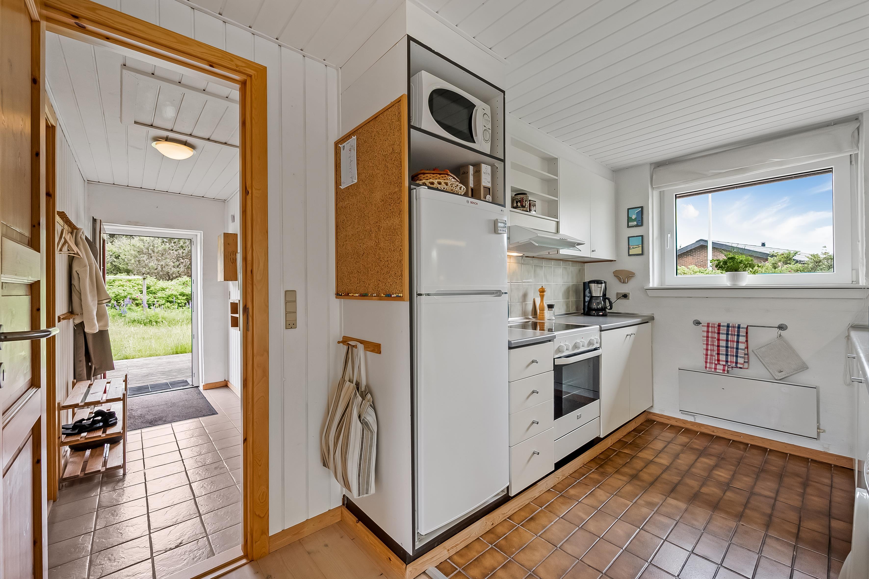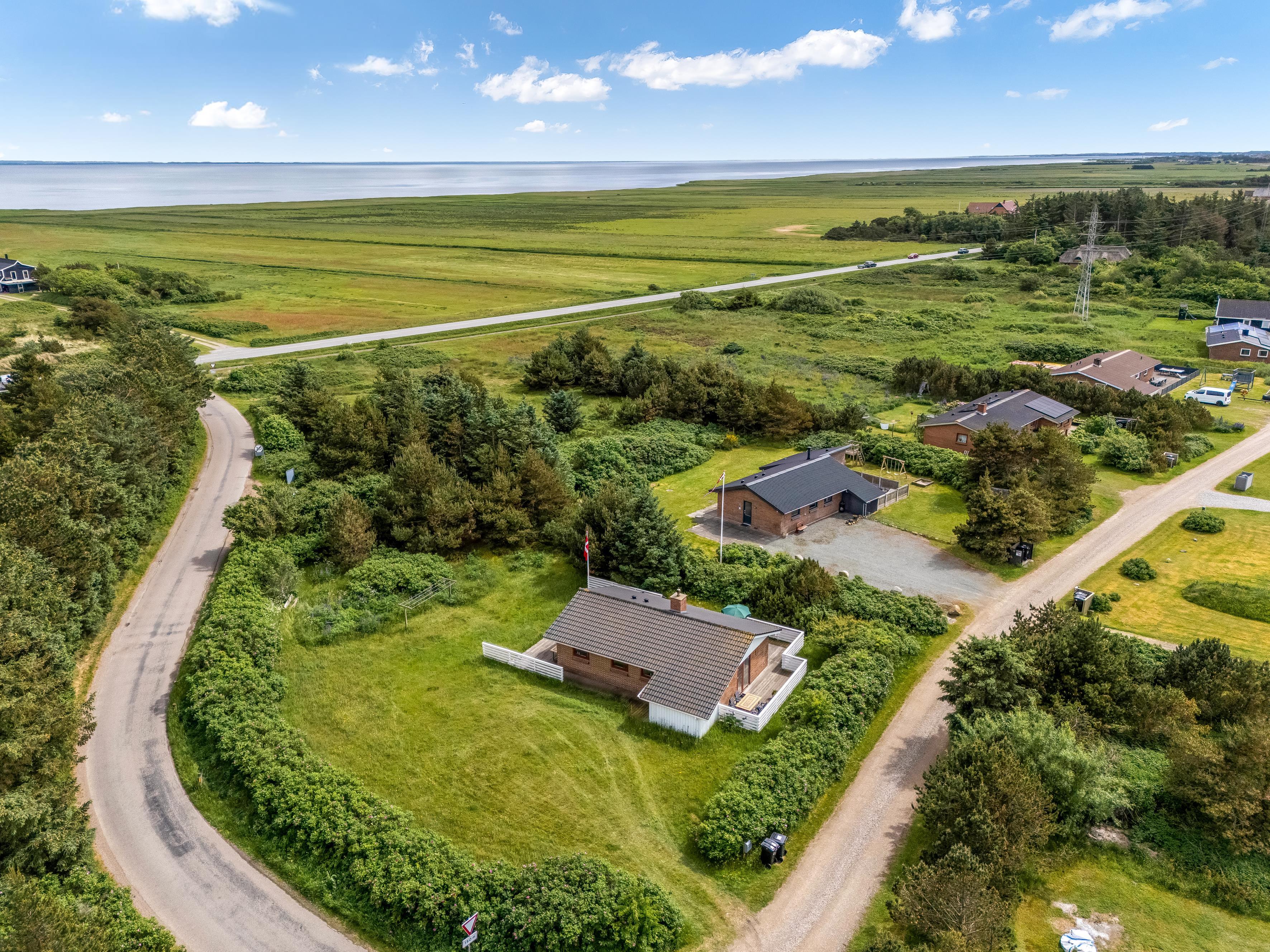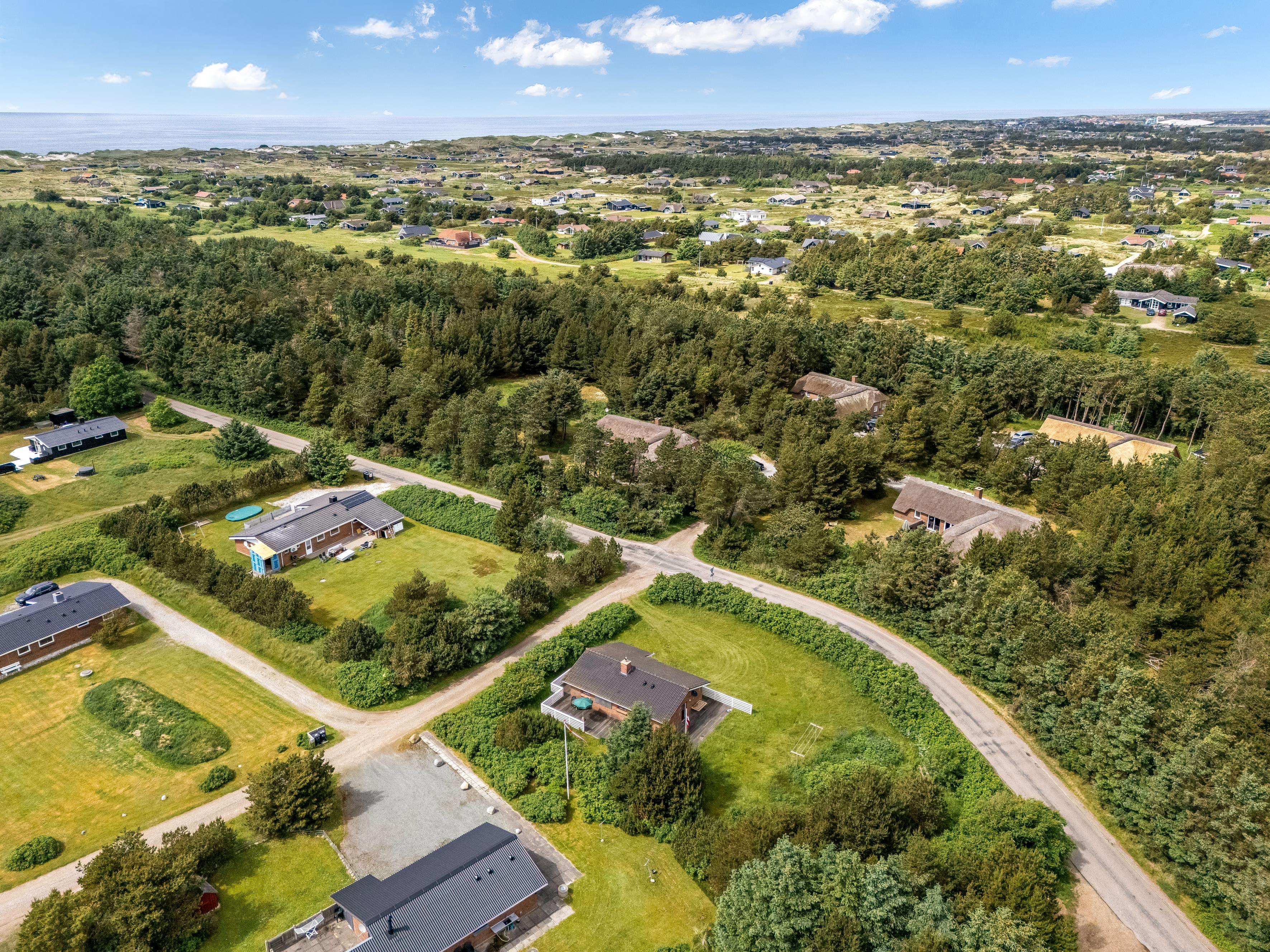 Den store terrasse strækker sig rundt om hele huset og er perfekt til afslapning og udendørs spisning, hvor I kan nyde solen og den friske havluft. Selv på mere blæsende dage finder I et beskyttet sted her. Omgivet af rosenbuske har I også naturlig privatliv og kan sole jer på den store græsplæne. Feriehuset ligger i gåafstand fra Vesterhavet, så I nemt kan tage en tur til stranden og nyde de brusende bølger.