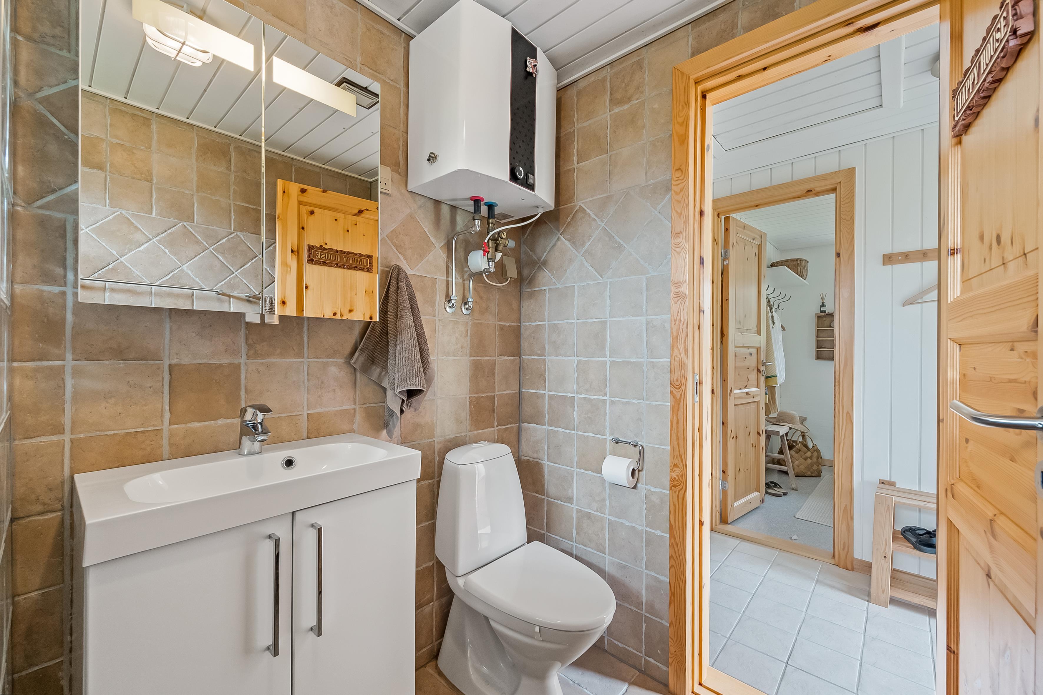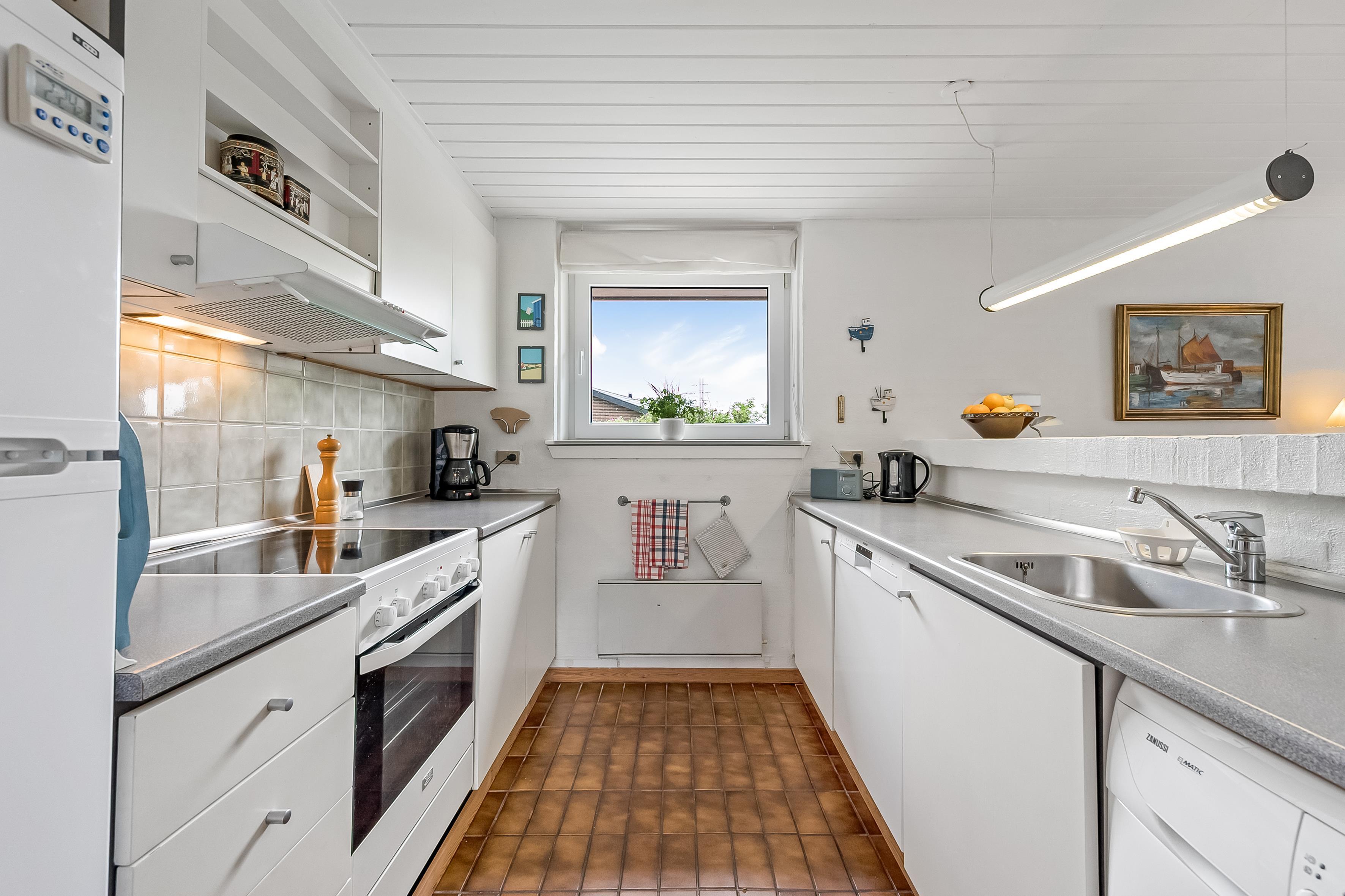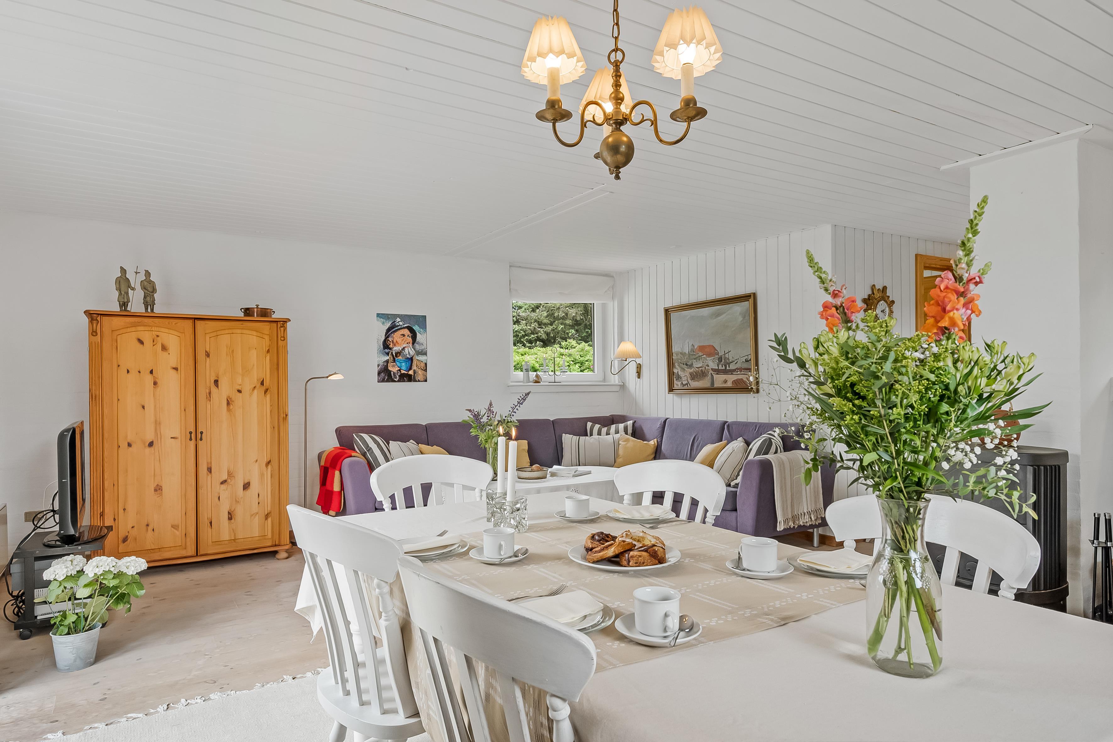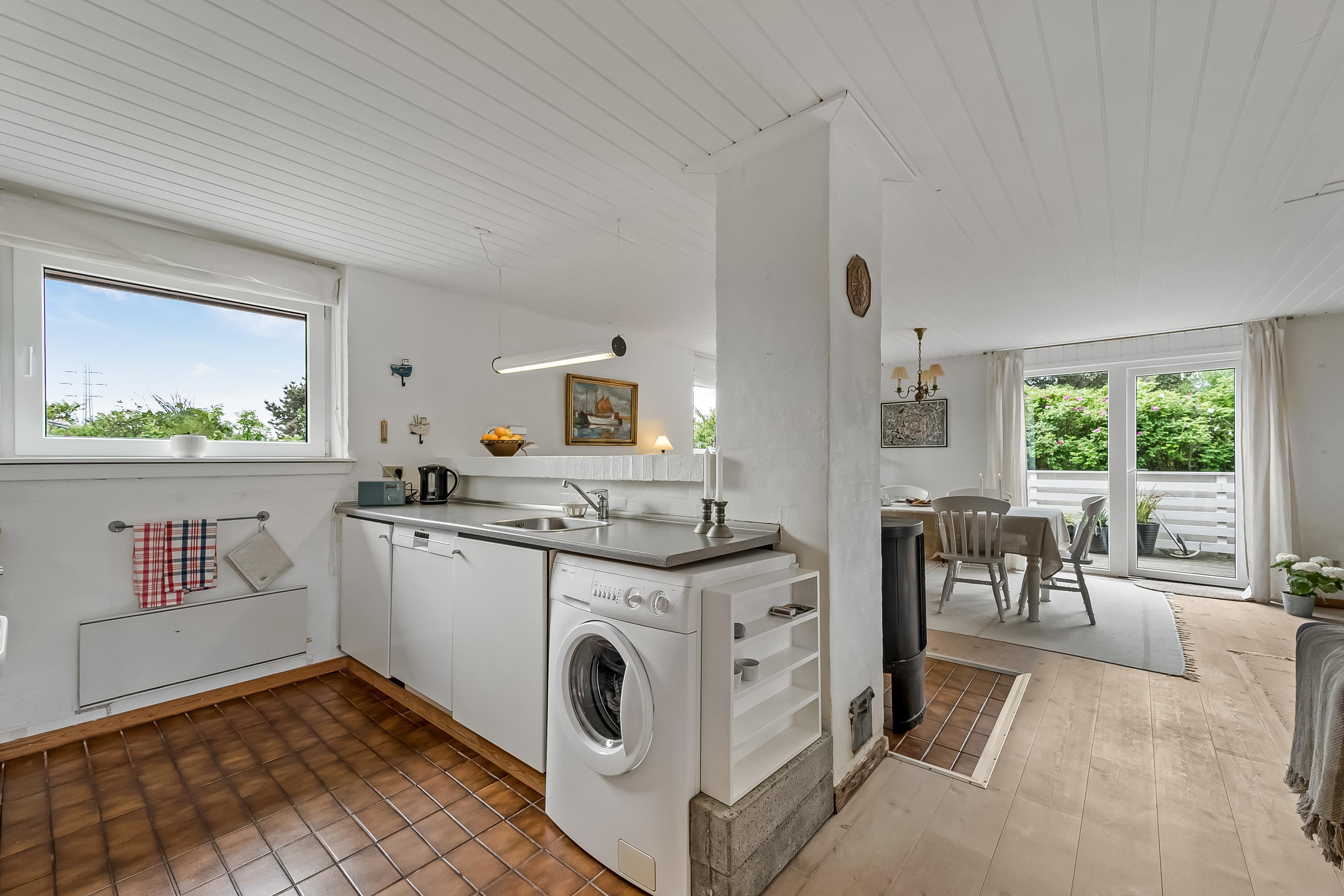 Det åbne opholds-/køkkenområde skaber en hyggelig atmosfære – perfekt til at tilbringe tid med familie, venner eller blot som et par. Nyd varmen fra brændeovnen på kølige aftener, og lyt til knitren af ??brændet, mens flammerne blafrer. Feriehuset er udstyret med tv, parabolantenne og Chromecast. Hold dig forbundet med gratis Wi-Fi for at dele dine oplevelser, holde dig opdateret eller surfe på internettet. Det ene af de to soveværelser har en dobbeltseng, mens det andet har to enkeltsenge til en god nats søvn. Det mindre badeværelse har bruser og toilet. Bemærk venligst, at saunaen vist på plantegningen ikke er tilgængelig til brug. Køkkenet er veludstyret med keramisk kogeplade med fire blus, køleskab med en fryser på 39 liter og opvaskemaskine, der gør madlavningen til en fornøjelse. Du finder også vaskemaskinen her.