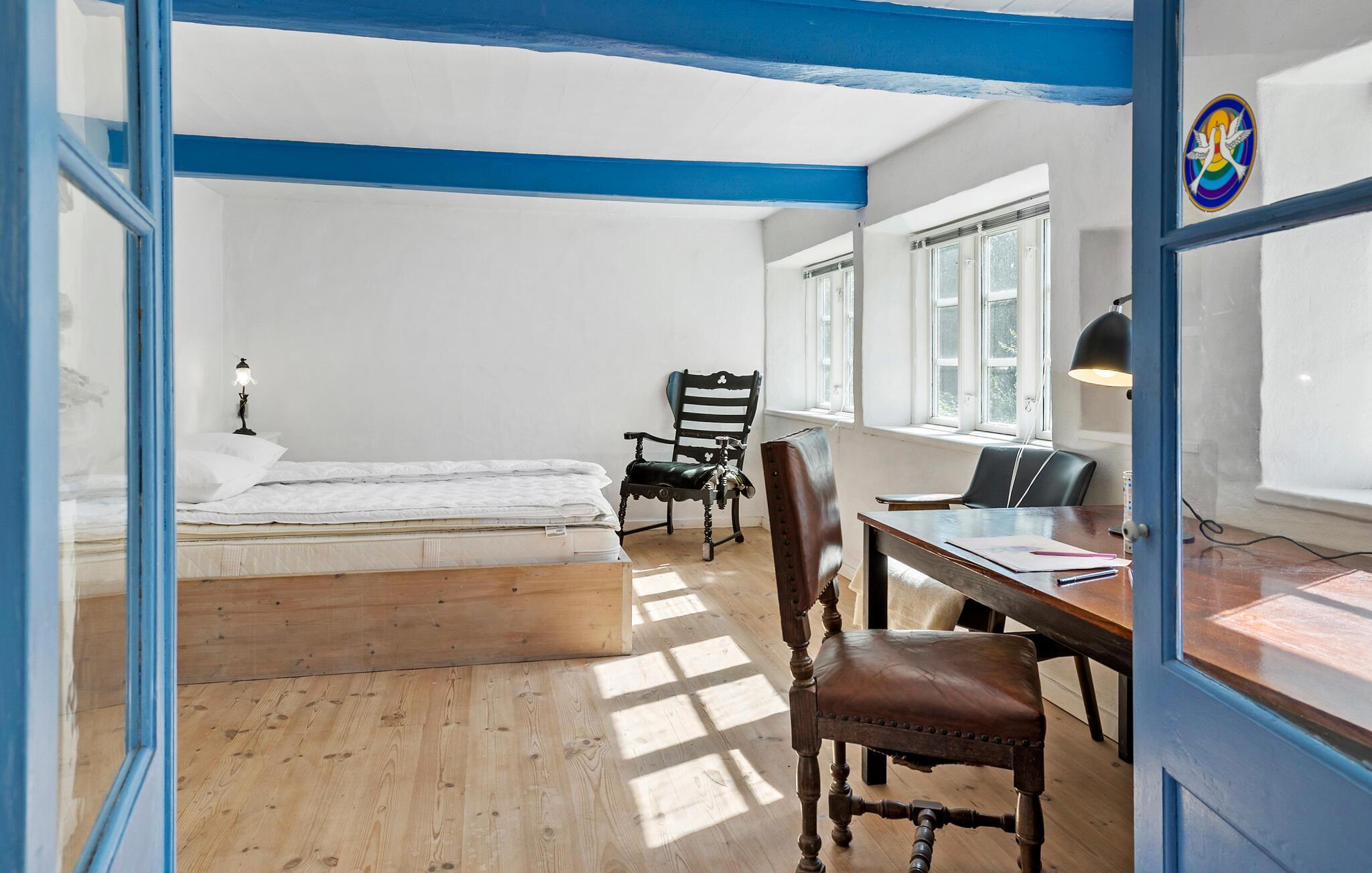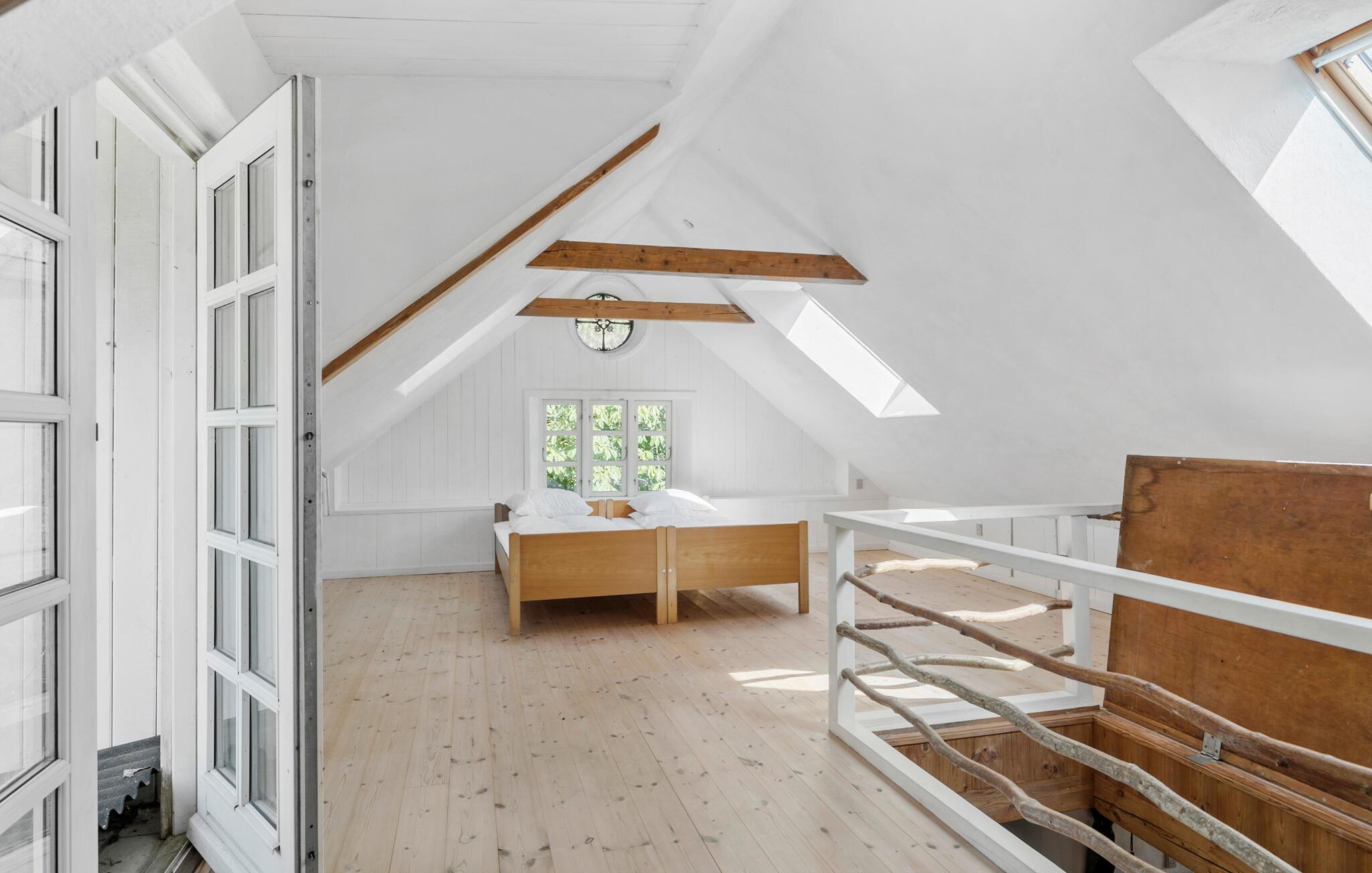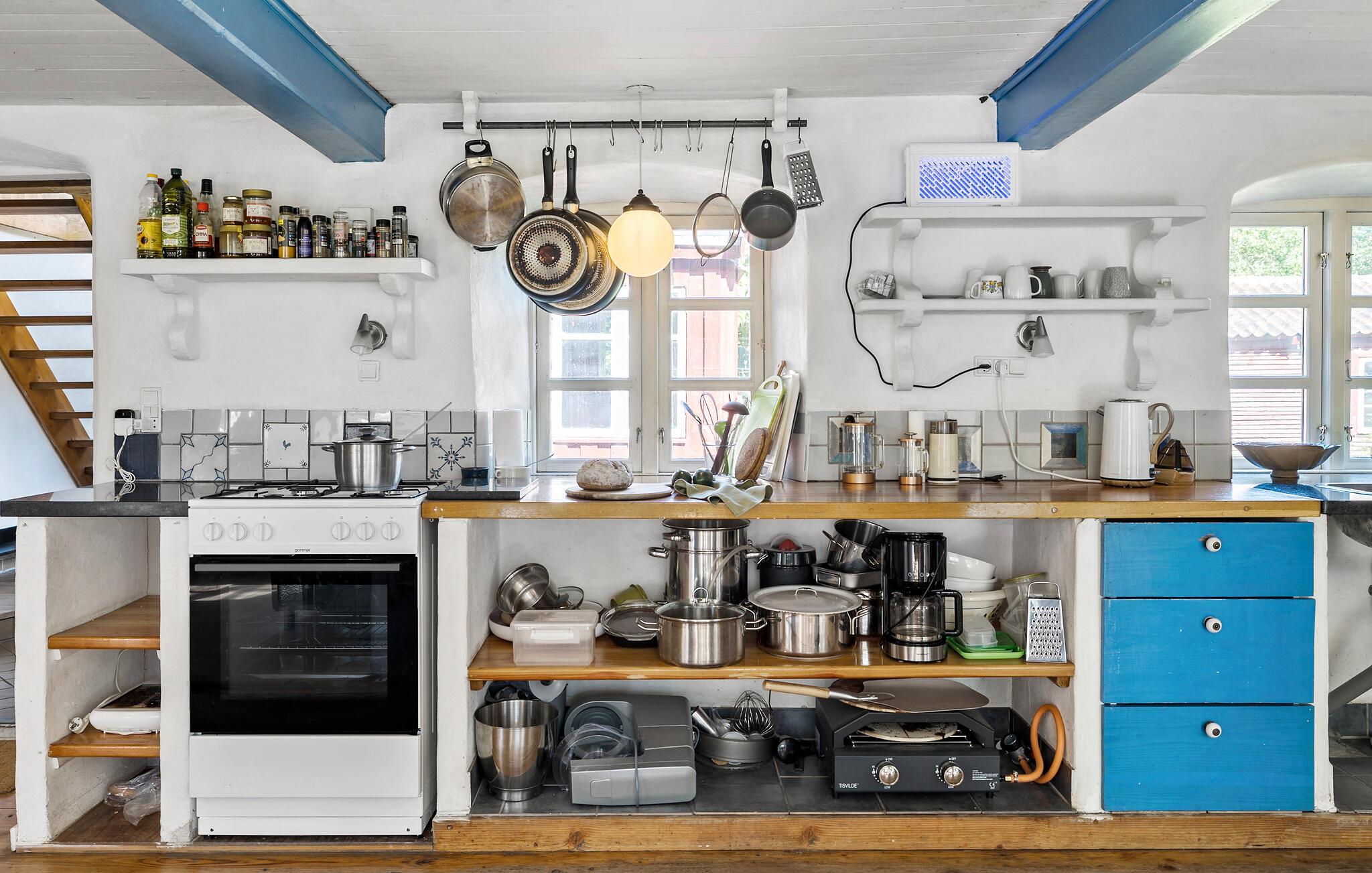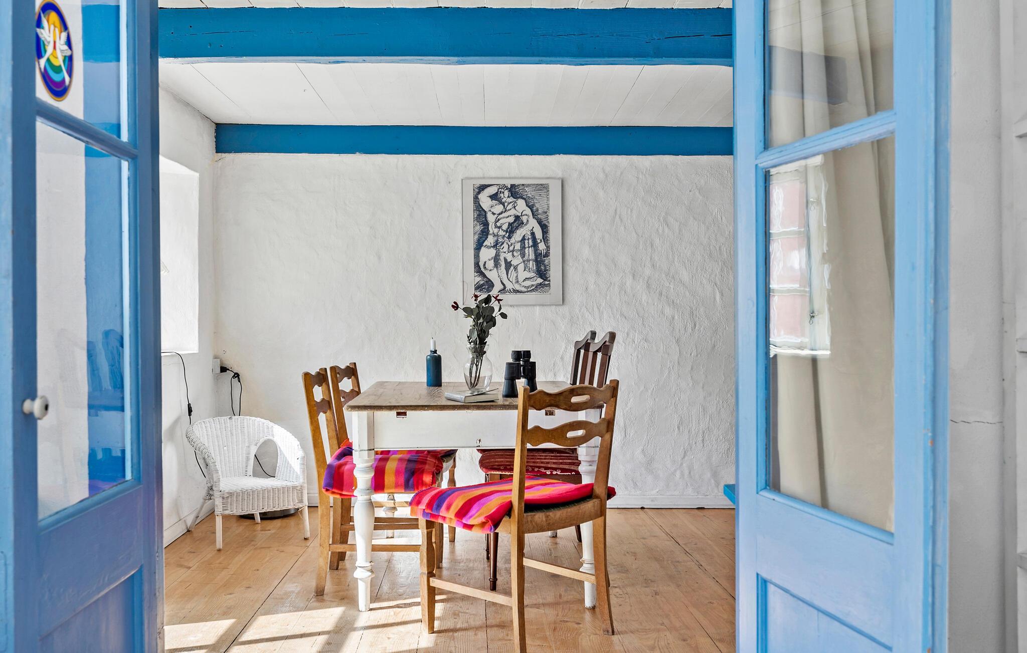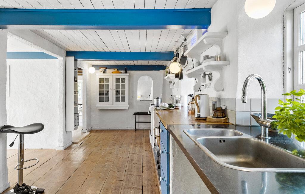 Der er mange fine detaljer i dette fine landhus, som ligger midt inde på øen i den nordlige ende af Bornholm. Her kan I nyde feriestunderne mellem flotte trælofter, karakterfulde gulve og en smuk kamin. Der er to etager med velindrettede opholdsrum og værelser, alt sammen med rustikke detaljer, hvilket giver jer en helt særlig ramme. Begynd dagene med morgenmad i det store landkøkken med brændeovn. Her kan I sidde og blive klar til dagen, mens I nyder udsigten gennem de sprossede vinduer ud mod det grønne.