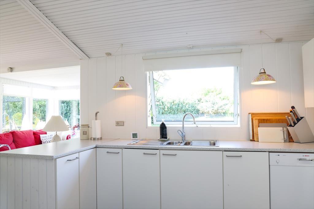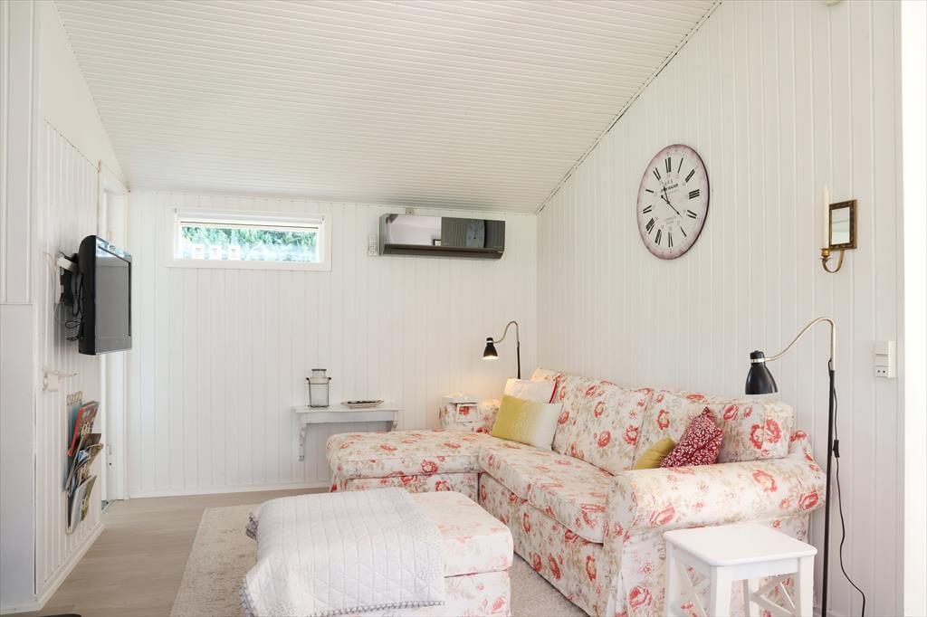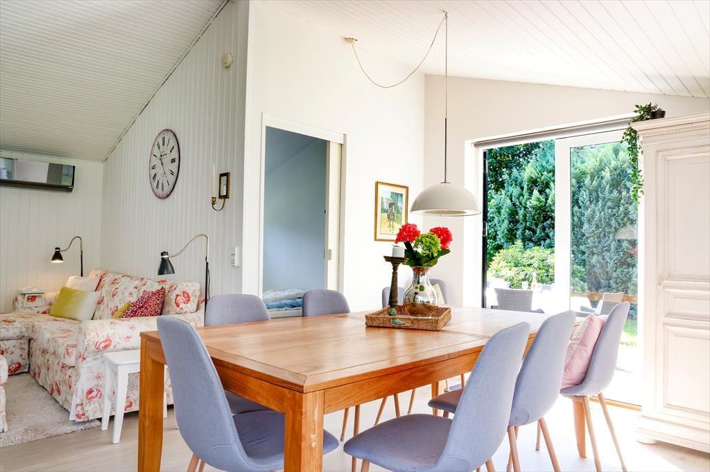 I sommerhuset fornemmes en god atmosfære der bringer feriestemningen frem. Sommerhuset har en god planløsning med værelser og badeværelser i hver sin ende af huset. Der er desuden et godt opholdsrum med flere hyggelige afdelinger, hvor hver især kan sidde og hygge sig med forskellige spil som er i huset, eller der kan slappes af med en god bog eller foran tv med et godt glas vin. Der er god plads i køkkenet så I kan være fælles om madlavningen og der er udgang til terrasse fra spiseafdelingen.