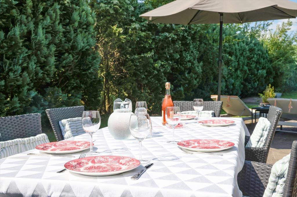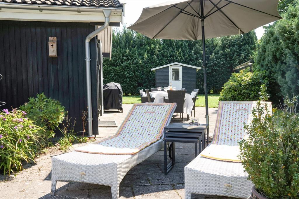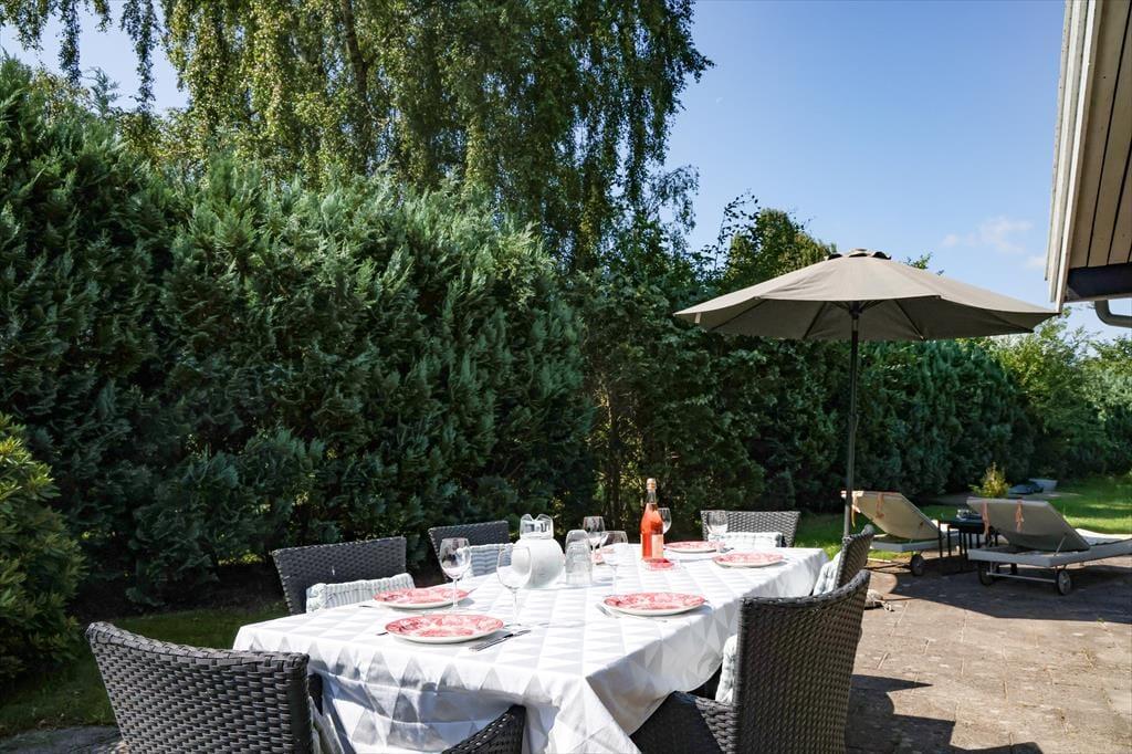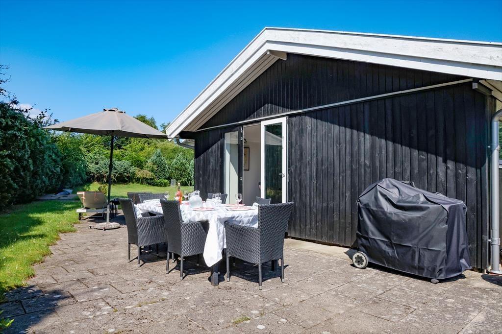 Sommerhuset er beliggende på en stor ugeneret grund på en blind vej med god randbeplantning hele vejen rundt. Efter en lang dag kan de skønne sommeraftener nydes på den store overdækkede terrasse. Her der god plads til at samles til en hyggelig grillaften. Står dagen på ren og skær afslapning, så kan du slikke sol på en af sommerhuset liggestole. Selvom der solbades i haven på den ene side af huset, så er der stadig plads aktiviteter med medbragte havespil på den anden side. Er det tid til at tage en dukkert, så er der en badebro på Klint Strandvej ca. 1.500 meter fra sommerhuset.