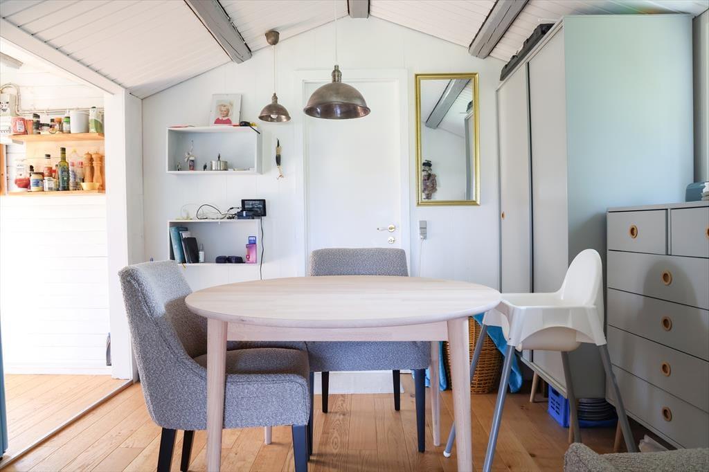 I sommerhuset fornemmes en hyggelig atmosfære der bringer feriestemningen frem. I stuen kan I sidde og nyde udsigten over det skønne naturareal og havet mod Kattegat. Her kan I også samles for at planlægge morgendagens begivenheder, slappe af med en god bog, eller udfordre hinanden i diverse medbragte brætspil. Fra køkkenet er der udgang til haven med havemøbler og grill.