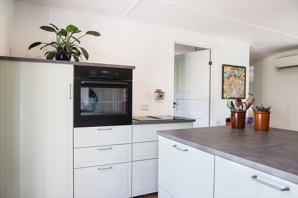 Sommerhuset fremstår lyst og indbydende. Sommerhusets hjerterum er køkken/alrummet, hvor mange gode stunder kan nydes med at tilberede en god middag i fællesskab, eller du kan bage boller med dine børnebørn. Fra køkken/alrummet er der adgang til stuen, hvor du kan fordybe dig i en spændende bog, imens du lytter til knitren fra brændeovnen. I huset er der også 4 gode soveværelser og et dejligt badeværelse.