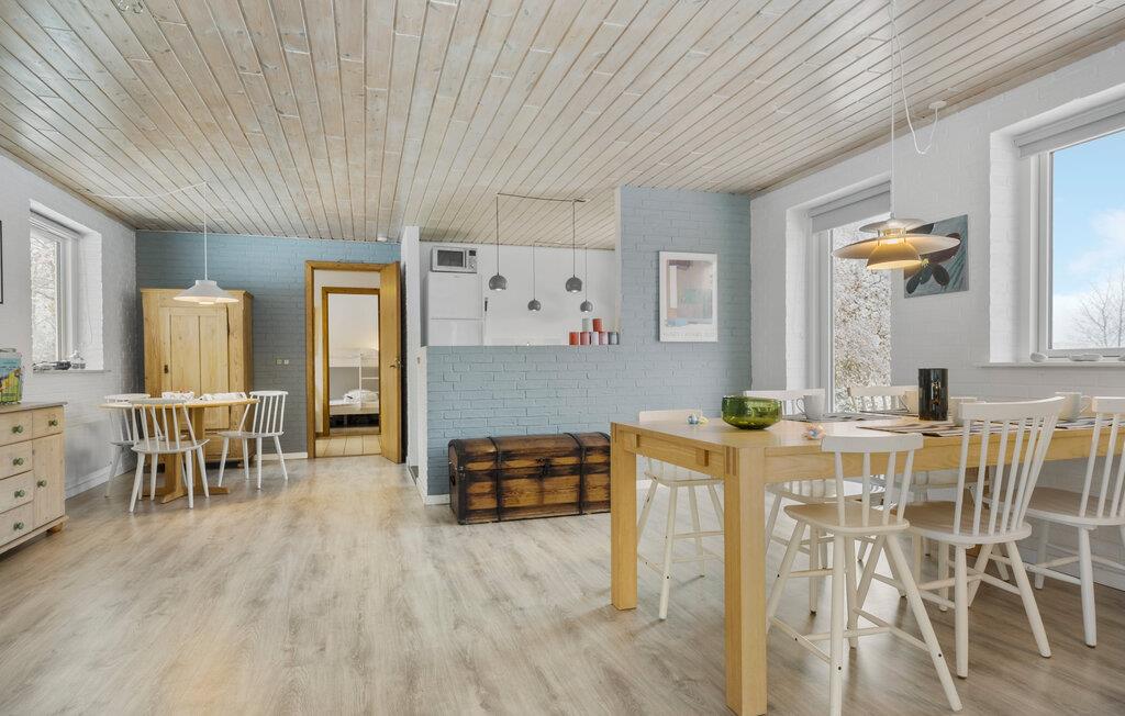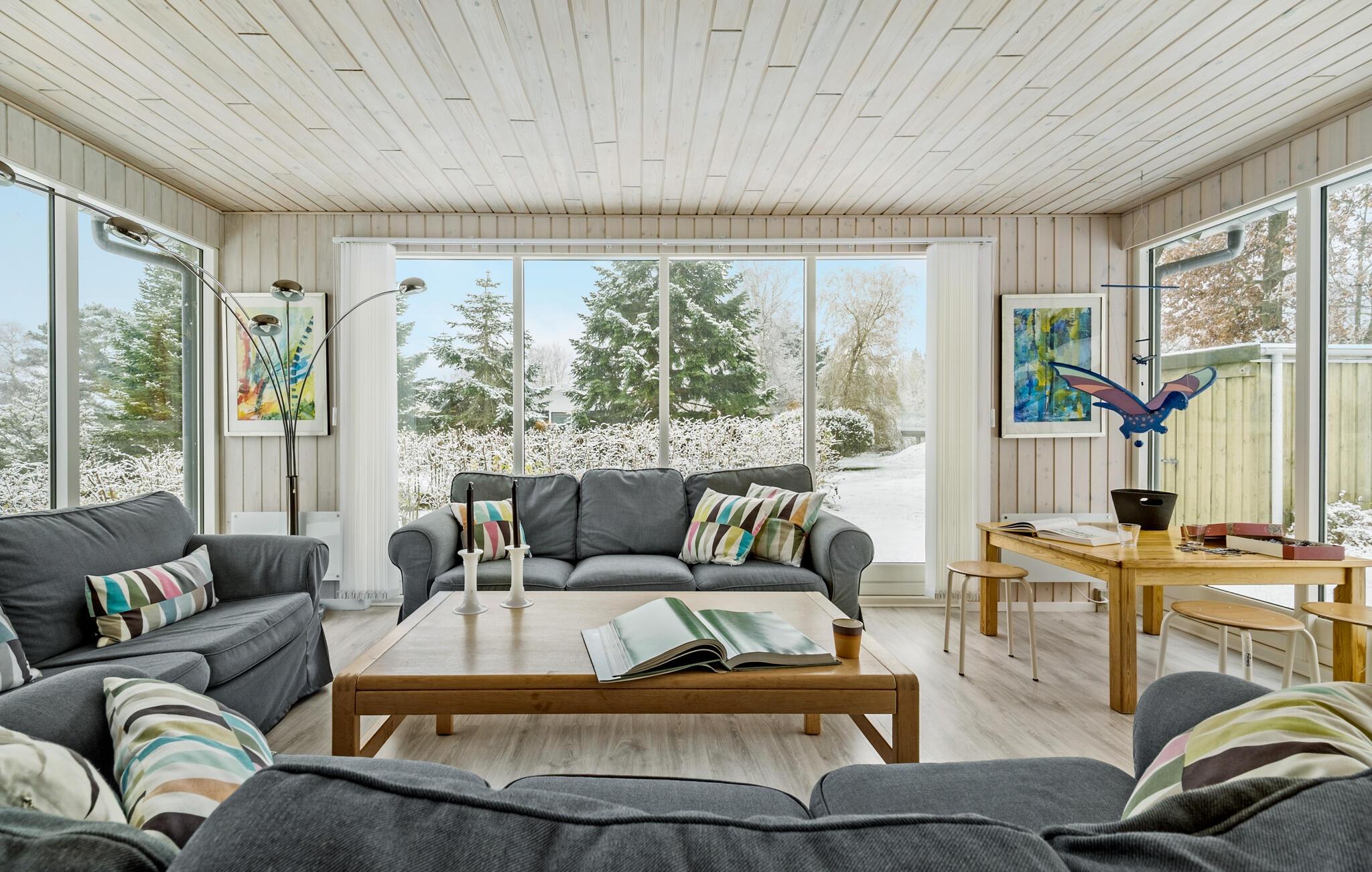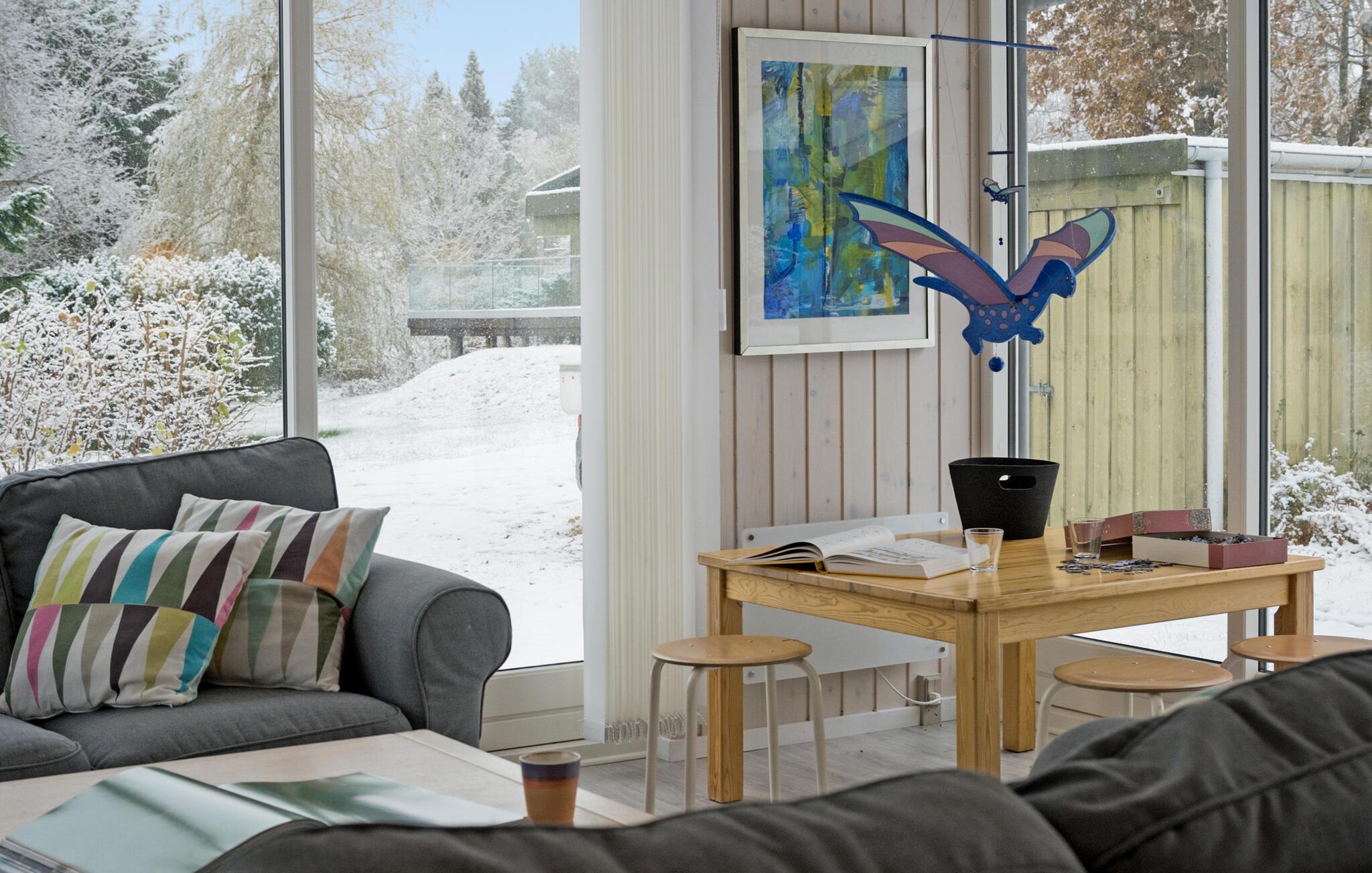 Glæd jer til en hyggelig ferie med jeres kære i dette familievenlige sommerhuss lysfyldte, smagfuldt indrettede opholdsstue. Fejr måltiderne sammen i den indbydende spiseplads og tilbring harmoniske spilleaftener i det komfortable sofaområde med udsigt til det grønne.