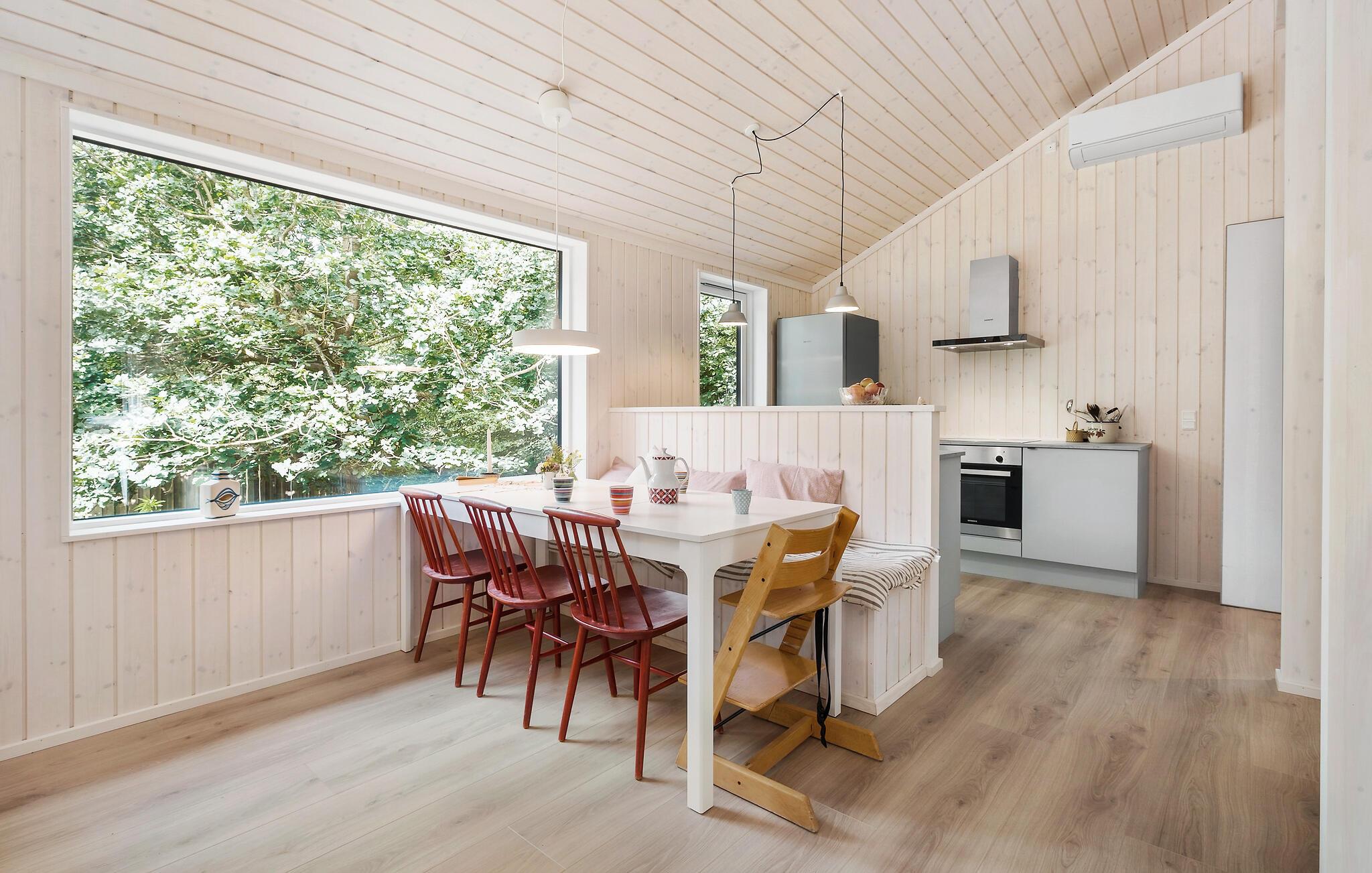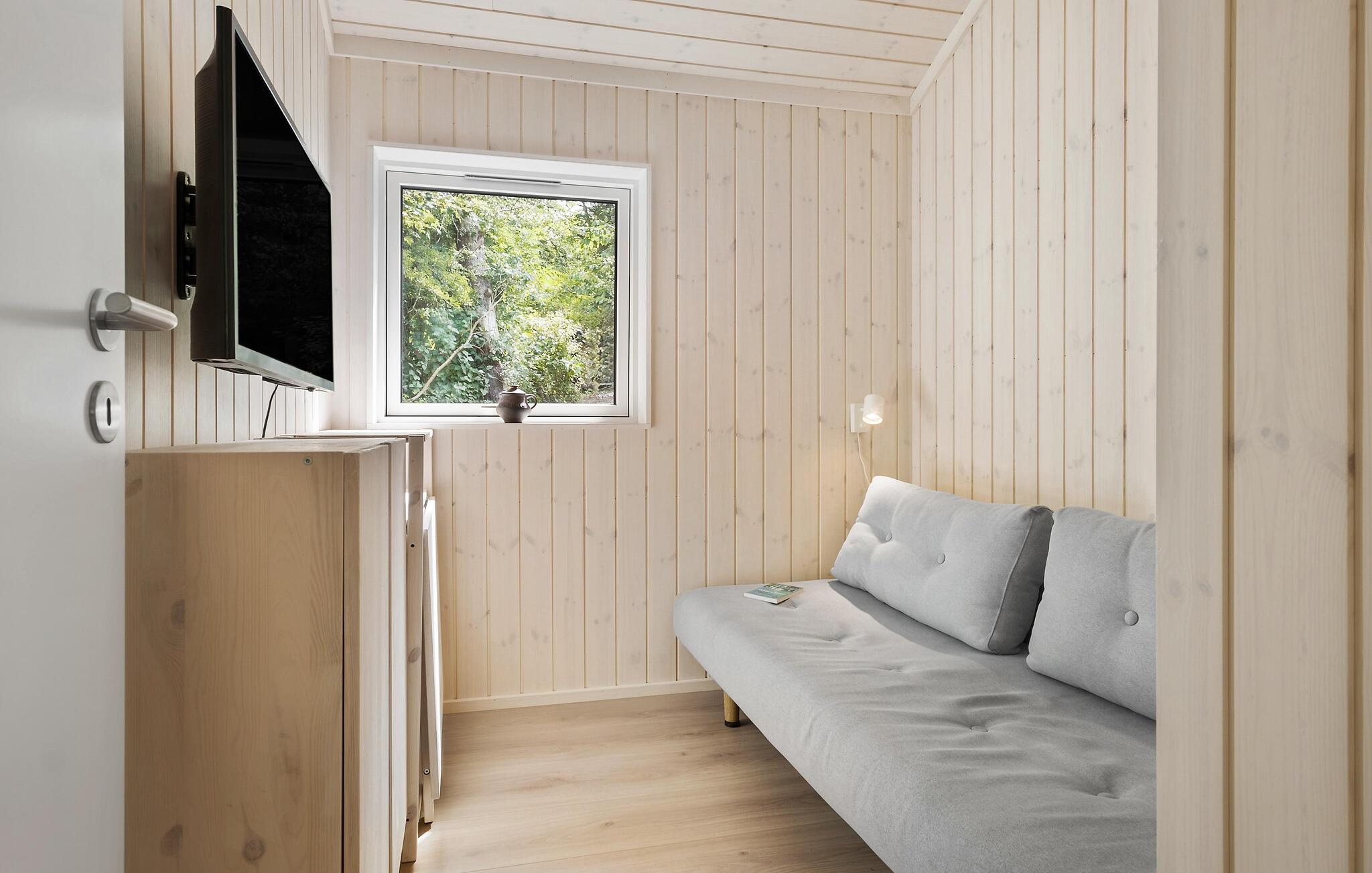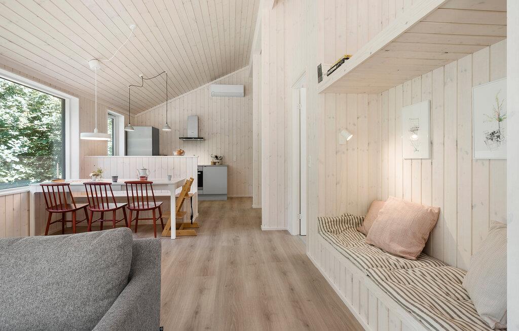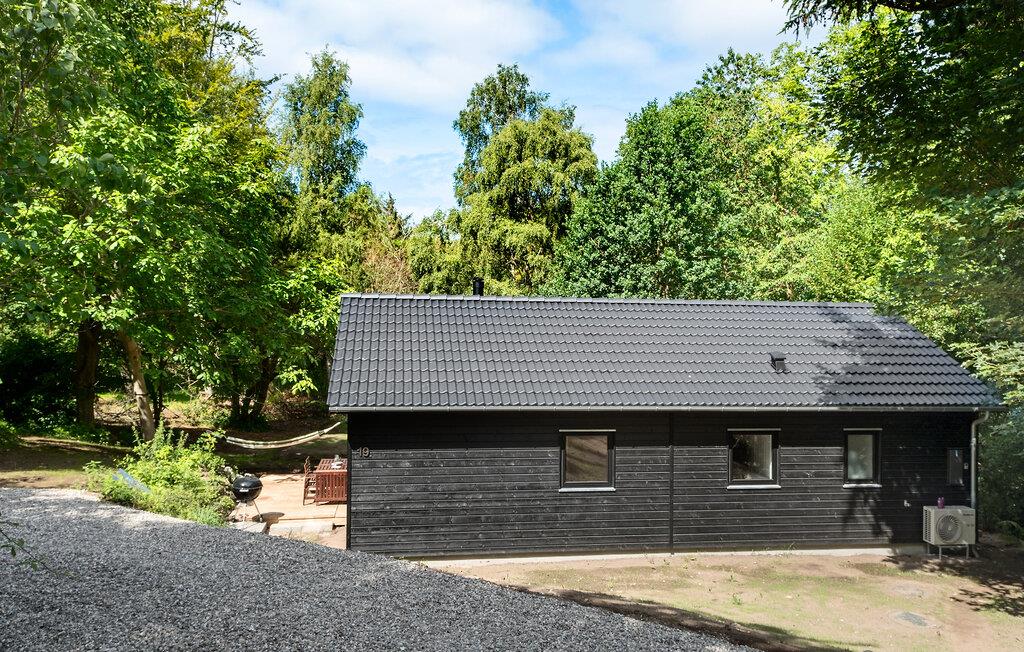 Beliggende i et lille skovområde byder dette charmerende feriehus nær Klint Strand jer velkommen til en rolige ferie midt i idylliske omgivelser. Huset udstråler hygge og varme, blandt andet med en indbydende sofa, der er perfekt til afslapning og fordybelse foran brændeovnen. Fra stuen kan I nyde udsigten til den velplejede have.