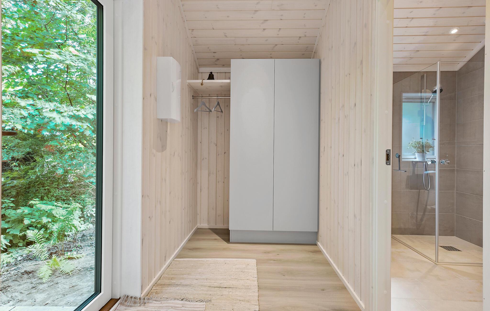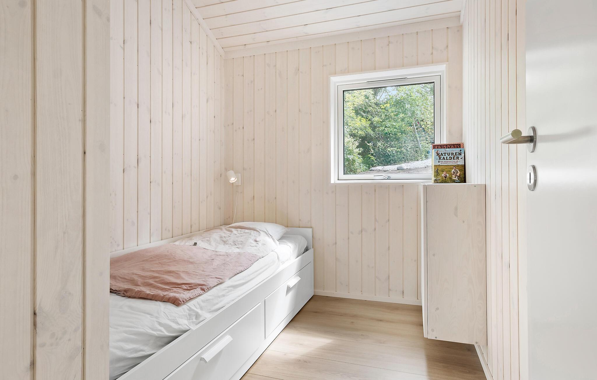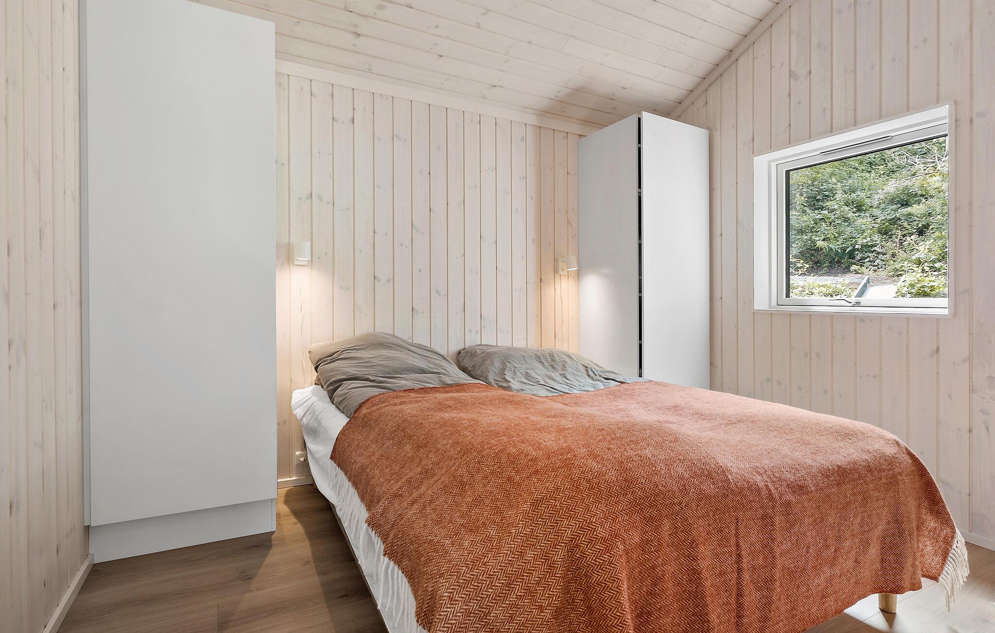 Beliggende i et lille skovområde byder dette charmerende feriehus nær Klint Strand jer velkommen til en rolige ferie midt i idylliske omgivelser. Huset udstråler hygge og varme, blandt andet med en indbydende sofa, der er perfekt til afslapning og fordybelse foran brændeovnen. Fra stuen kan I nyde udsigten til den velplejede have.