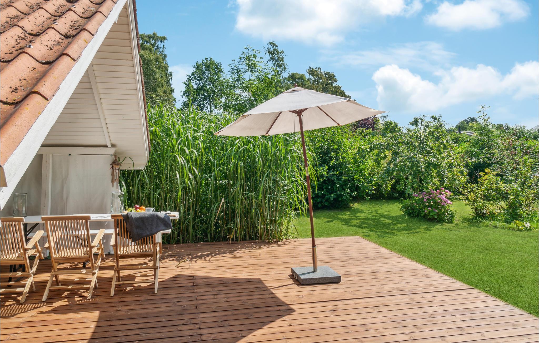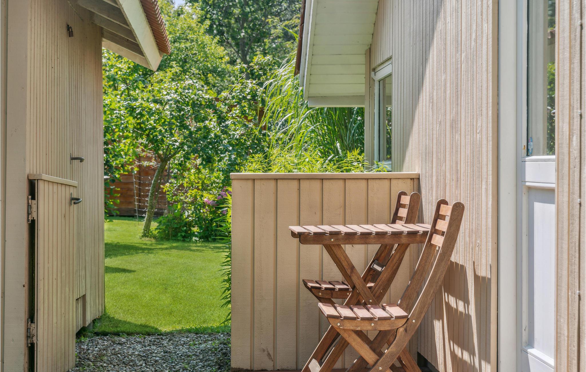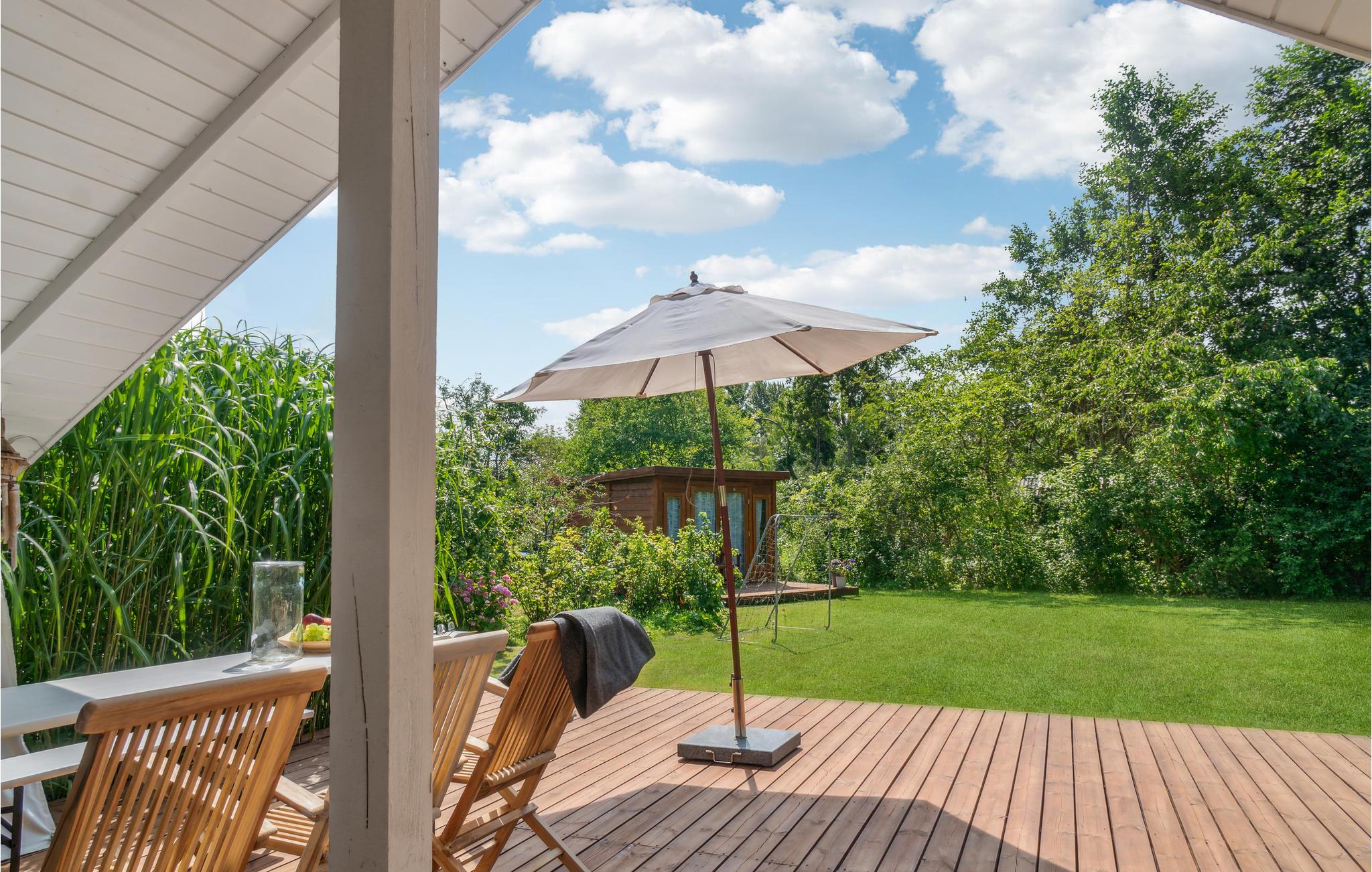 Om sommeren vil I helt sikkert tilbringe en stor del af jeres ferie på terrassen, som er udstyret med komfortable havemøbler til solbadning og udendørsspisning. I har selvfølgelig også en grill til rådighed, så I kan holde hyggelige grillaftener. Den store naturgrund er ideel til leg, boldspil og udendørsspil såsom kubb/vikingespil og petanque.