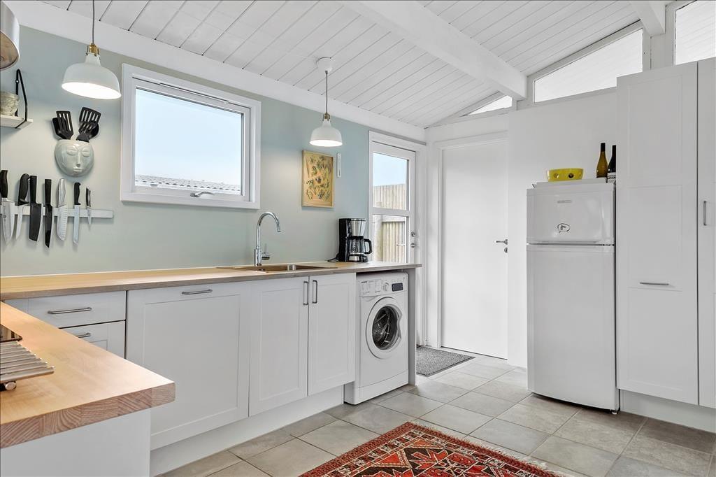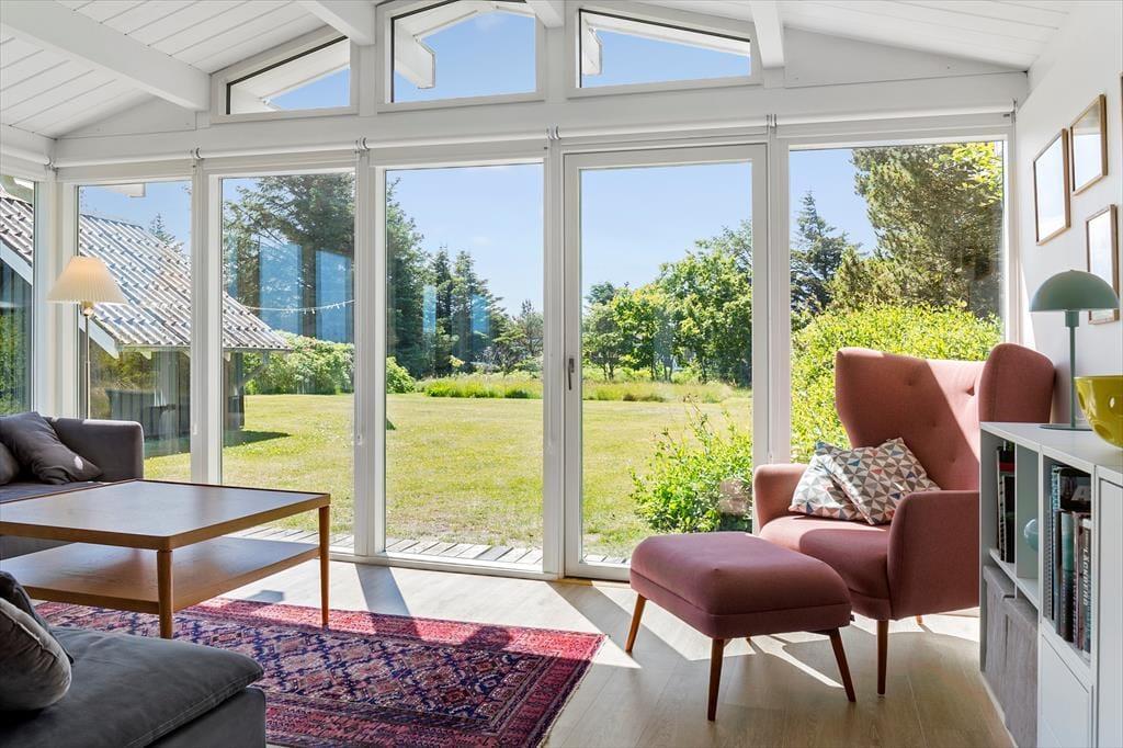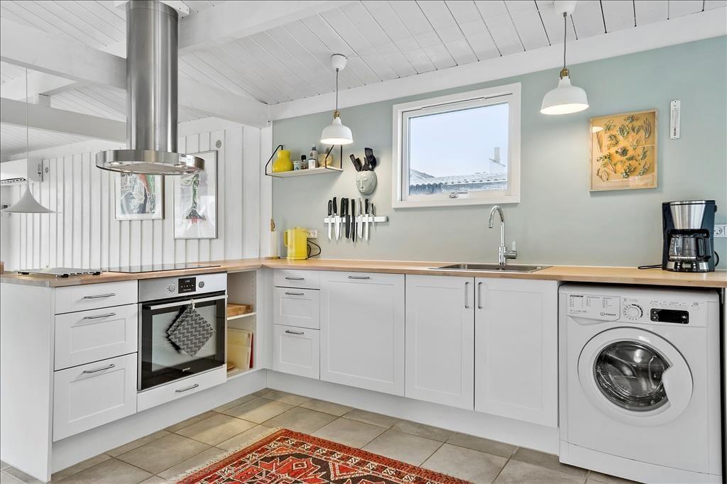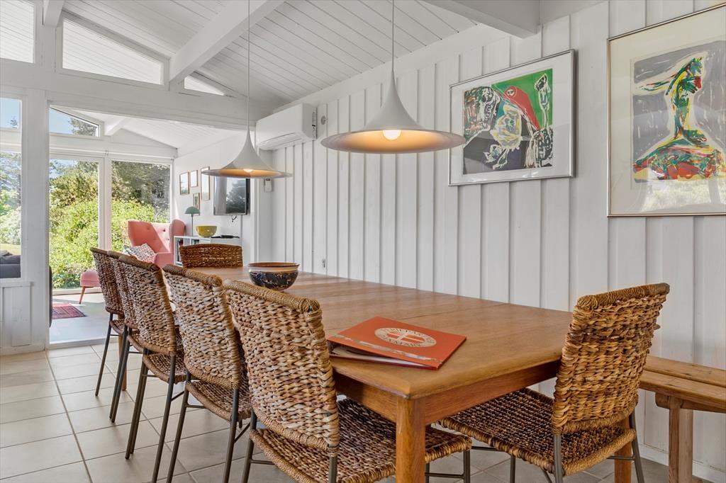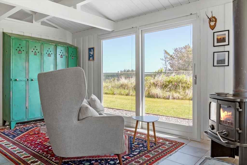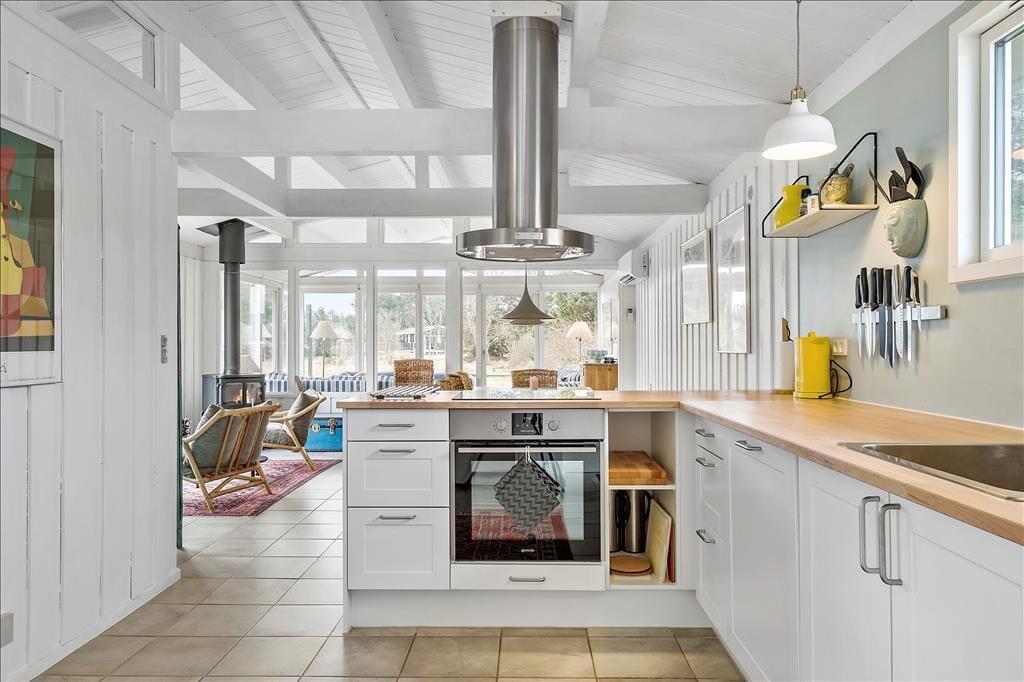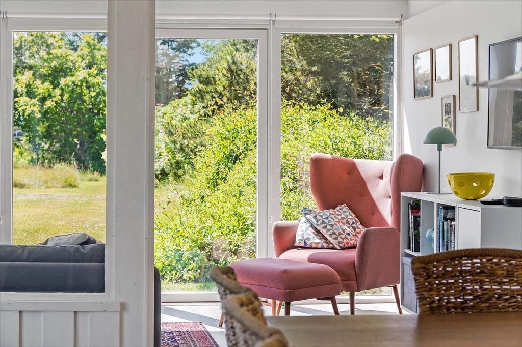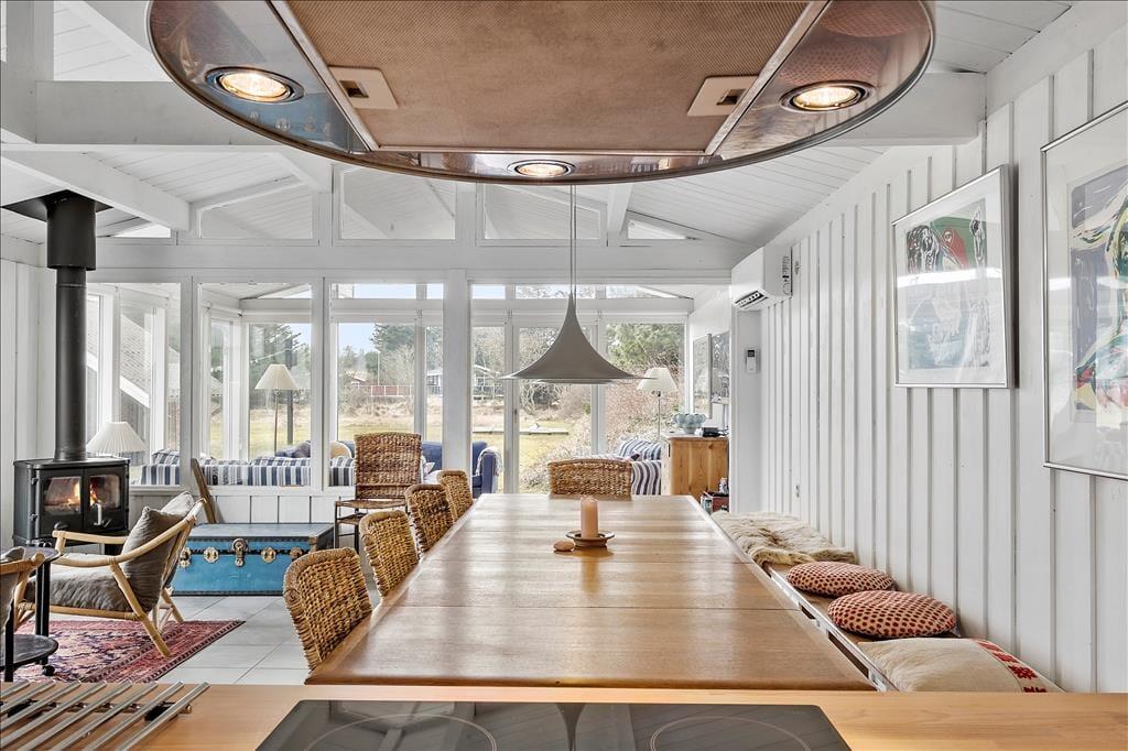 Træd ind i et sommerhus, der byder på lys, varme og en umiddelbar følelse af hjemlig hygge. De store vinduespartier inviterer lyset indenfor og skaber en smuk forbindelse til omgivelserne. Stuen er sommerhusets hjerte, hvor brændeovnen knitrer og spreder en dejlig varme på kølige aftener. Her kan du samles med dine nærmeste og lade roen sænke sig, mens naturen udenfor danner en malerisk baggrund. Køkkenet er funktionelt og integreret med spisepladsen, hvilket gør det nemt og hyggeligt at lave mad sammen. Alt i alt er dette et sted, hvor du kan trække stikket og nyde en ferie med fokus på nærvær og afslapning.