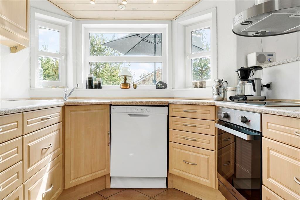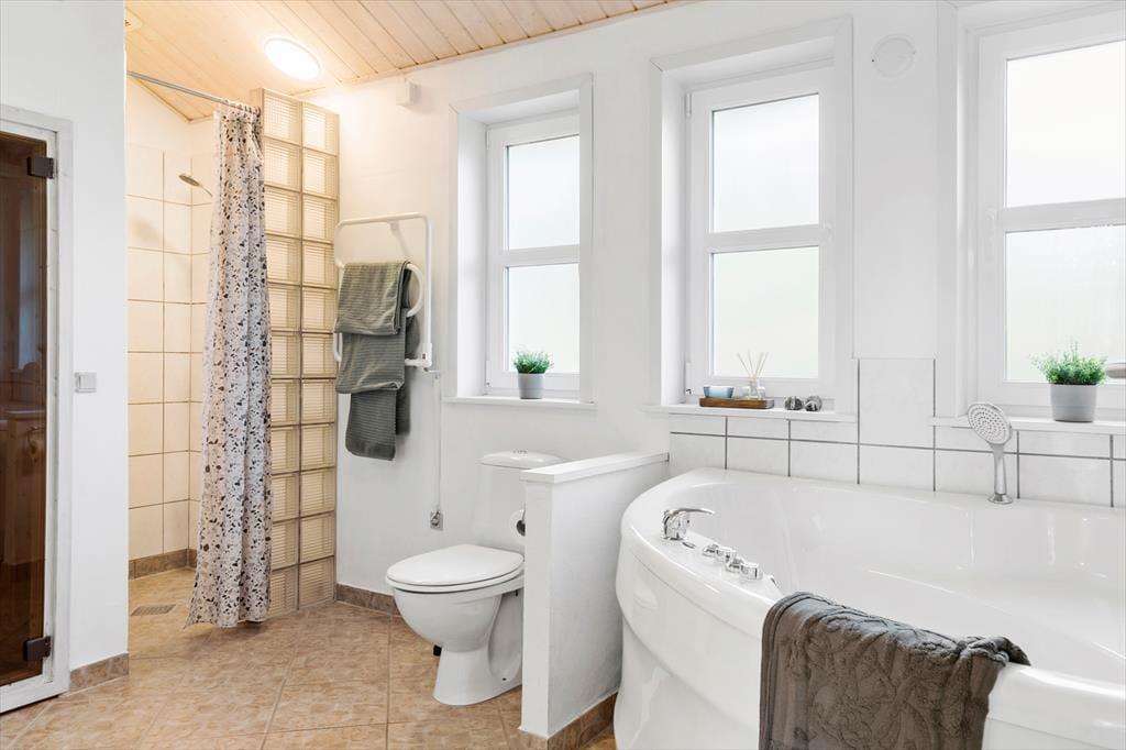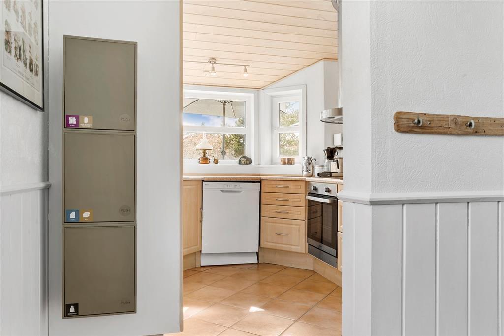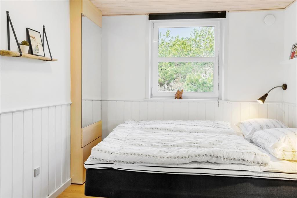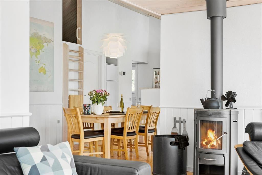 Indenfor byder sommerhuset på en indbydende og varm atmosfære, hvor både komfort og hygge spiller sammen. Det moderne køkken er perfekt til at tilberede dagens måltider, som kan nydes i den åbne stue med brændeovnens varme. Den gode plads til seks personer sikrer, at alle kan finde sit eget hjørne af ro – hvad enten det er i sofaen foran brændeovnen, i saunaen efter en lang dag på stranden eller i det lækre spabad. Varmepumpen sørger for en behagelig temperatur året rundt, så du kan nyde huset uanset årstid.