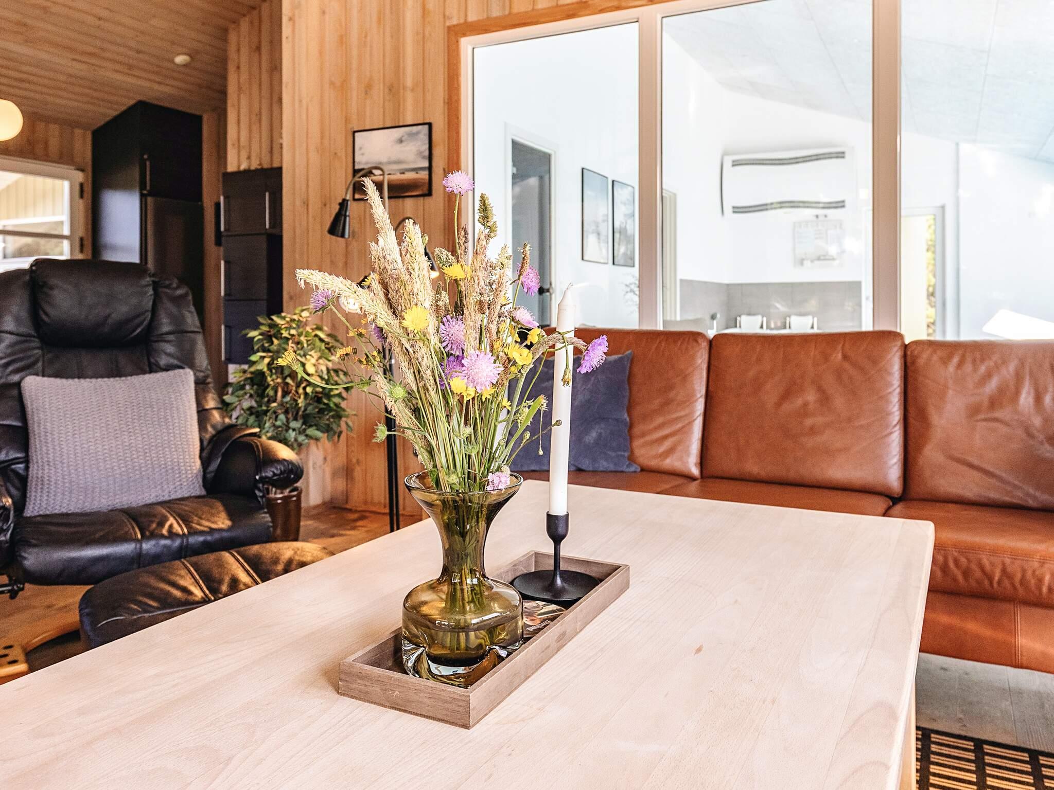 Opholdsstuen har brændeovn. Selvfølgelig er huset også udstyret med både tv med chromecast, radio og stereoanlæg.