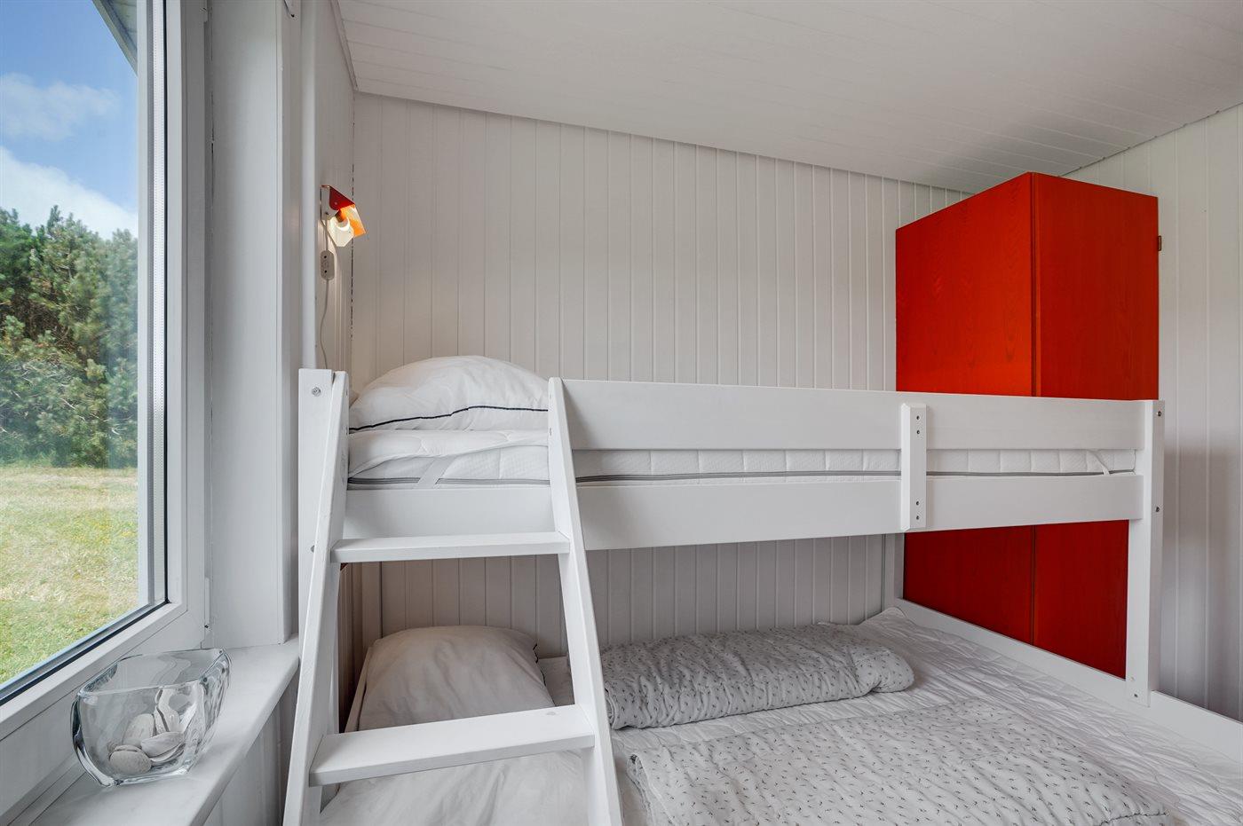Der er i alt 2 soveværelser. Sovepladserne fordeler sig på: 2 sovepladser i dobbeltseng. 3 sovepladser i køjesenge. Der er tale om en norsk køjeseng (140 x 200 cm forneden og 90/200 foroven). Den øverste køjeplads er derfor bedst egnet til større børn.