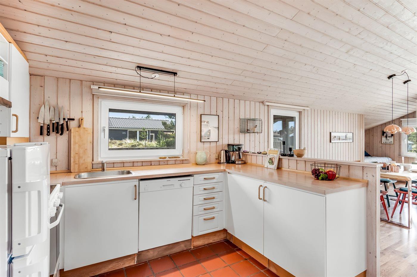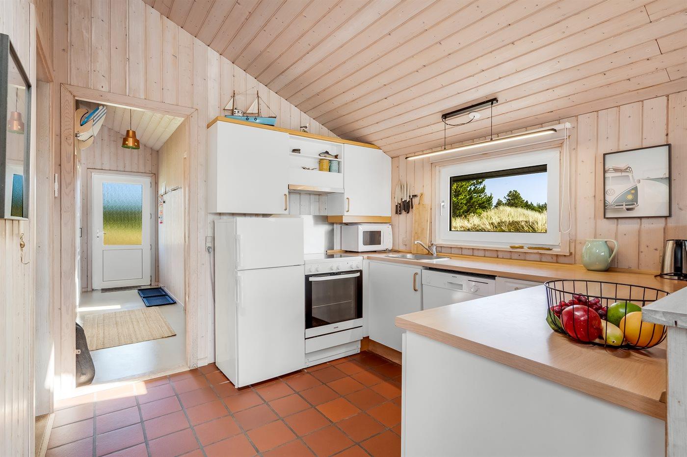 Køkkenet er udstyret med 1 køleskab. Der er 4 elkogeplader, bageovn, mikrobølgeovn samt opvaskemaskine.