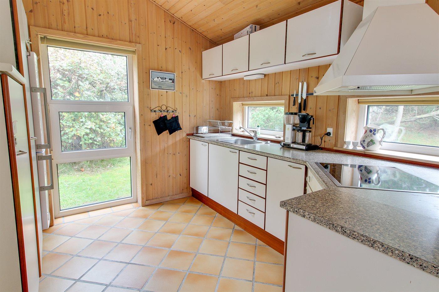 Køkkenet er udstyret med 1 køleskab. Der er 4 keramiske kogeplader. Der findes komfur med opvaskemaskine, varmluftovn, mikrobølgeovn samt opvaskemaskine.