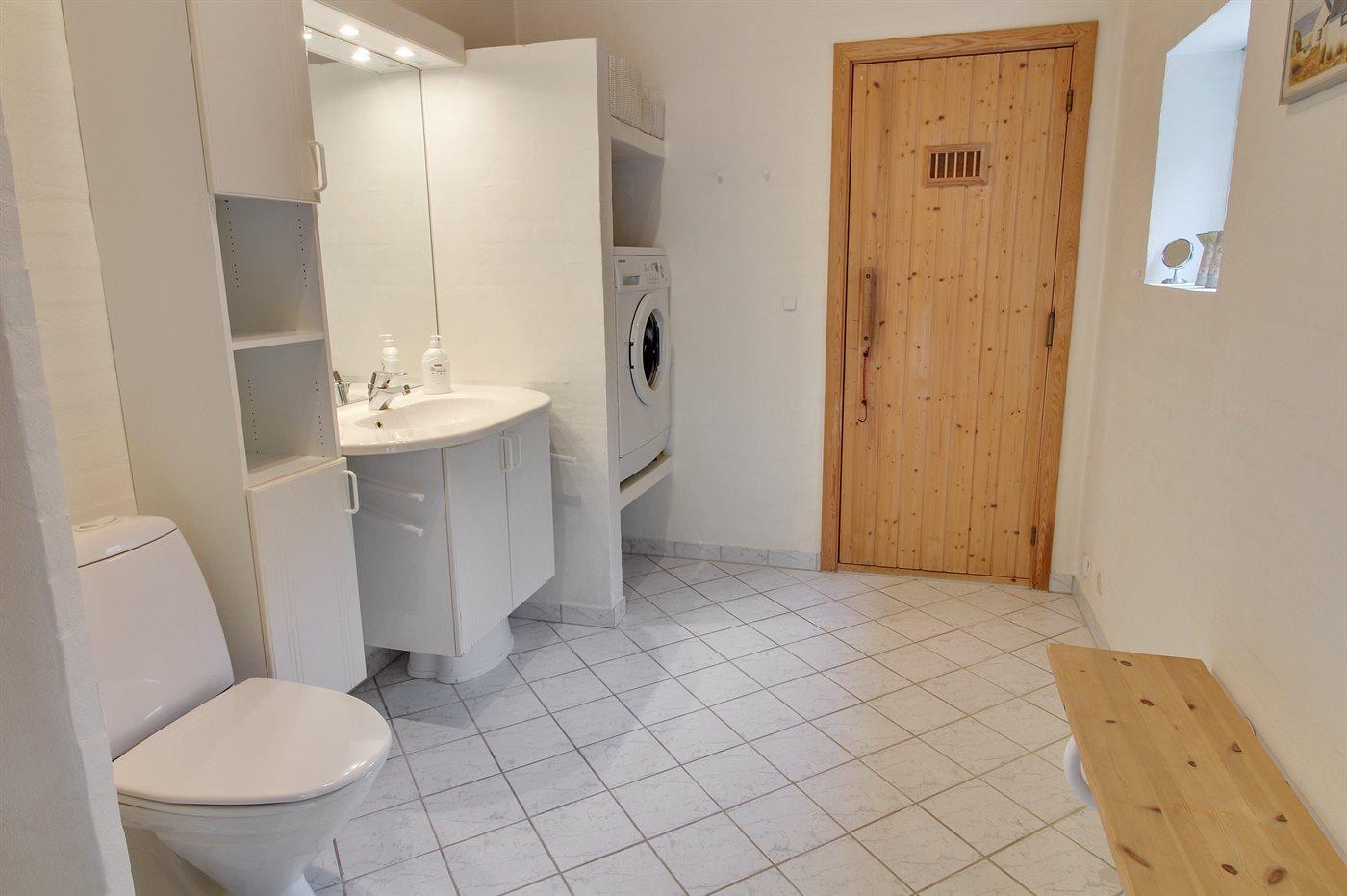 Der er 1 badeværelse med bruseniche og 1 toilet.. Der er gulvvarme på 1 badeværelse. I saunaen er der mulighed for afslapning.