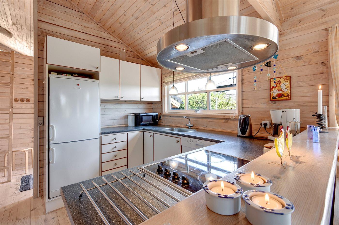 Køkkenet er udstyret med 1 køleskab. Der er 4 keramiske kogeplader, varmluftovn, mikrobølgeovn samt opvaskemaskine.