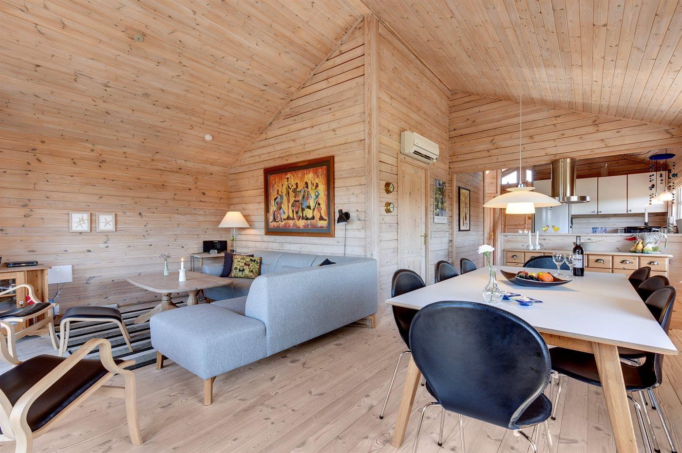 For enden af en blind vej på en rolig klithede-grund ligger dette hyggelige bjælkehus. Huset er bygget af naturmaterialer og har overalt smukke lyse fyrretræsgulve.