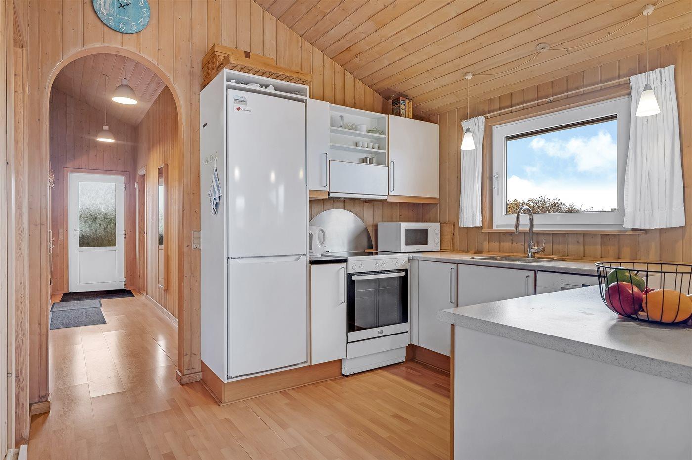 Køkkenet er udstyret med 1 køleskab. Der er 4 induktionskogeplader, varmluftovn, mikrobølgeovn samt opvaskemaskine.