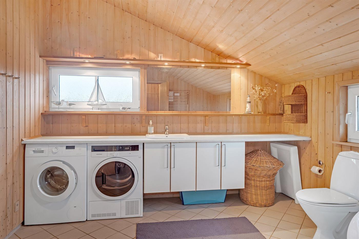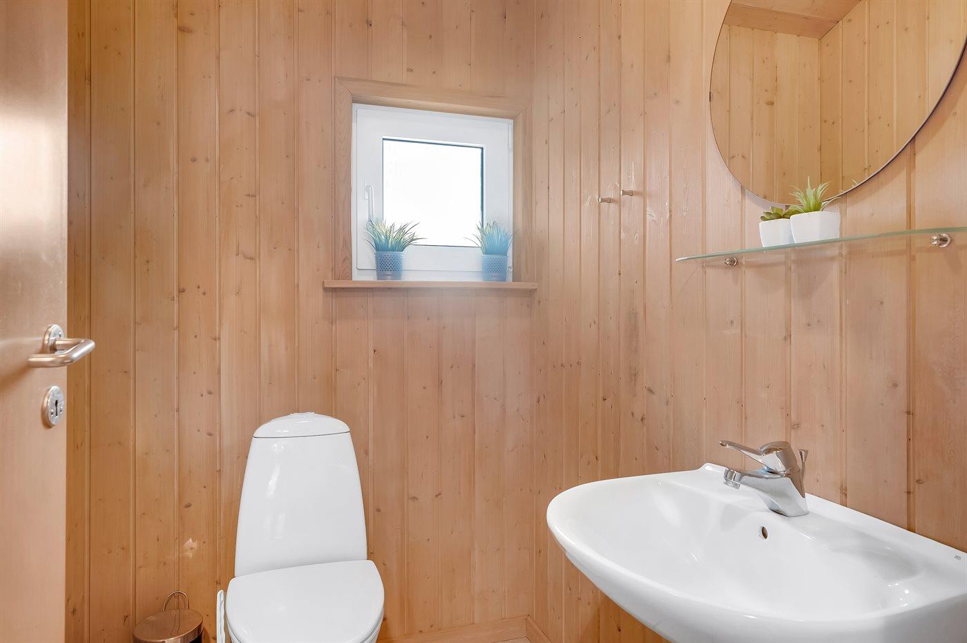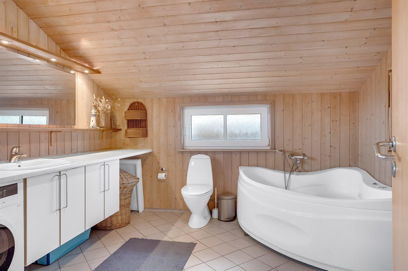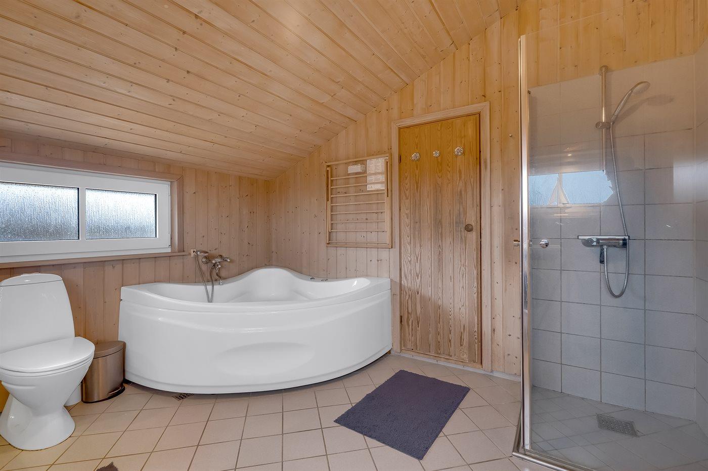 Der er 1 badeværelse med bruseniche og 2 toiletter, heraf 1 gæstetoilet. Der er gulvvarme på 1 badeværelse. Der er gulvvarme på gæstetoilettet. I saunaen er der mulighed for afslapning.
