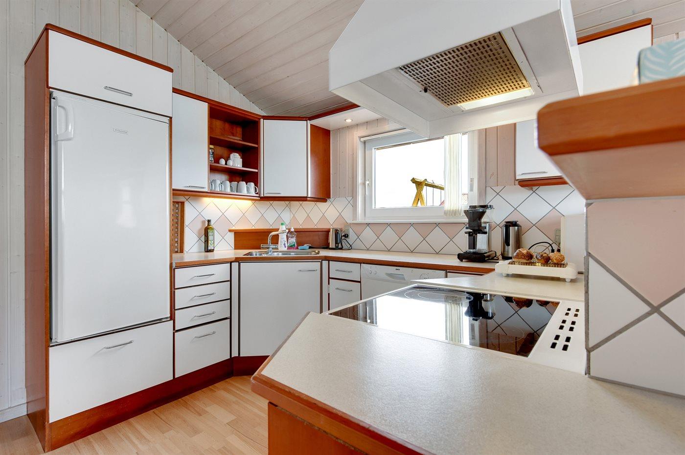 Køkkenet er udstyret med 1 køleskab. Der er 4 keramiske kogeplader, varmluftovn, mikrobølgeovn samt opvaskemaskine.