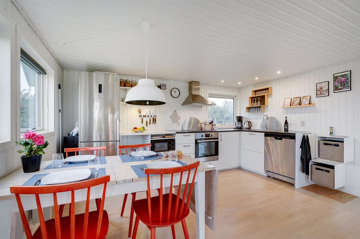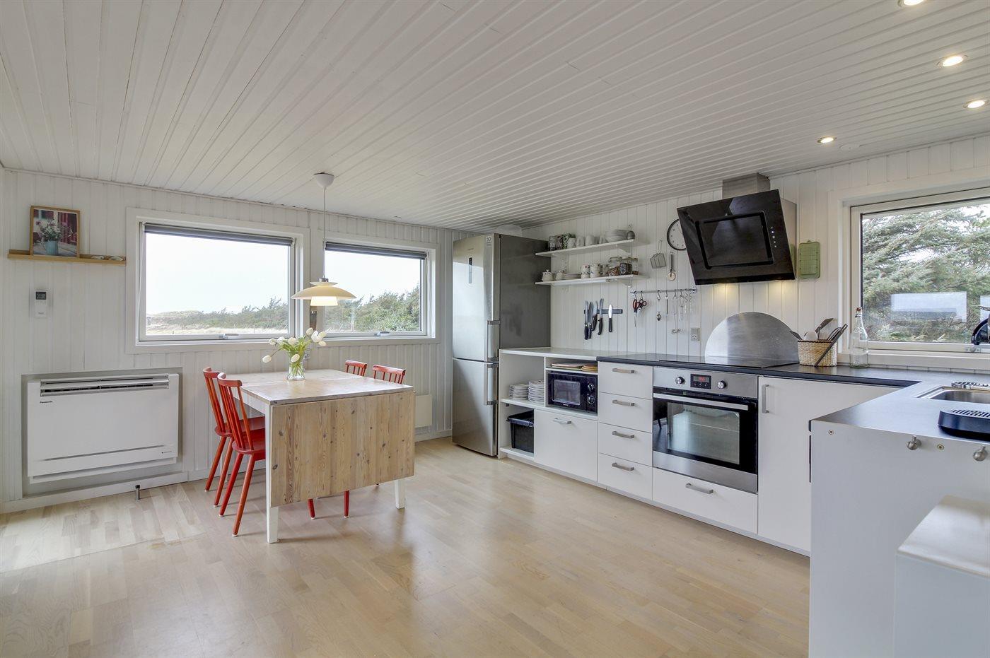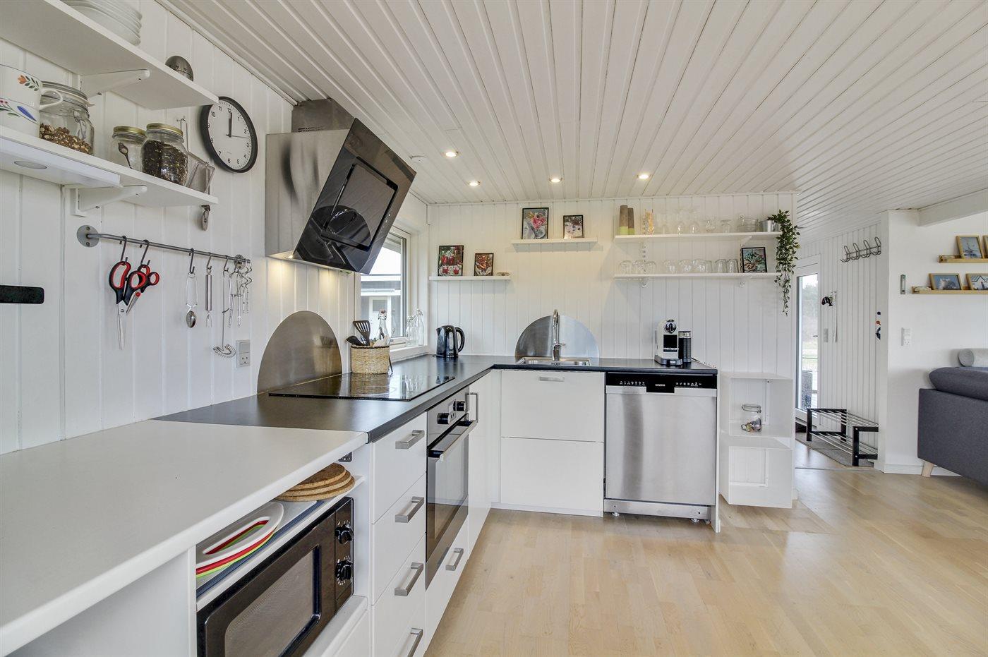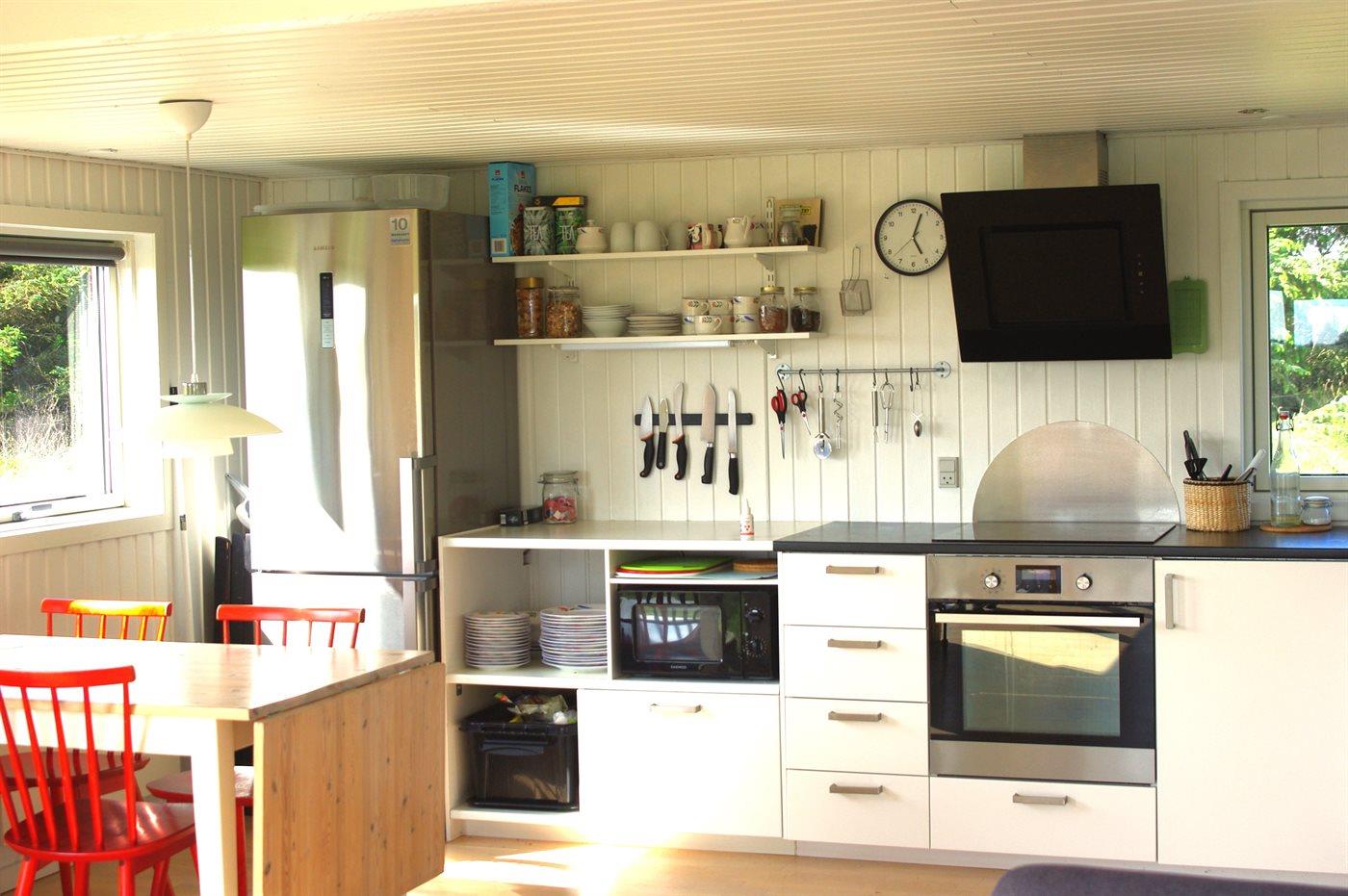 Køkkenet er udstyret med 1 køleskab. Der er 4 keramiske kogeplader, varmluftovn, mikrobølgeovn samt opvaskemaskine.