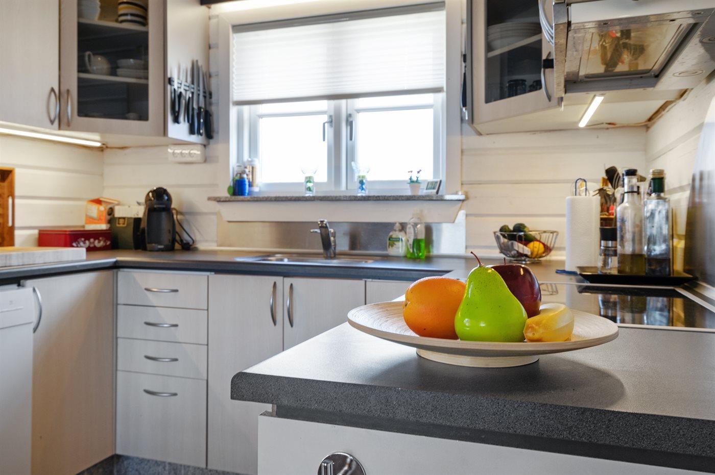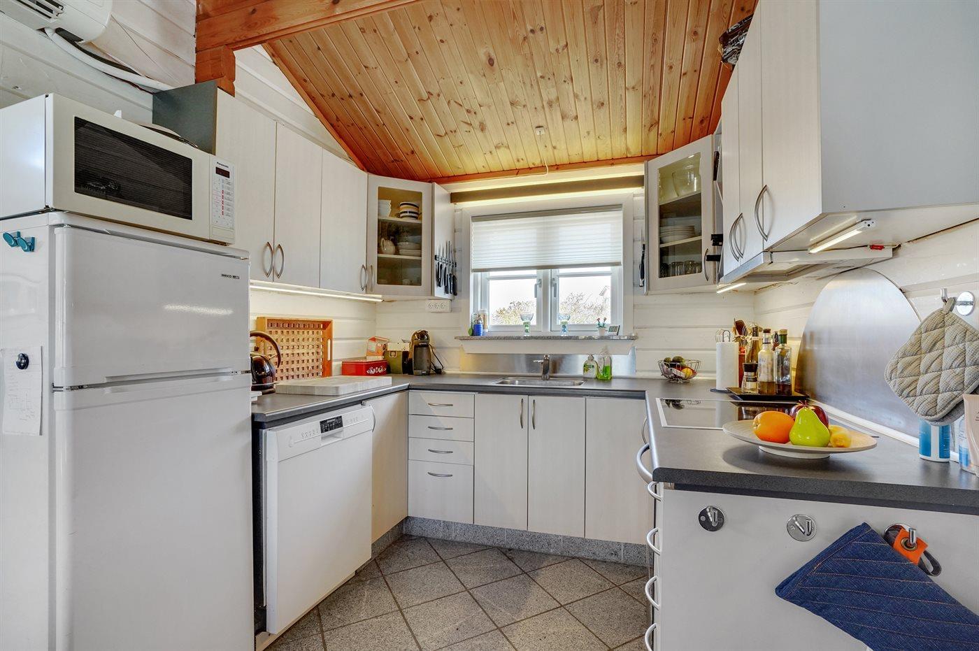 Køkkenet er udstyret med 1 køleskab. Der er 4 induktionskogeplader, varmluftovn, mikrobølgeovn samt opvaskemaskine Der er gulvvarme i køkkenet.