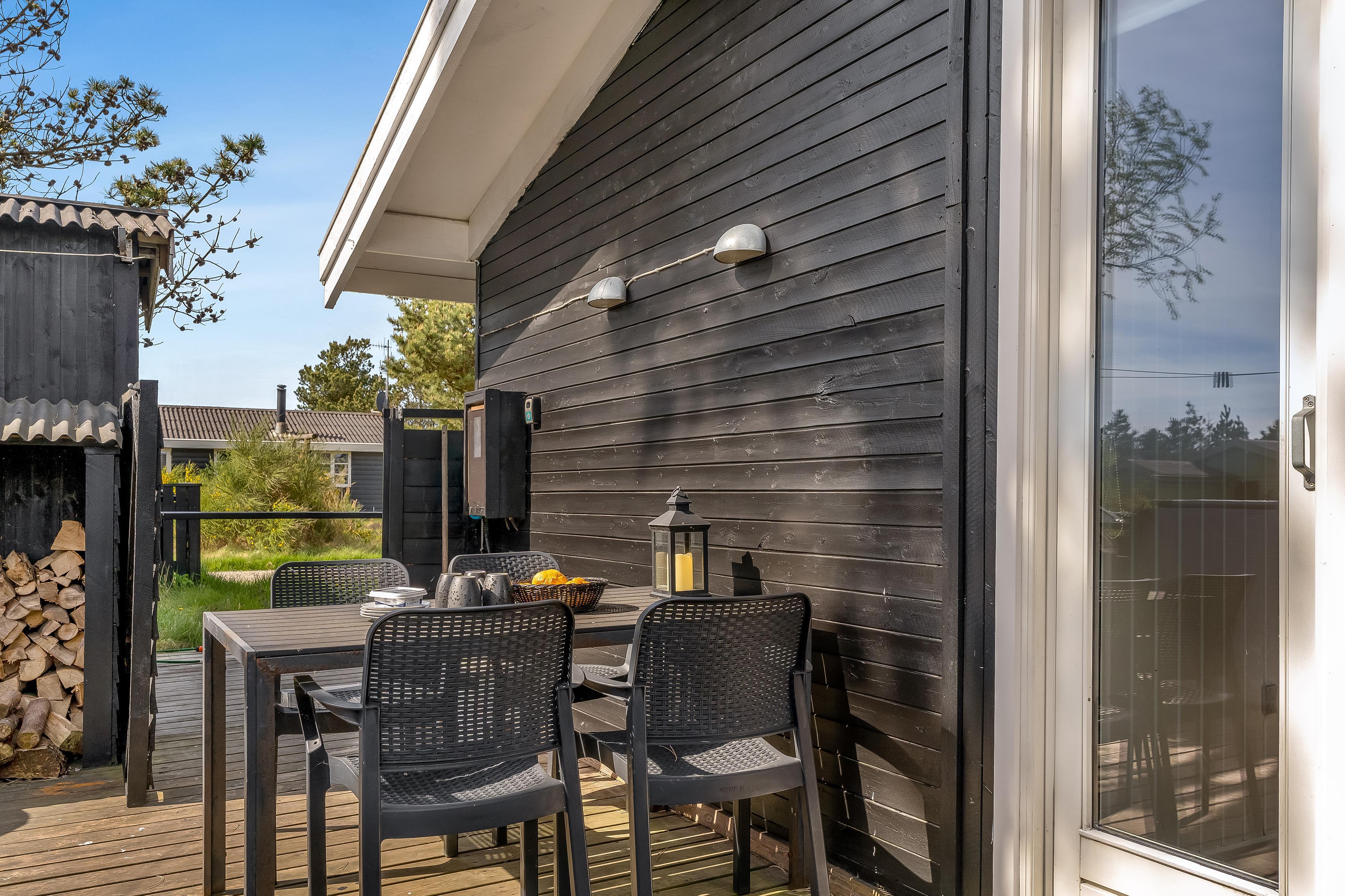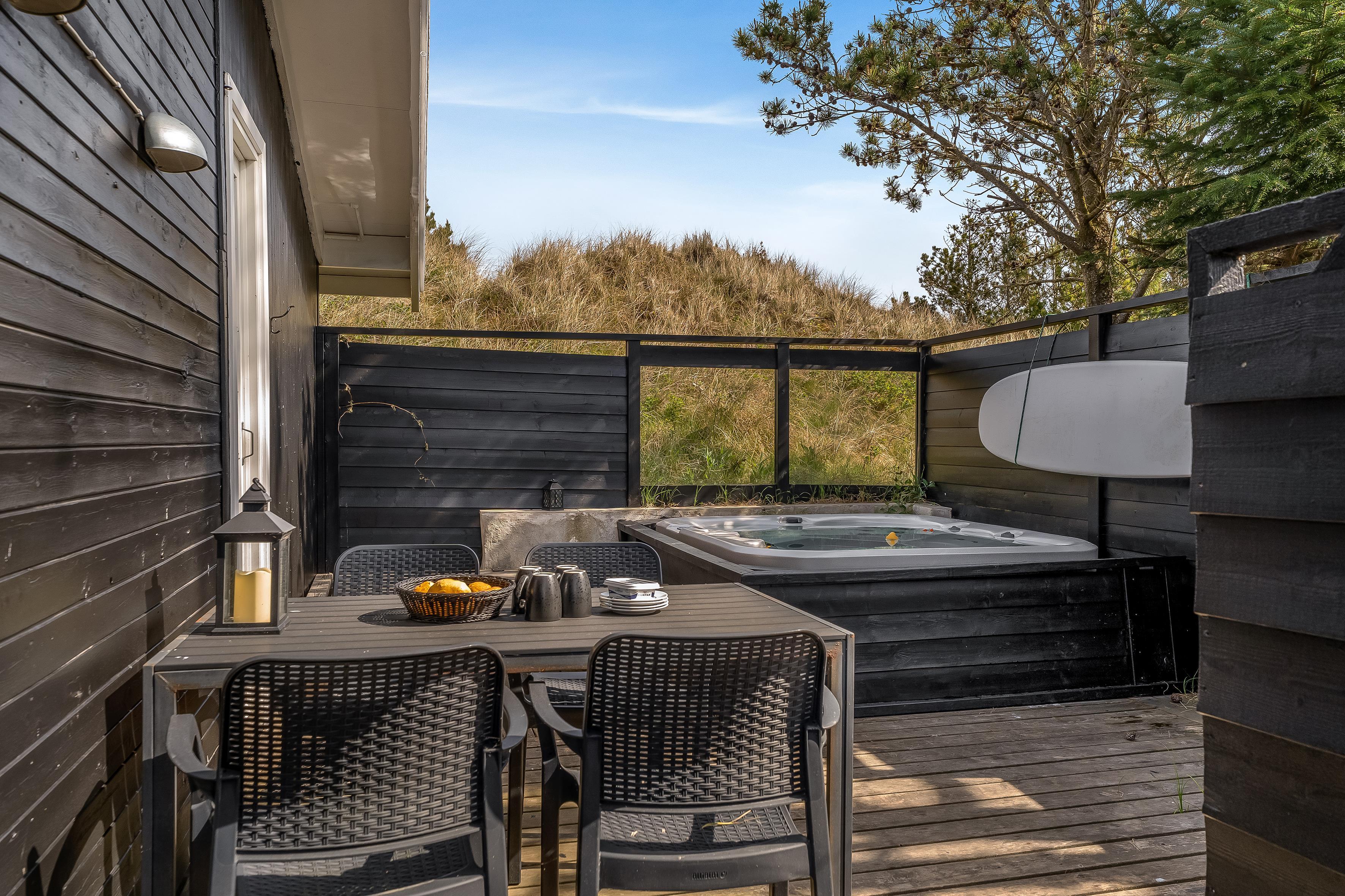 Udenfor kan du nyde en lukket terrasse, der giver mulighed for privatliv og afslapning. Her kan du slappe af i udendørsspaen, der har plads til op til 5 personer, hvilket gør det til et perfekt sted at forkæle sig selv efter en dag fyldt med aktiviteter. Den store naturgrund på 400 kvadratmeter giver masser af plads til leg og aktiviteter, og der er endda en udebruser til at skylle sand og salt af efter en dag ved vandet.