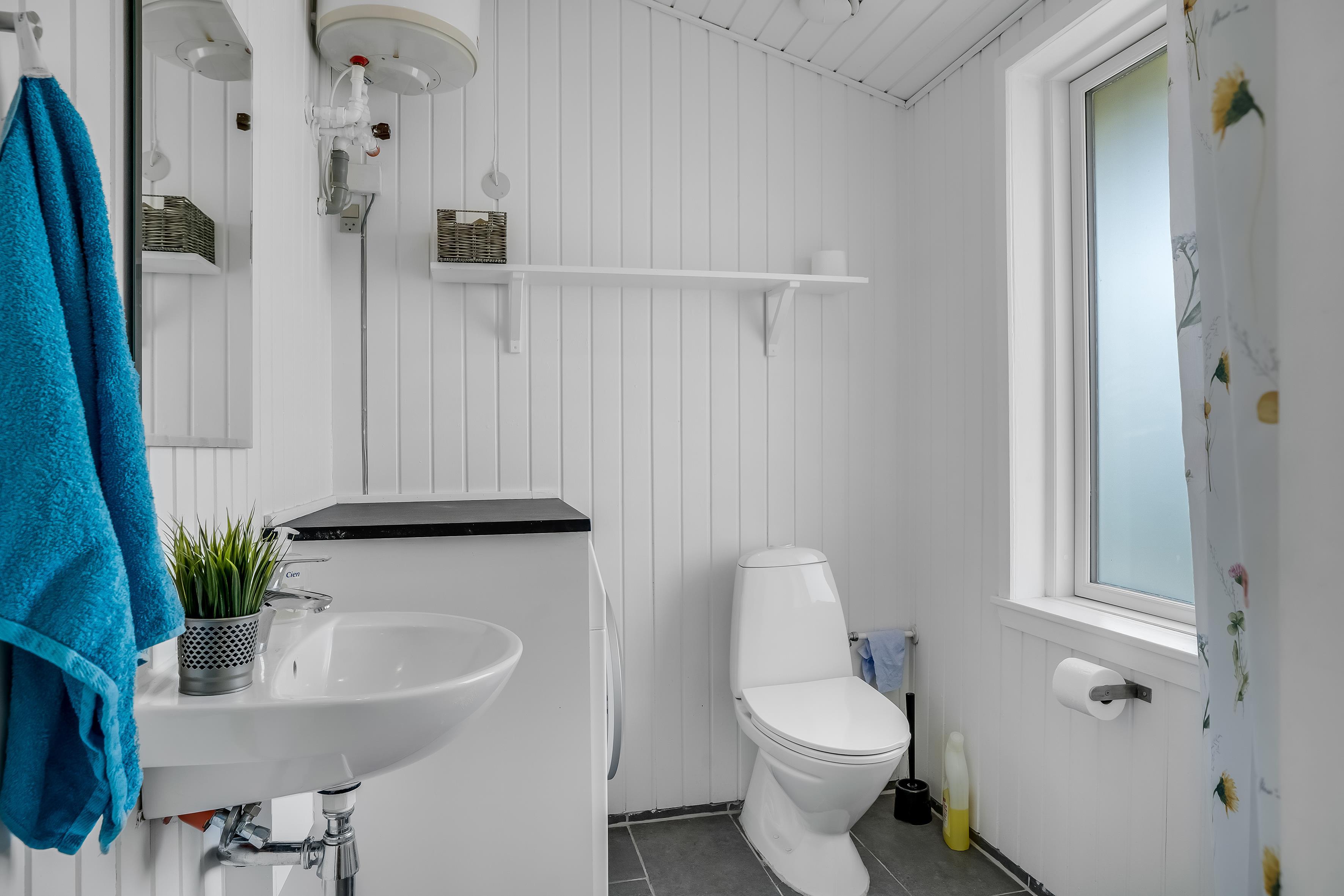Badeværelset er udstyret med både toilet, bruser og gulvvarme, hvilket sikrer en behagelig oplevelse, selv på de koldeste dage. Yderligere faciliteter inkluderer en vaskemaskine, barneseng og barnestol, så familier med små børn nemt kan føle sig hjemme.
