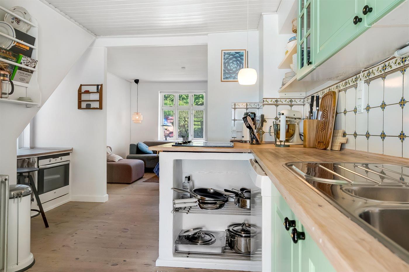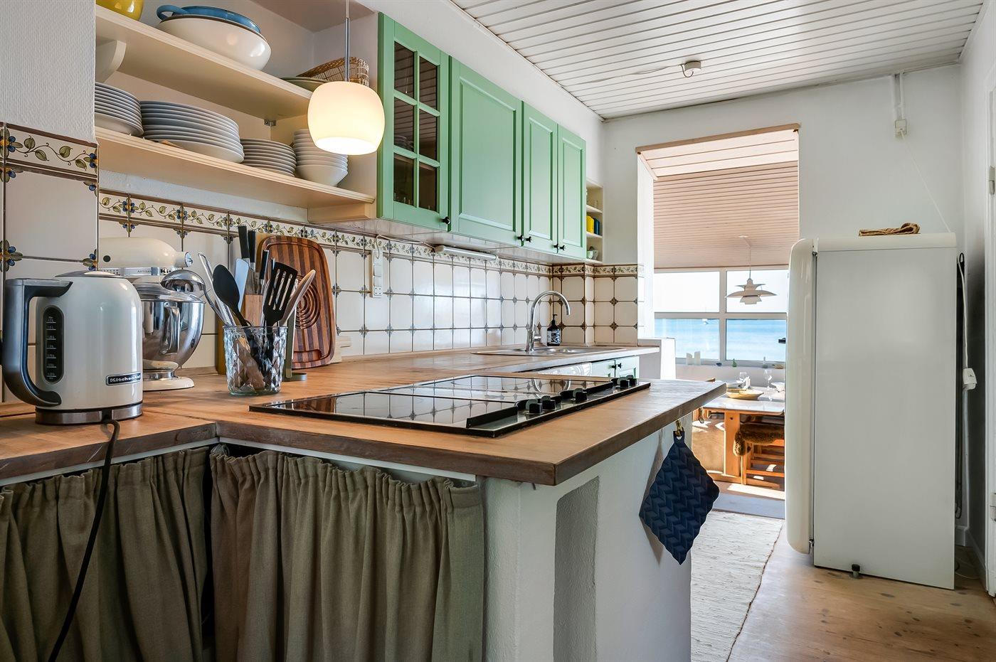 Køkkenet er udstyret med 1 køleskab. Der er 4 keramiske kogeplader, varmluftovn samt opvaskemaskine.